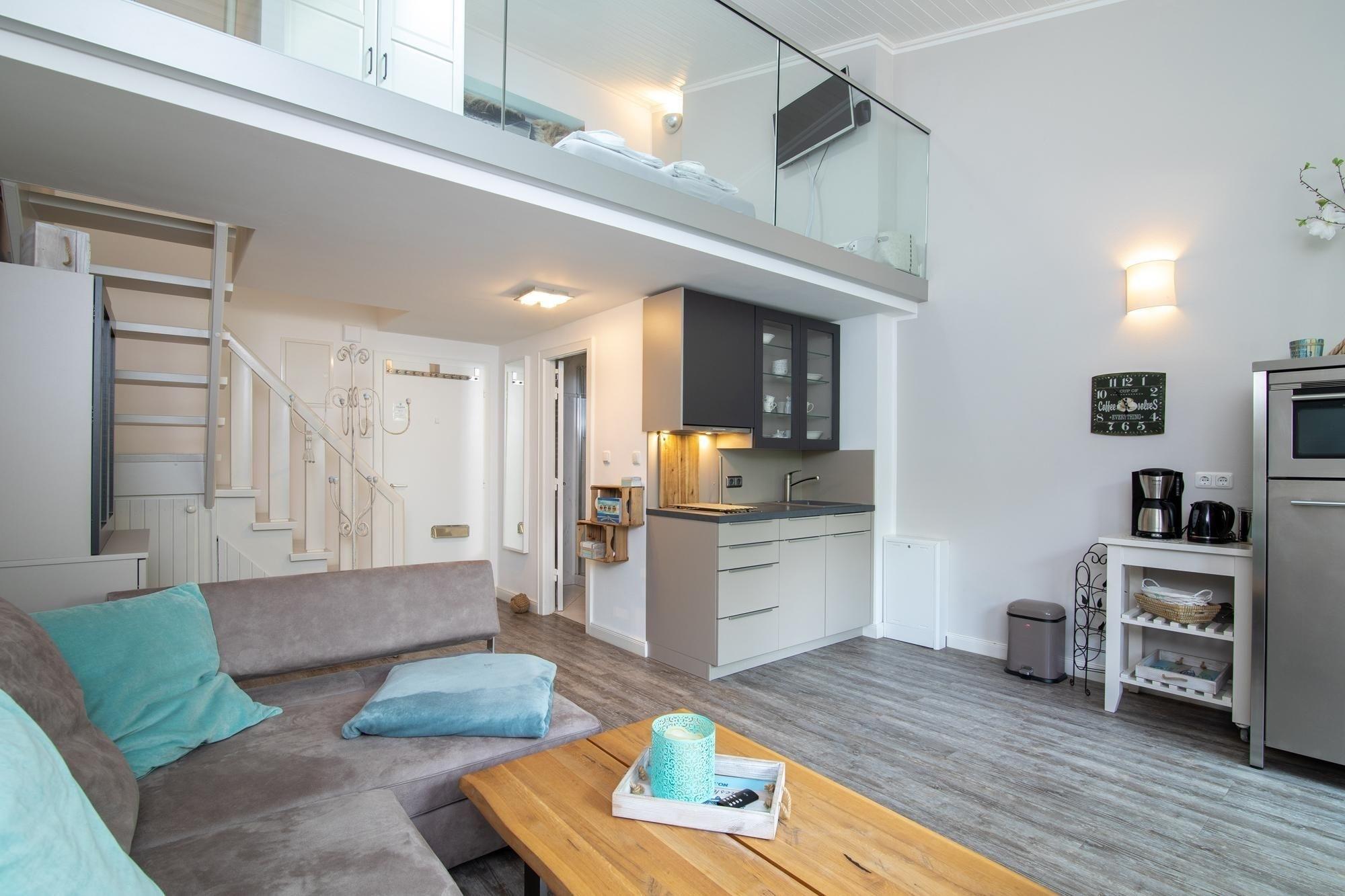 Die geschmackvolle Galeriewohnung besticht durch ihre hochwertige und stilvolle Einrichtung. Verteilt auf zwei Ebenen und mit einer Wohnfläche von ca. 43 m² versprüht das top-moderne Appartement eine lichtdurchflutete Wohlfühl-Atmosphäre und bietet reichlich Platz für bis zu 2 Erwachsene und 1 Baby - Komfort und Erholung von der ersten Minute an. Der Wohnbereich ist mit einer gemütlichen Sofalandschaft und Flat-TV ausgestattet. Die angrenzende offene Küche bietet alles, was man für einen gelungenen Kochabend braucht. Eine Treppe führt nach oben in den offen gestalteten Galerie-Schlafbereich mit einem komfortablen Doppelbett (2x 80x200 cm) und einem weiteren Flat-TV. Auf dem idyllischen Süd-West-Balkon genießen Sie Ihren Morgenkaffee oder ein erfrischendes Glas Wein am Abend.