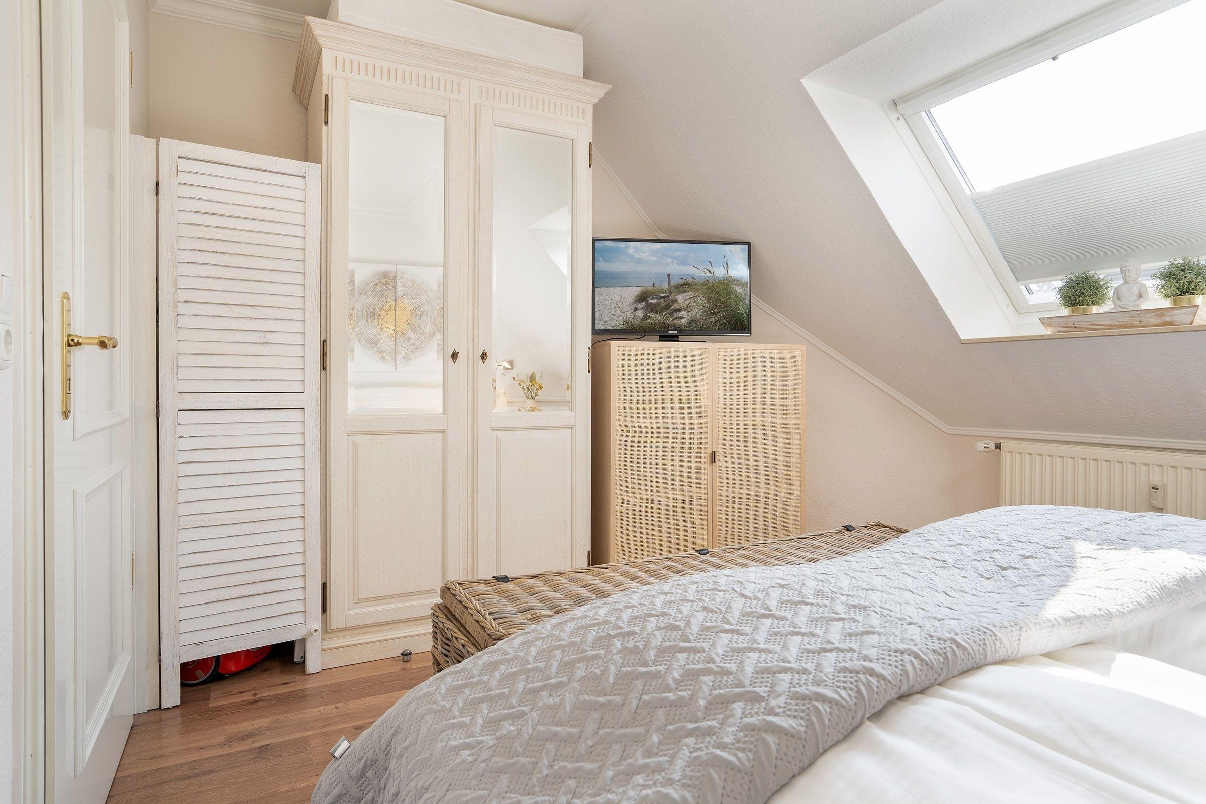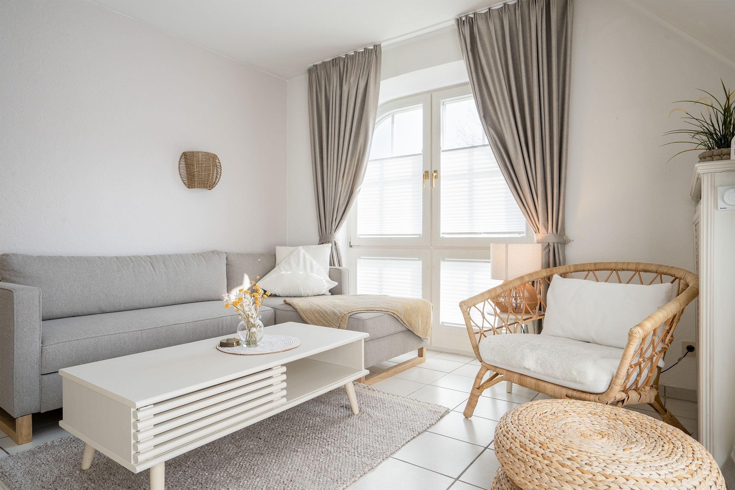 Ein kleiner Flur mit Garderobe empfängt Sie. Ihre Koffer können Sie erst einmal in das Schlafzimmer stellen. Das kuschelige Schlafzimmer ist mit einem Doppelbett (2x90x200 cm), Nachttischen, Kleiderschrank und Fernseher eingerichtet. Ein Verdunkelungsplissee schützt vor den ersten Lichtstrahlen am Morgen. Links daneben ist das Duschbad mit Spiegelschrank und Föhn. Der geschmackvoll eingerichtete Wohnraum ist ideal aufgeteilt. Die Küche ist mit allem Komfort ausgestattet. Für den ersten Café Crema am Morgen, einen Cappuccino am Nachmittag auf dem Balkon oder einen Espresso nach dem Abendessen ... eine Senseo Pad-, oder eine Cafissimo Kapselmaschine stehen Ihnen hierfür zur Verfügung. Auf dem Balkon genießen Sie am Nachmittag die warmen Sonnenstrahlen, eine elektrische Markise sorgt für Sonnenschutz, die Balkontür ist mit einem Insektenschutz ausgestattet. Machen Sie es sich gemütlich nach einem langen Strandspaziergang auf dem Sofa. Das Sofa lässt sich zu einer bequemen Schlafgelegenheit (135x200 cm) umwandeln. Wettervorhersagen, Veranstaltungstipps oder mit Freunden Urlaubserlebnisse teilen – kostenfreies WLAN ist in diesem Feriendomizil für Sie vorhanden.