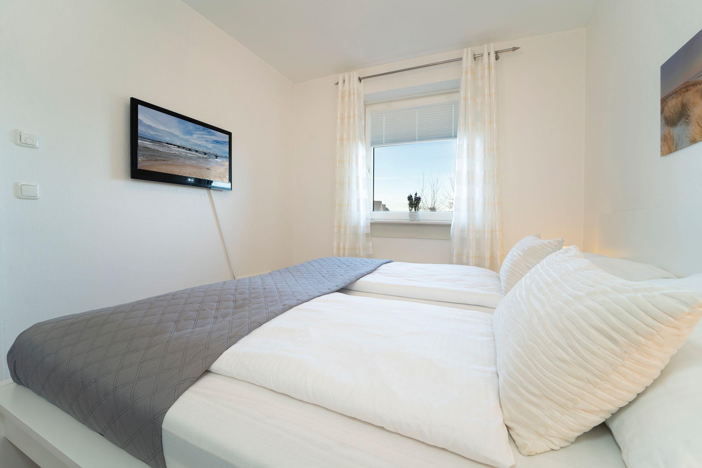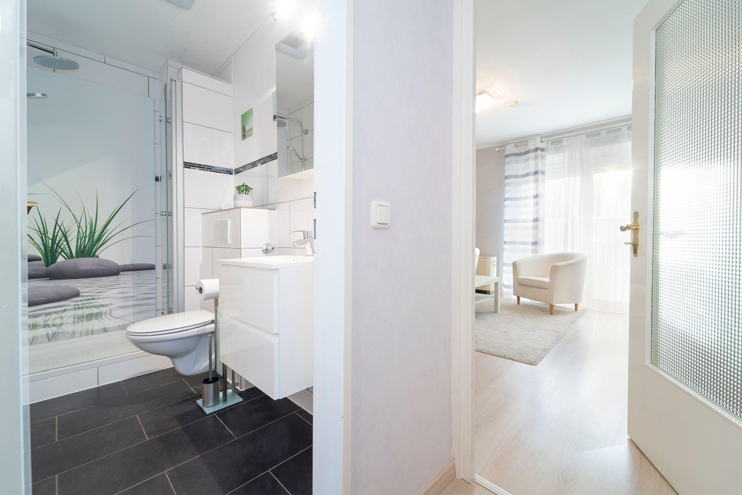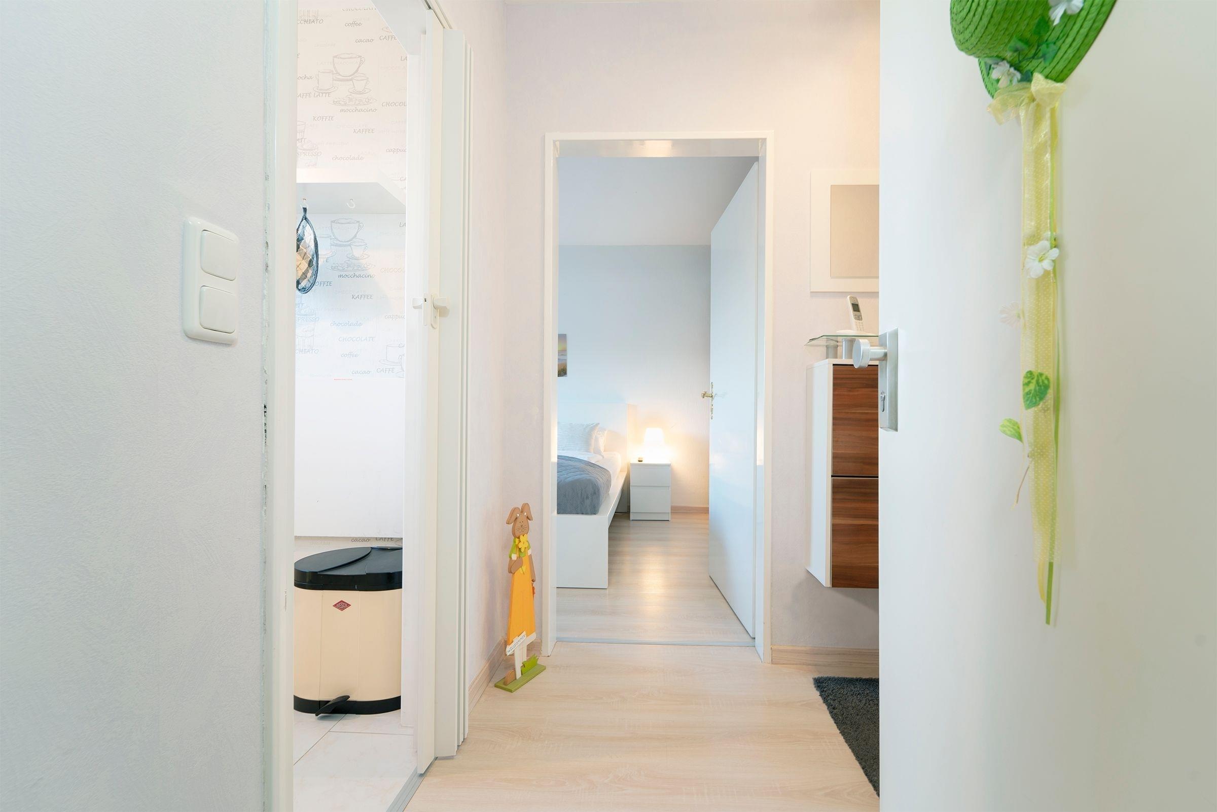 Alle Zimmer der Wohnung sind vom Flur aus erreichbar. Es erwartet Sie ein geschmackvoll modern eingerichtetes Wohn-, Schlafzimmer mit CD-Player, DVD-Player, TV, Radio, W-LAN Anschluss und einer komfortablen Schlafcouch (160x200 cm). Das separate Schlafzimmer verfügt über ein bequemes, großzügiges Doppelbett (180x200 cm). Zum Appartement gehört eine mit Kühlschrank, Gefrierfach, Backofen, Herd, Spülmaschine, Kaffeemaschine, Toaster und Wasserkocher ausgestattete Küche. Ebenso ein freundliches neu renoviertes Duschbad, das auch über einen Fön verfügt.