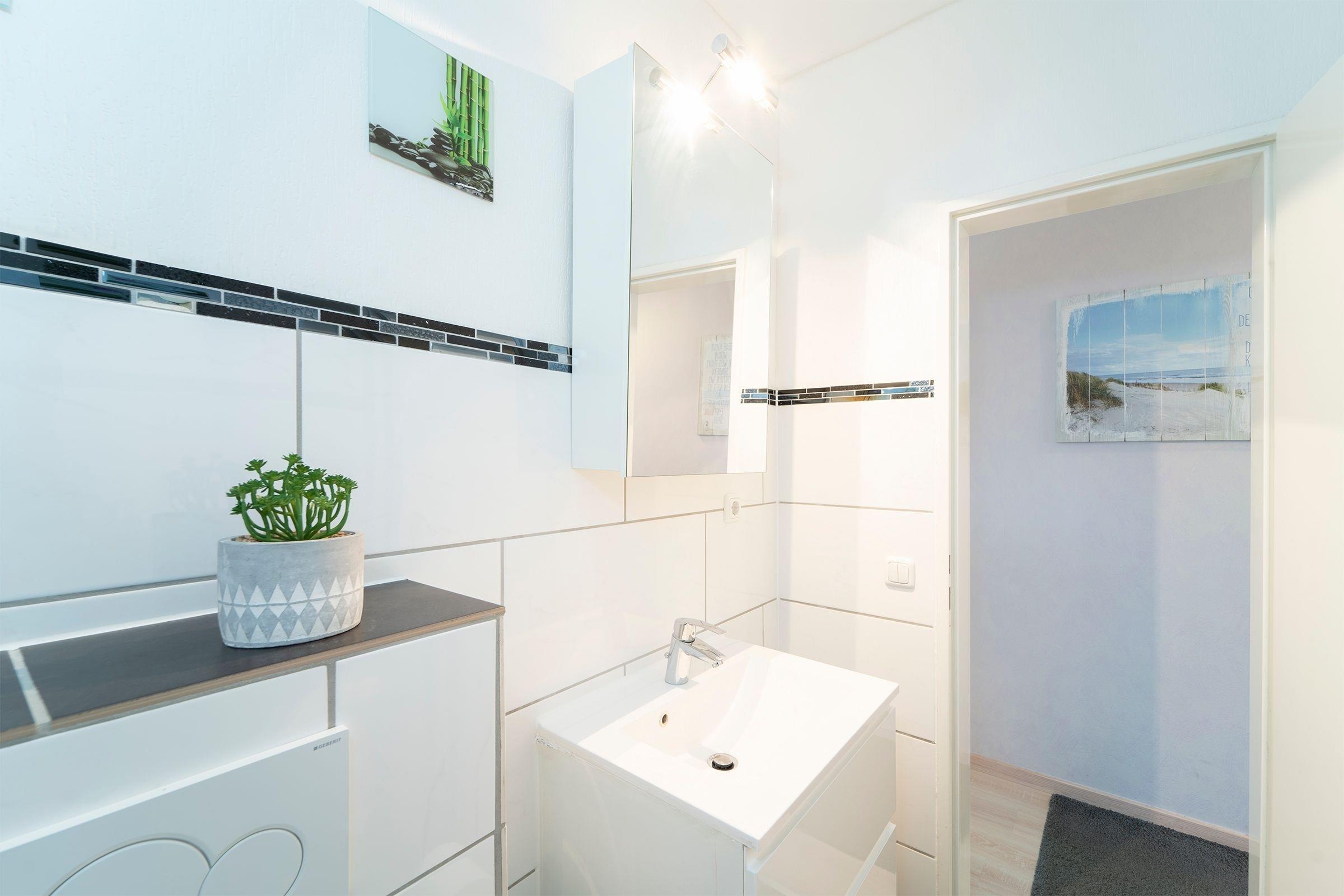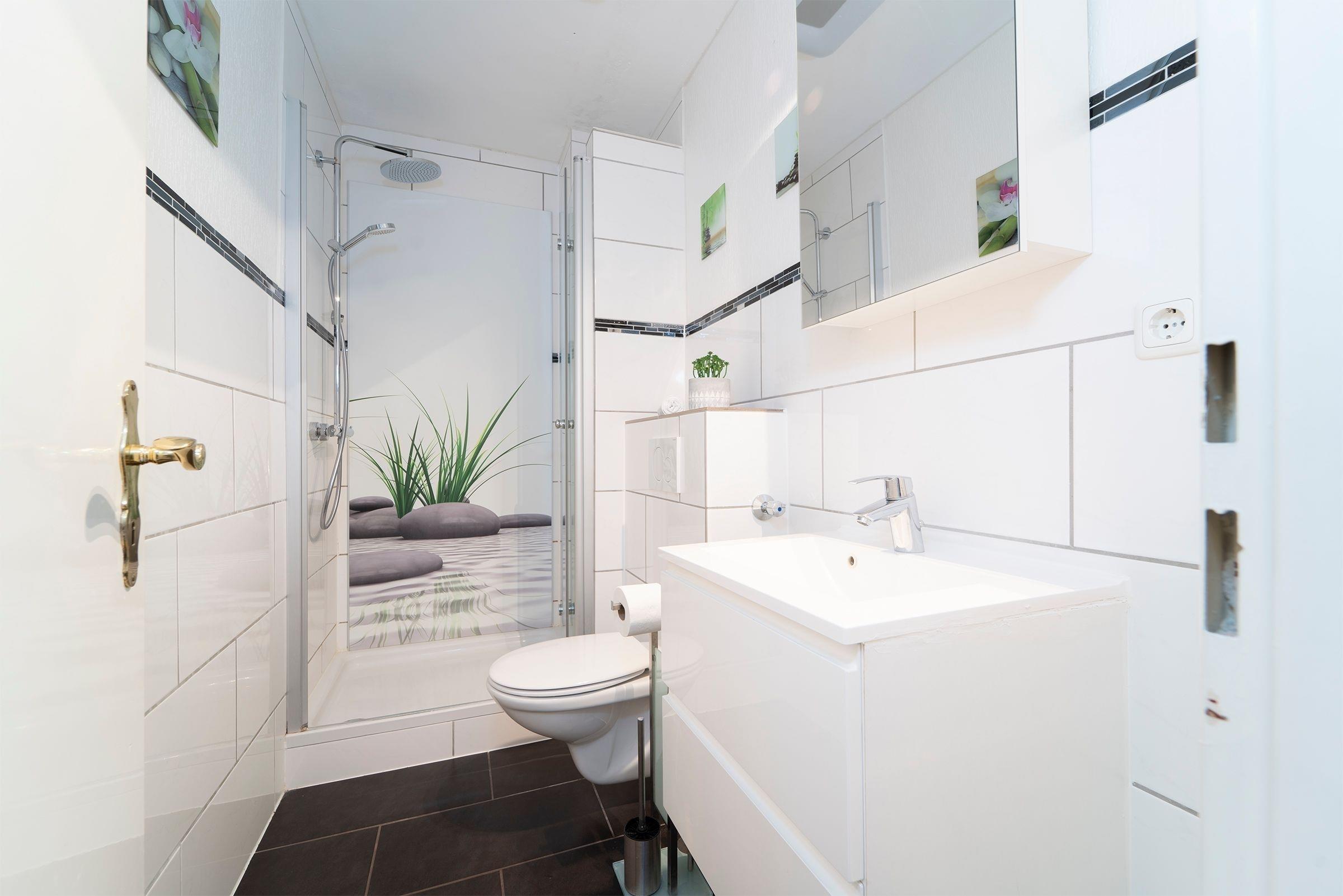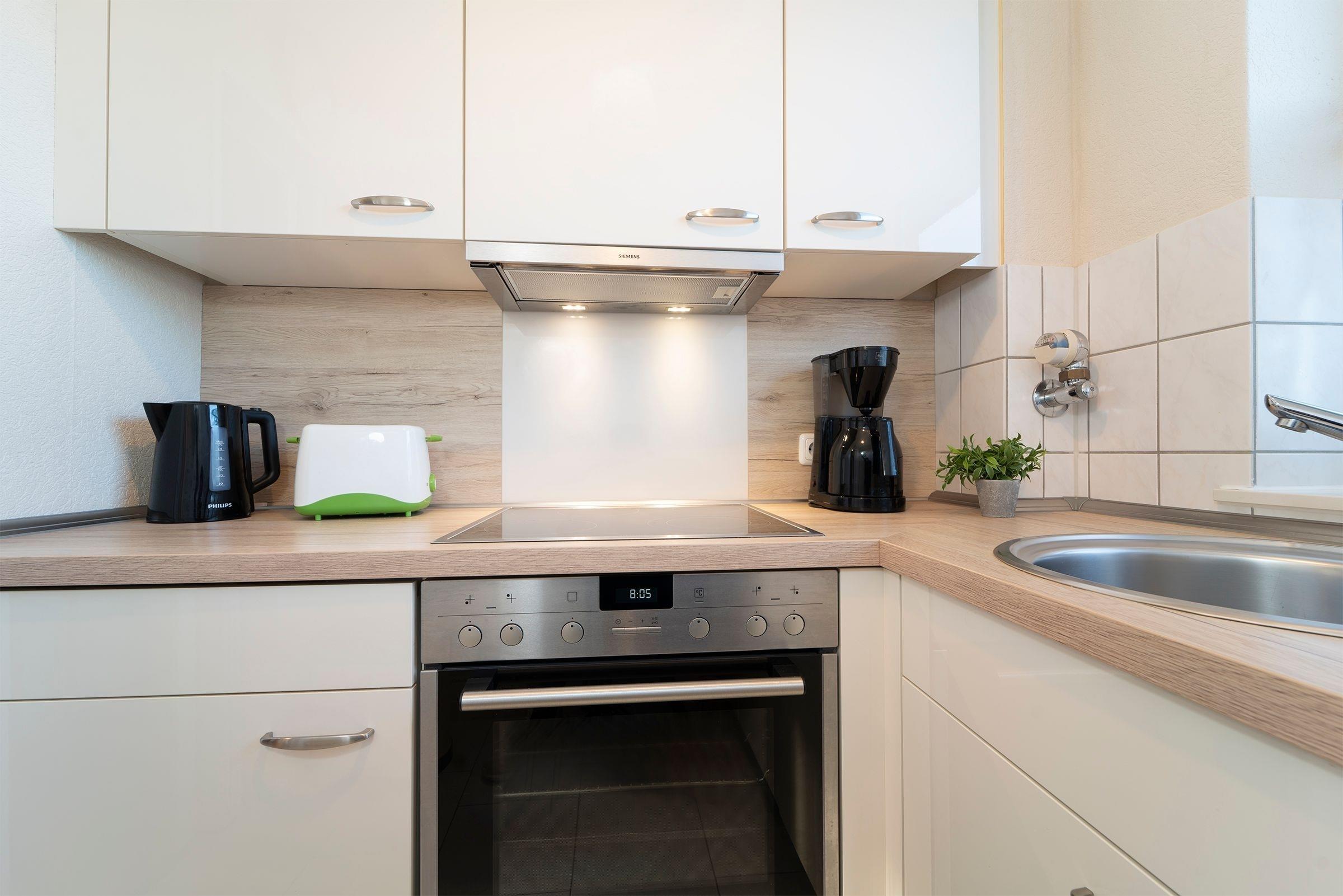 Alle Zimmer der Wohnung sind vom Flur aus erreichbar. Es erwartet Sie ein geschmackvoll modern eingerichtetes Wohn-, Schlafzimmer mit CD-Player, DVD-Player, TV, Radio, W-LAN Anschluss und einer komfortablen Schlafcouch (160x200 cm). Das separate Schlafzimmer verfügt über ein bequemes, großzügiges Doppelbett (180x200 cm). Zum Appartement gehört eine mit Kühlschrank, Gefrierfach, Backofen, Herd, Spülmaschine, Kaffeemaschine, Toaster und Wasserkocher ausgestattete Küche. Ebenso ein freundliches neu renoviertes Duschbad, das auch über einen Fön verfügt.