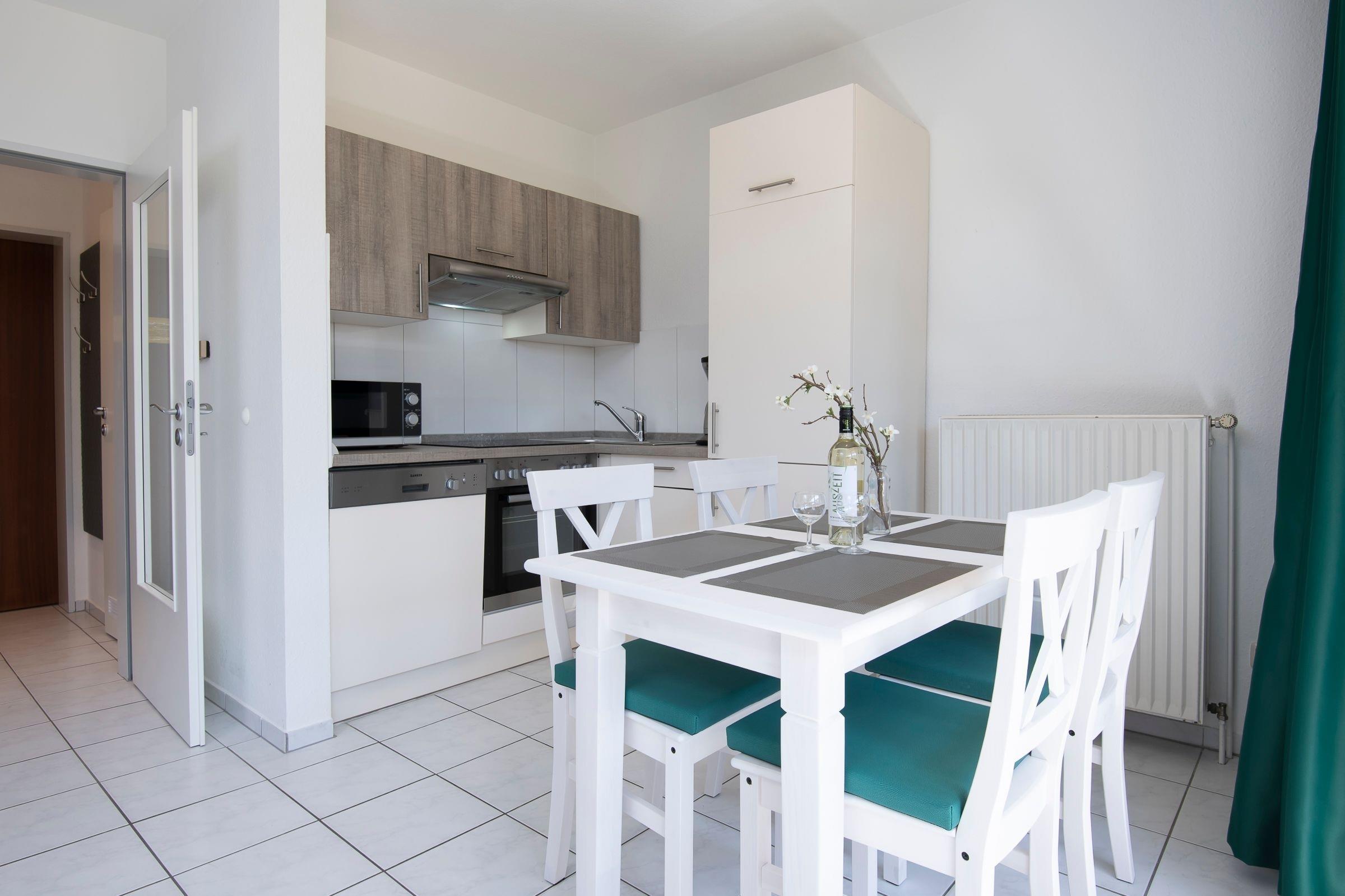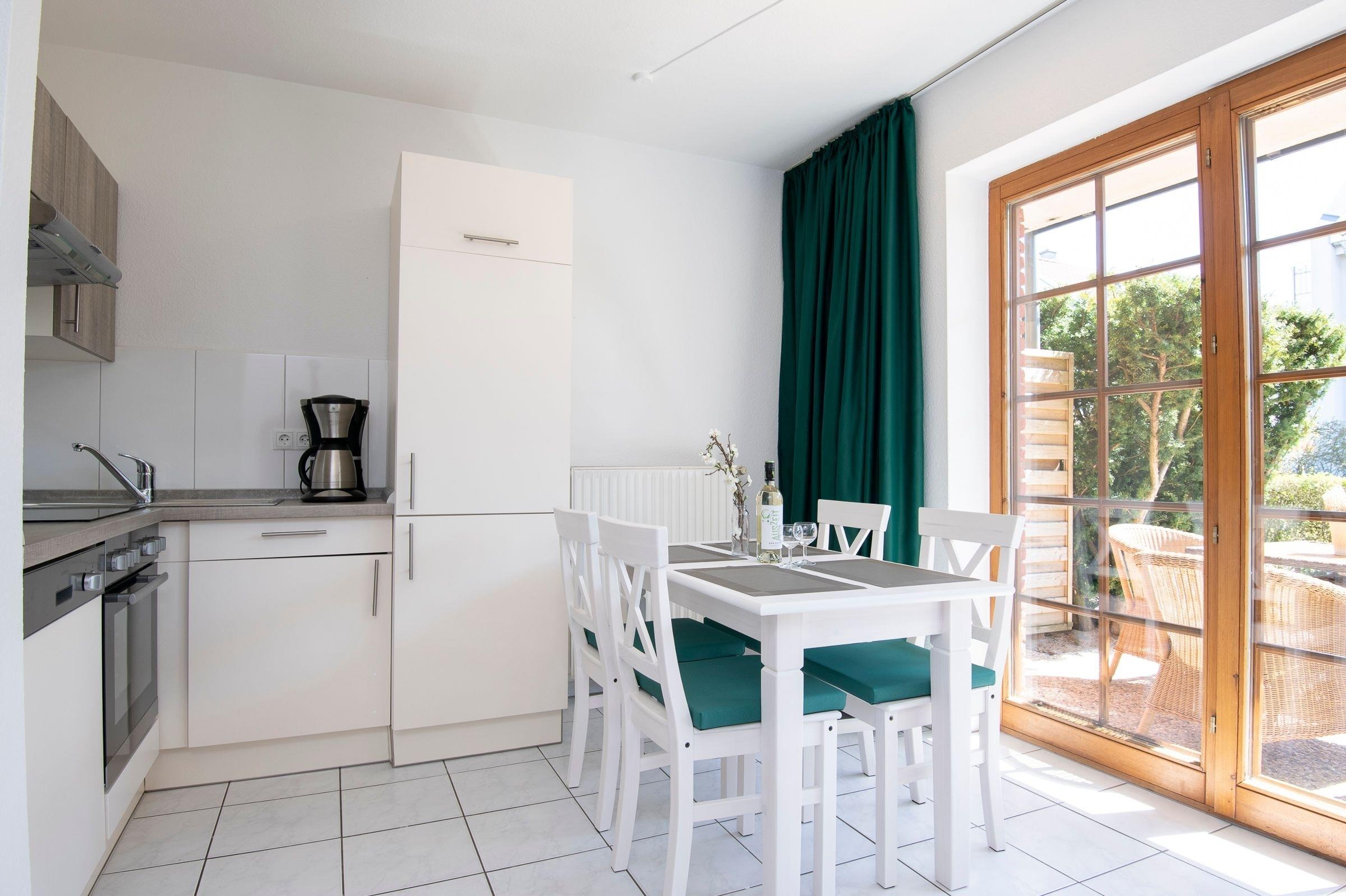 Auf 2 Zimmer verteilen sich hier das Schlafzimmer mit 2 Einzelbetten und das helle Wohnzimmer im Landhausstil mit gemütlicher Schlafcouch, angrenzender offener Küche und Essbereich. Für Unterhaltung sorgen ein TV und ein CD-Player. Vom Wohnzimmer haben Sie Zugang zu der großzügigen Terrasse mit Terrassenmöbeln. Hier genießen Sie Ihren Morgenkaffee während Ihnen die salzige Luft um die Nase weht. Die Küche ist voll ausgestattet mit Backofen, Gefrierfach, Herd, Kaffeemaschine, Kühlschrank, Mikrowelle, Spülmaschine, Toaster und Wasserkocher. Das moderne Bad mit Dusche und Föhn rundet diese Ferienwohnung ab.