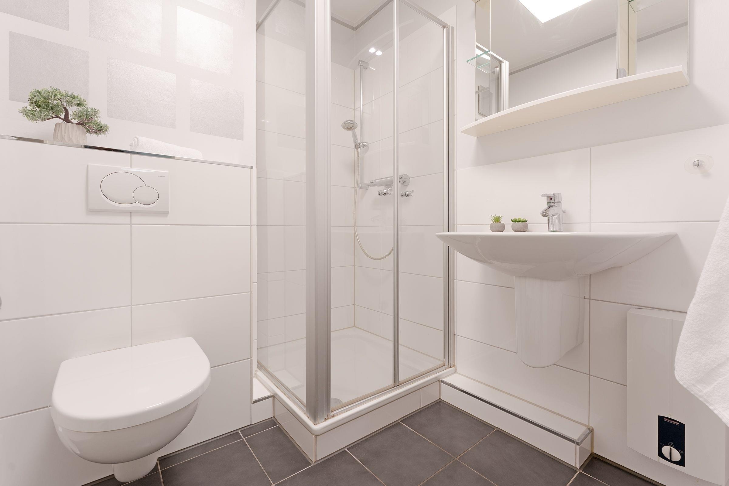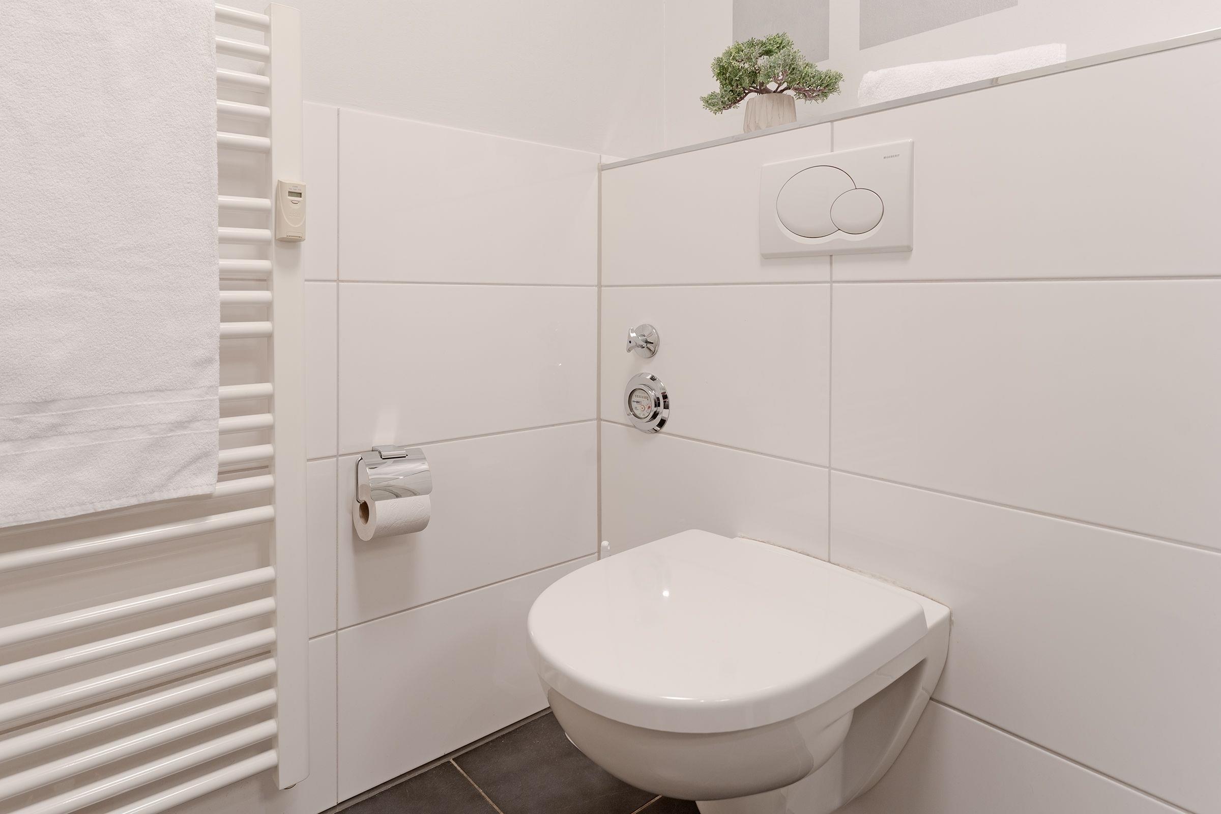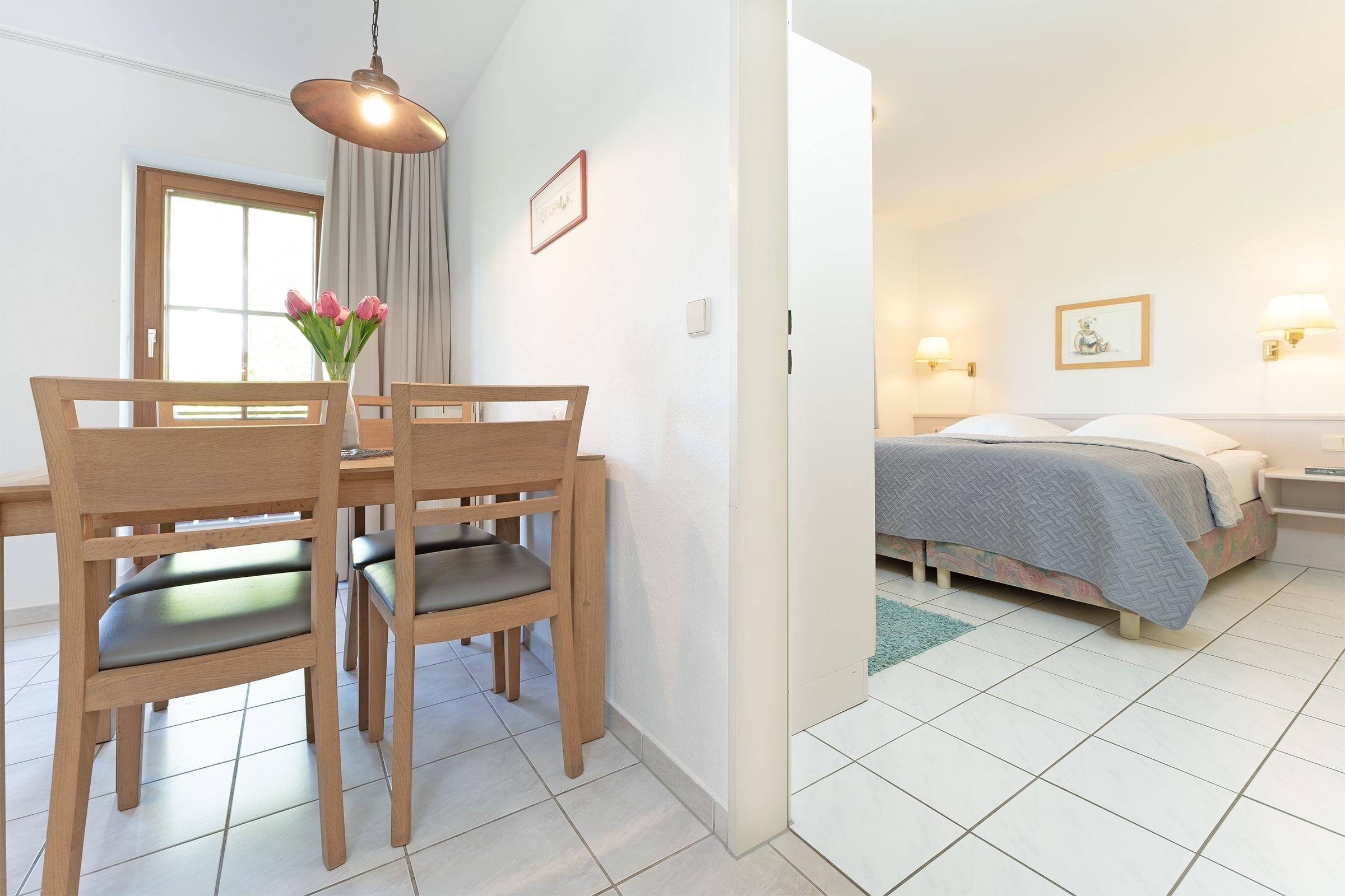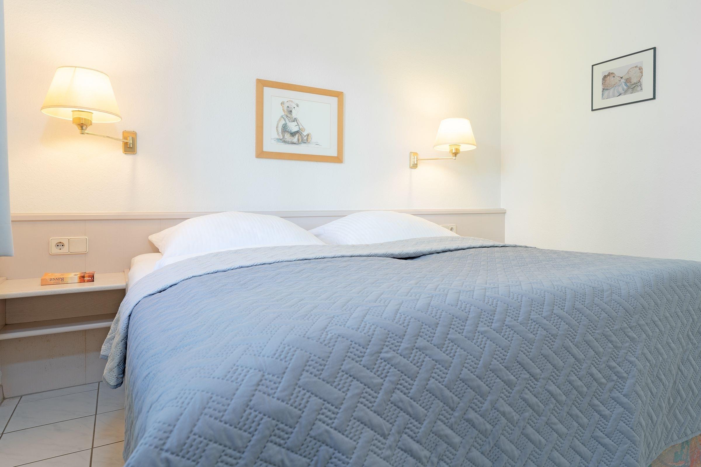 Es ist hell und modern eingerichtet. Das gesamte Appartement ist weiß gefliest. Schlafzimmer mit Doppelbett (2x 90x200 cm) und Radiowecker. Balkon in Süd-Westlage mit Gartenmöbeln. Im Wohnzimmer befinden sich eine komfortable Schlafcouch (150x200 cm) für 2 Personen, TV-Gerät mit Kabel-Empfang sowie der Essplatz. Die Fenster Im Schlafzimmer und im Wohnzimmer verfügen über spezielle Verdunkelungsgardinen. Die Küchenzeile ist ausgestattet mit: Cerankochfeld, Geschirrspülmaschine, Mikrowelle, Kaffeemaschine, Wasserkocher und Toaster. Modernes Duschbad/WC mit Fön. WLAN steht kostenfrei zur Verfügung.
