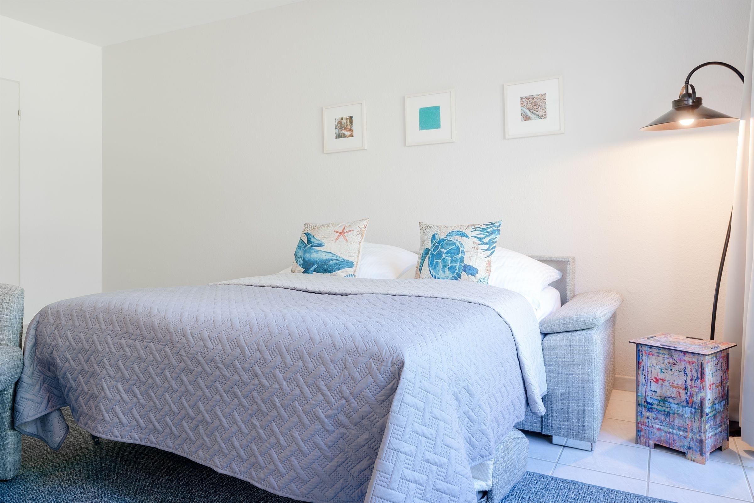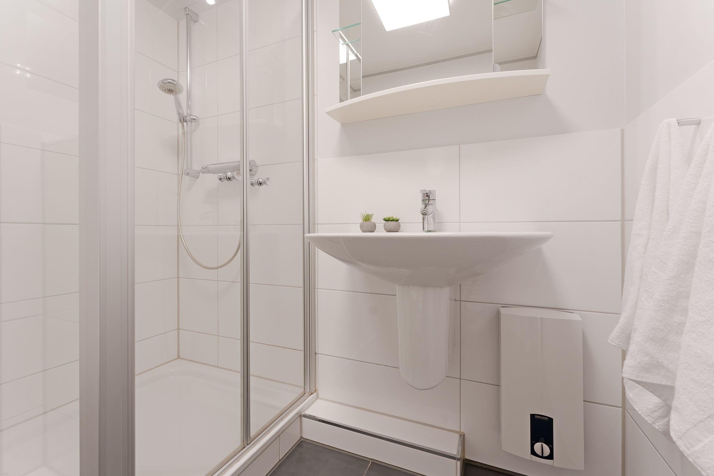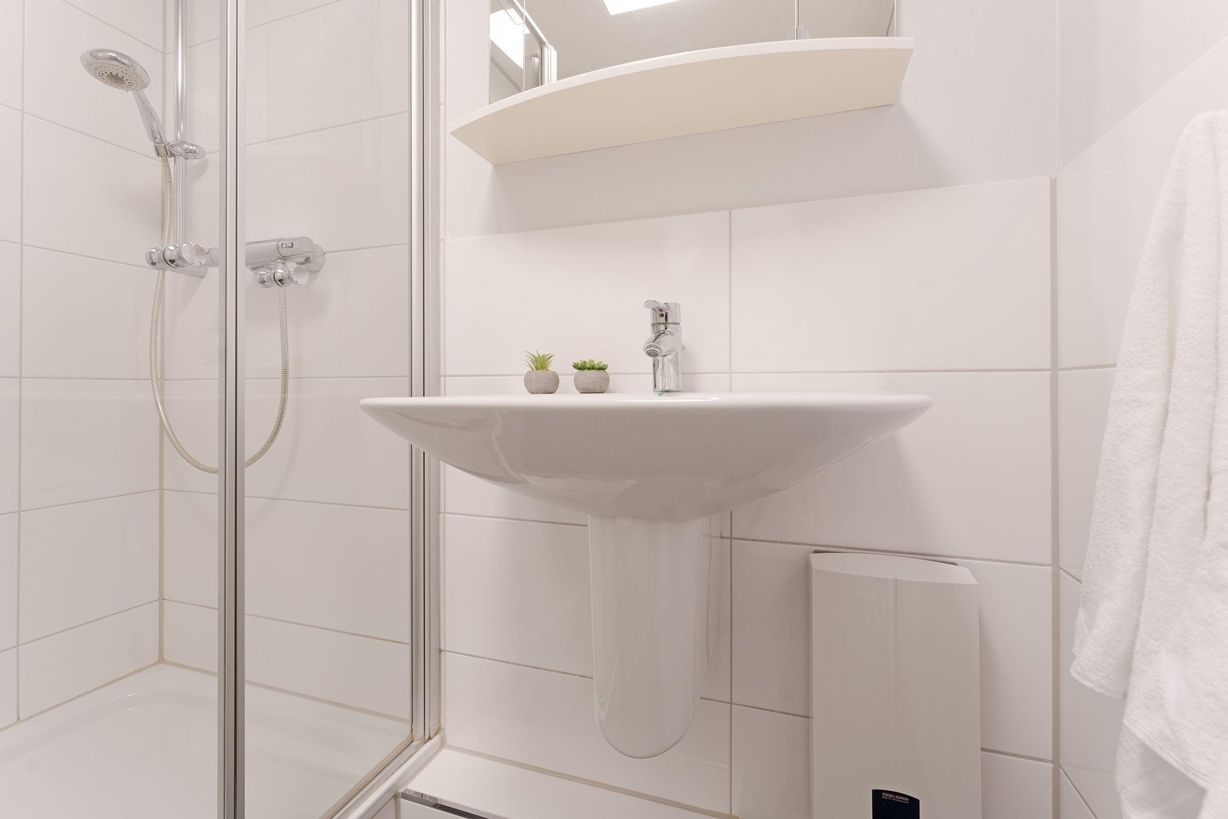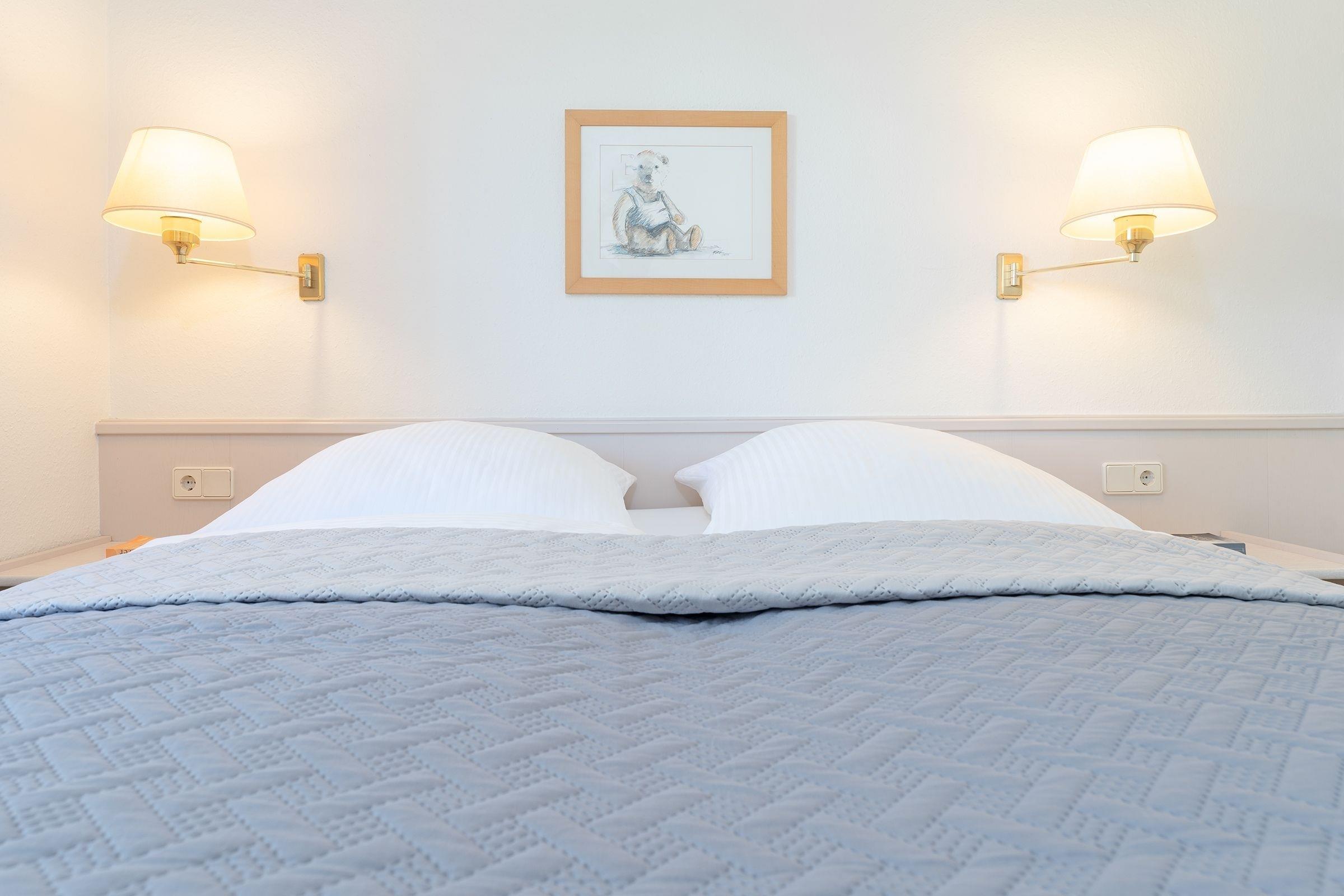 Es ist hell und modern eingerichtet. Das gesamte Appartement ist weiß gefliest. Schlafzimmer mit Doppelbett (2x 90x200 cm) und Radiowecker. Balkon in Süd-Westlage mit Gartenmöbeln. Im Wohnzimmer befinden sich eine komfortable Schlafcouch (150x200 cm) für 2 Personen, TV-Gerät mit Kabel-Empfang sowie der Essplatz. Die Fenster Im Schlafzimmer und im Wohnzimmer verfügen über spezielle Verdunkelungsgardinen. Die Küchenzeile ist ausgestattet mit: Cerankochfeld, Geschirrspülmaschine, Mikrowelle, Kaffeemaschine, Wasserkocher und Toaster. Modernes Duschbad/WC mit Fön. WLAN steht kostenfrei zur Verfügung.