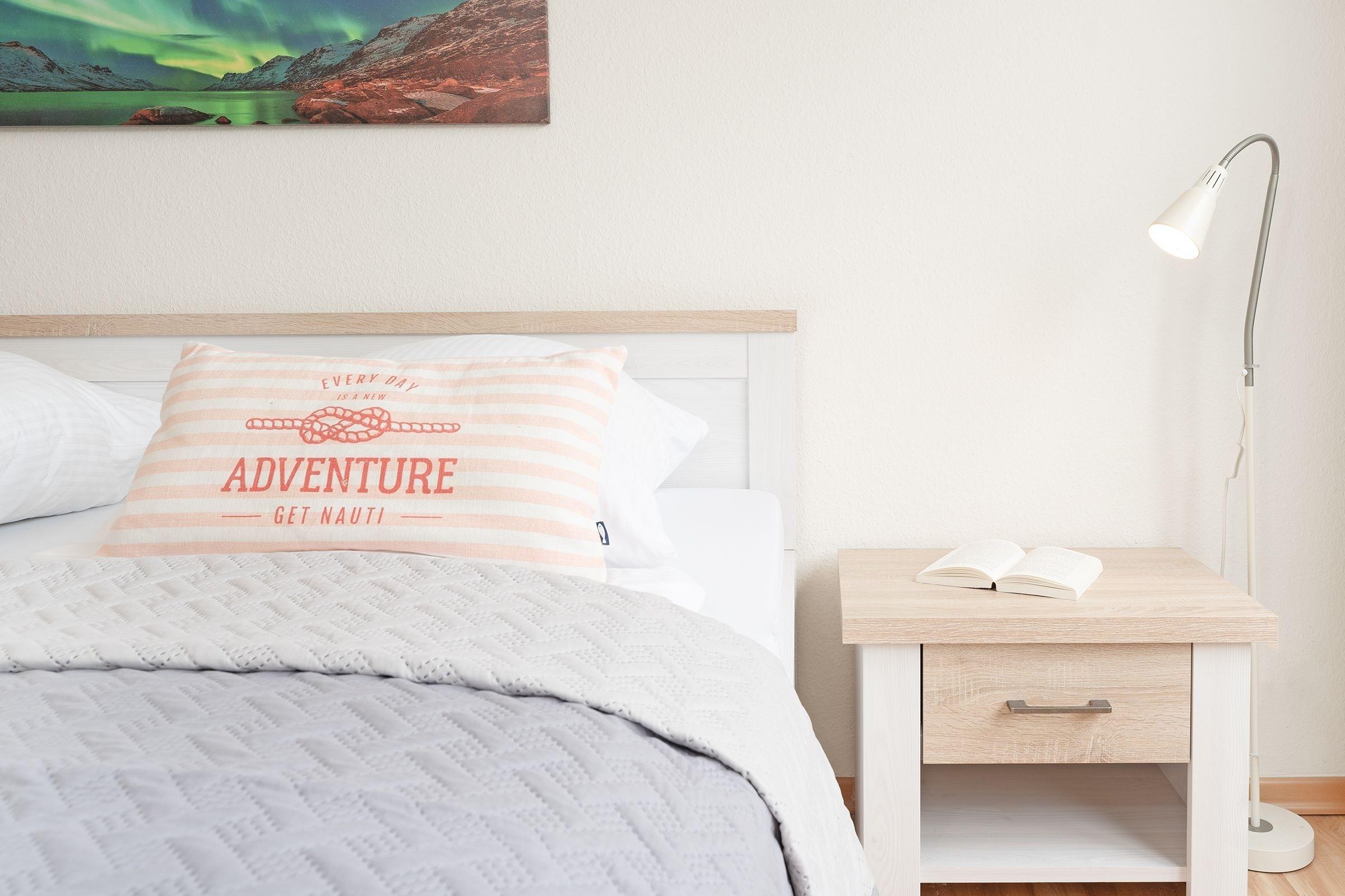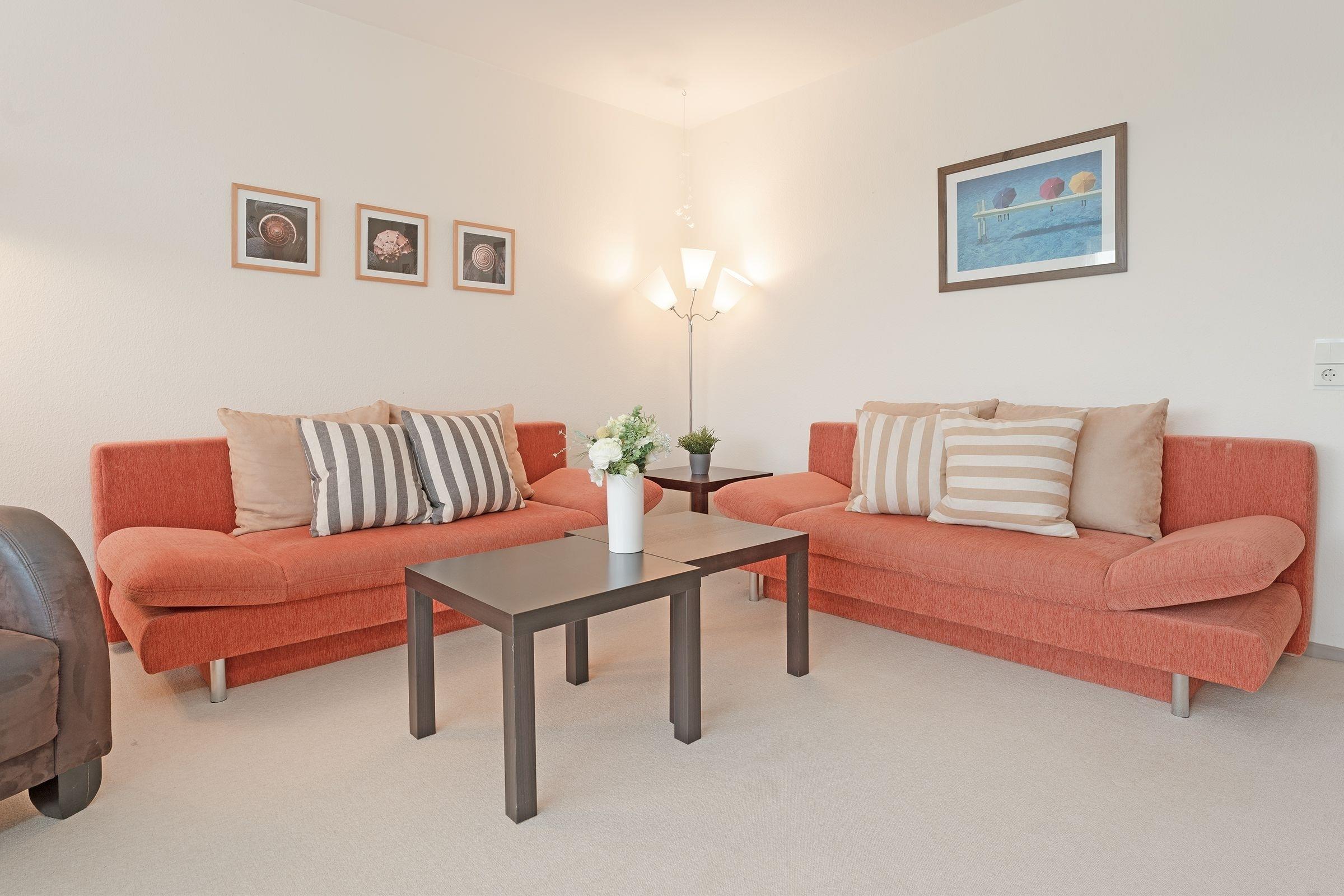 Es ist geschmackvoll und sehr gemütlich eingerichtet. Der Wohnraum verfügt über eine Couchgarnitur mit einer Schlafcouch (140x190 cm), ein TV-Gerät mit Kabelempfang und eine Stereoanlage. Der sehr großzügige Balkon in Süd-/ Westlage ist mit Balkonmöbeln ausgestattet, eine Markise spendet bei Bedarf Schatten. Im Schlafzimmer befindet sich ein Doppelbett (2x 90x200 cm) mit ausreichend Stauraum für Ihre Urlaubsgarderobe. In der separaten Küche mit Essplatz finden Sie einen 3-Plattenherd mit Backofen, Geschirrspülmaschine, Kühlschrank mit Gefrierfach, Kaffeemaschine, Wasserkocher und Toaster. Außerdem gibt es hier eine Durchreiche zum Essplatz und einen Zugang zum zweiten Balkon in Ostlage, auf dem Sie eine Tasse frischen Morgenkaffee genießen können. Das hell geflieste Badezimmer ist funktional mit Dusche/WC und beleuchtetem Spiegelschrank ausgestattet.