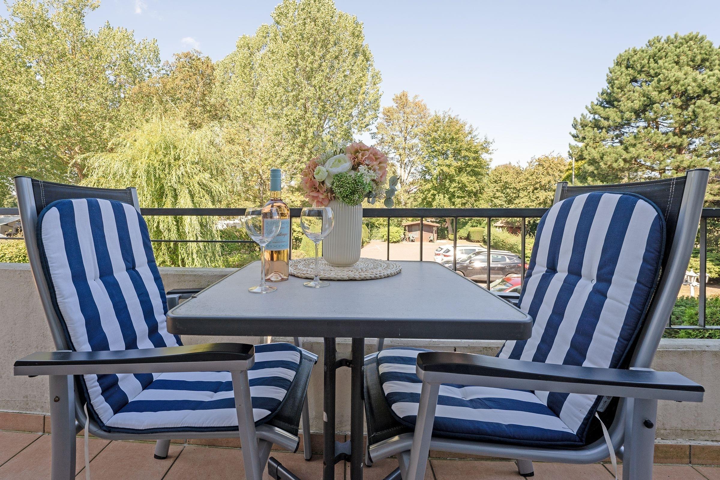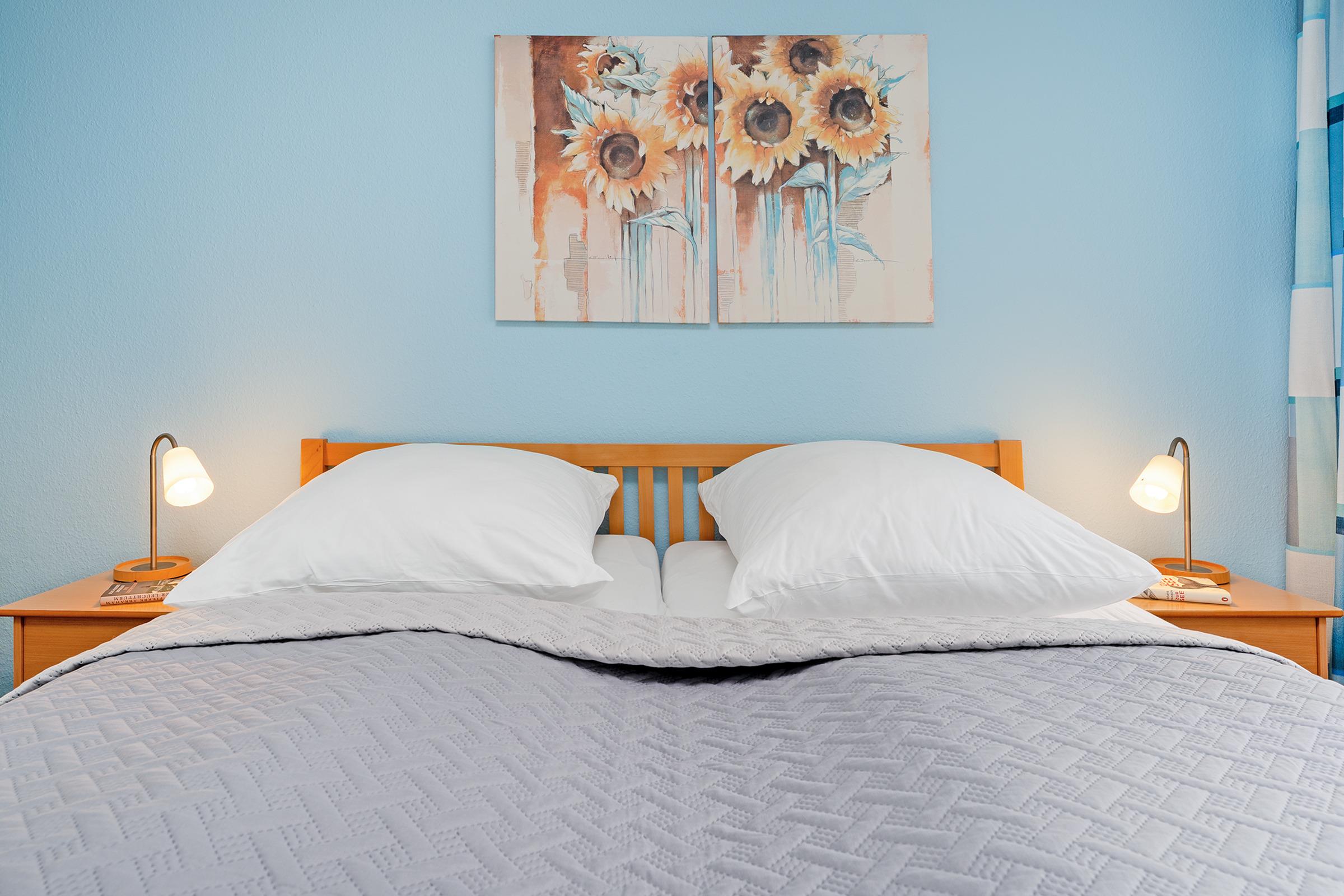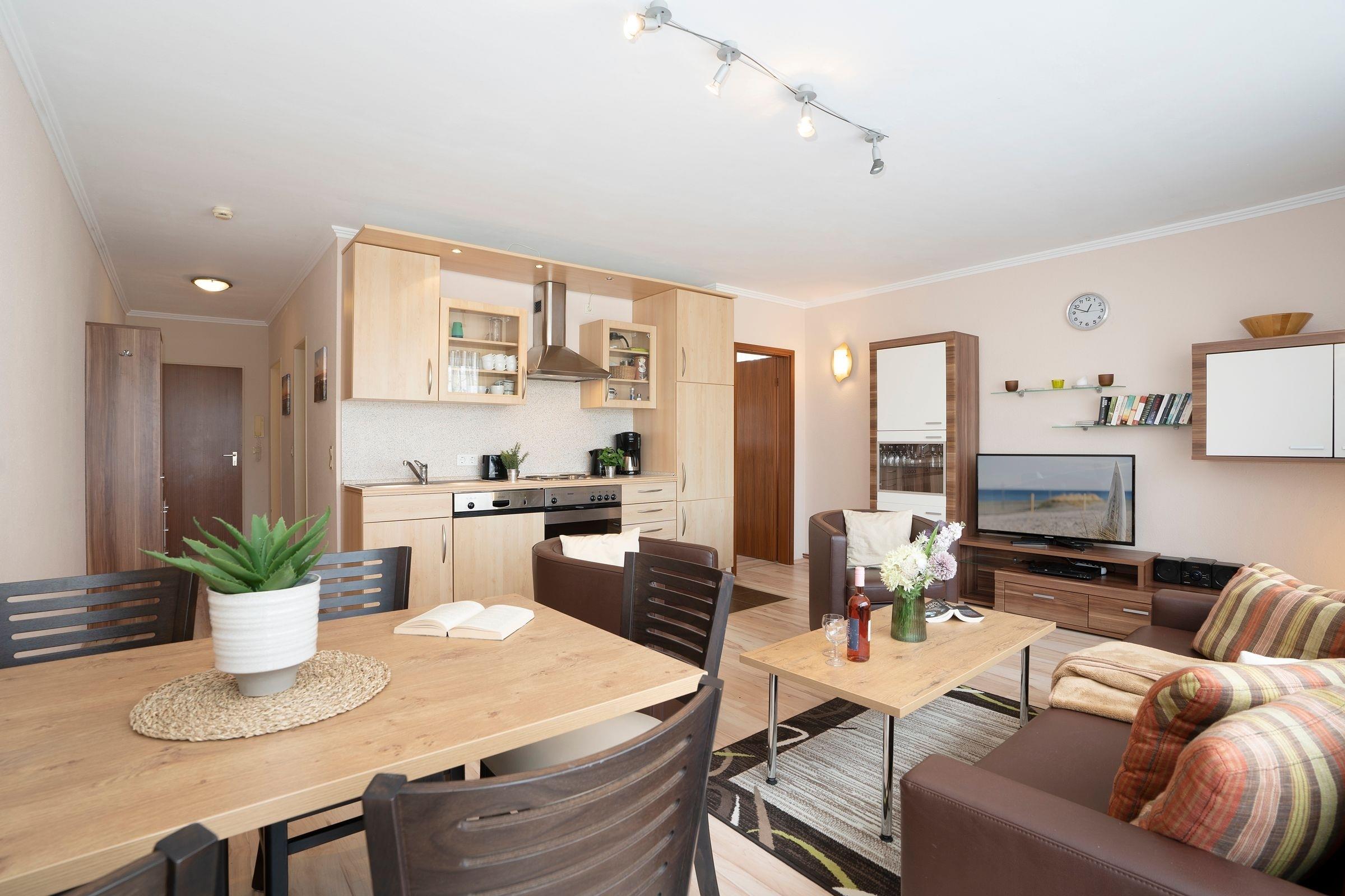Damit Sie auch im Urlaub immer auf dem Laufenden bleiben, steht ein WLAN-Anschluss zur kostenlosen Nutzung bereit sowie ein Smart TV. Im separaten Schlafzimmer mit hochwertigem Doppelbett (180x200 cm) schlafen Sie so prima wie zuhause. Das zweite Schlafzimmer ist mit gemütlichem Etagenbett (2x 90x200 cm) möbliert. Machen Sie es sich abends auf dem Sofa bequem, hier entsteht bei Bedarf ein weiterer Schlafplatz (140x180 cm). Ihre Urlaubstage können Sie entspannt auf Ihren zwei möblierten Balkonen mit Blick ins Grüne ausklingen lassen. Pure Idylle! Die moderne Küchenzeile ist in den Wohnraum integriert und erfreut im Urlaub mit Alltagshelfern wie Backofen und Spülmaschine. Genießen Sie die erste Tasse Kaffee am modernen Esstisch. Das kleine, aber feine Badezimmer ist weiß gefliest und sorgt mit Eckdusche (Einstiegshöhe: 30 cm), Fön und beleuchtetem Spiegel für gute Laune.