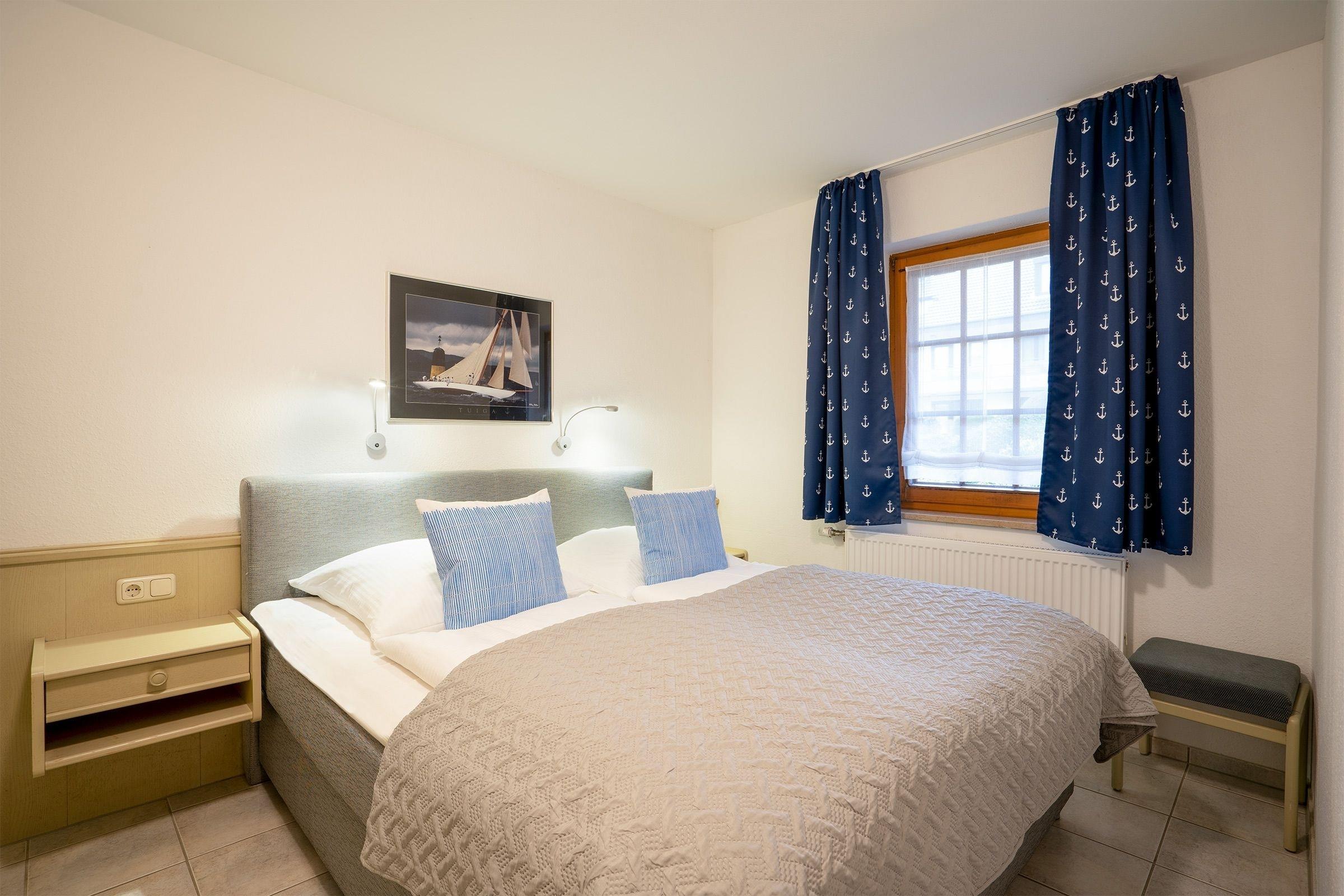 Schlafzimmer: 1 Boxspringbett (180x200 cm), Kleiderschrank, Verdunkelung: Gardinen