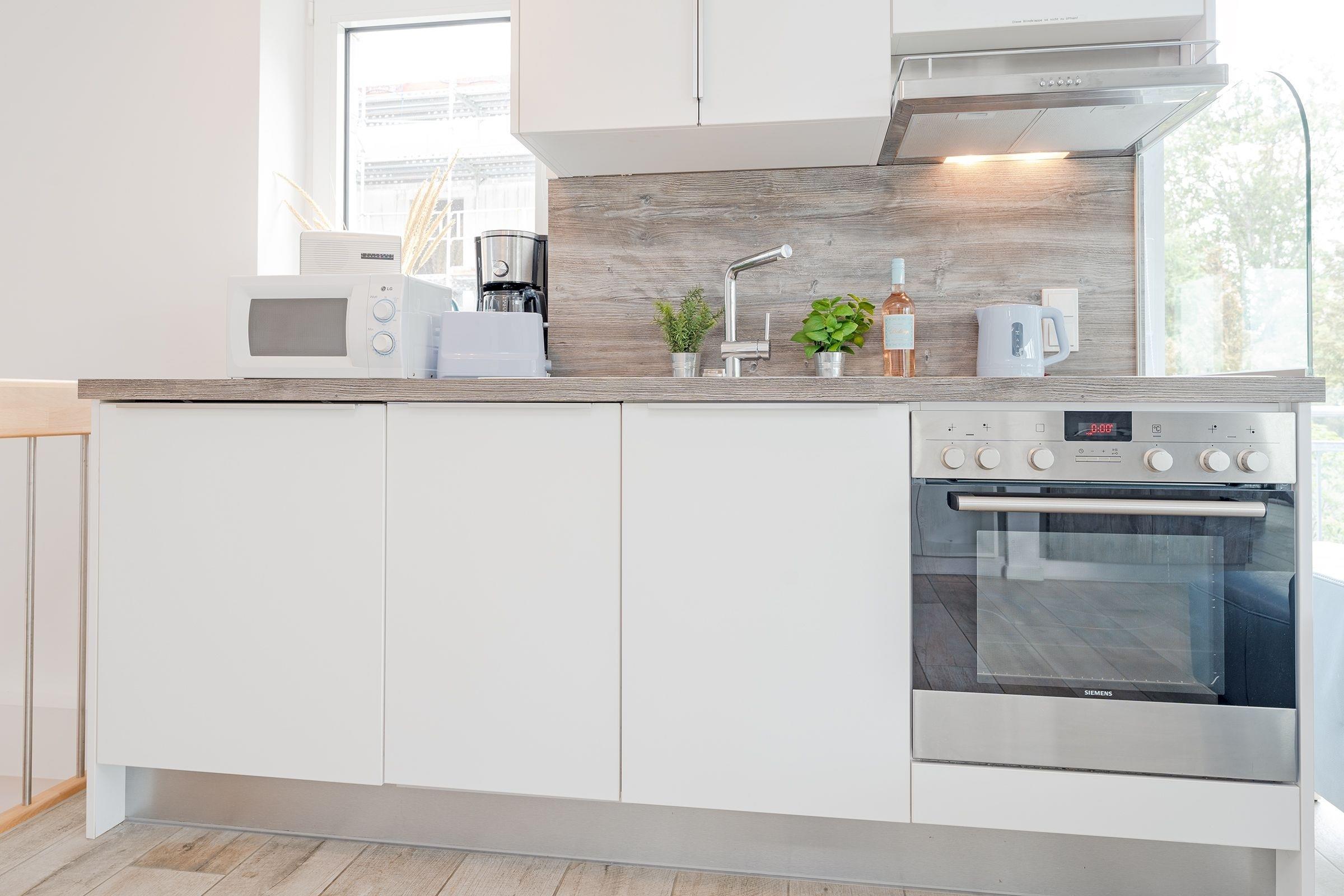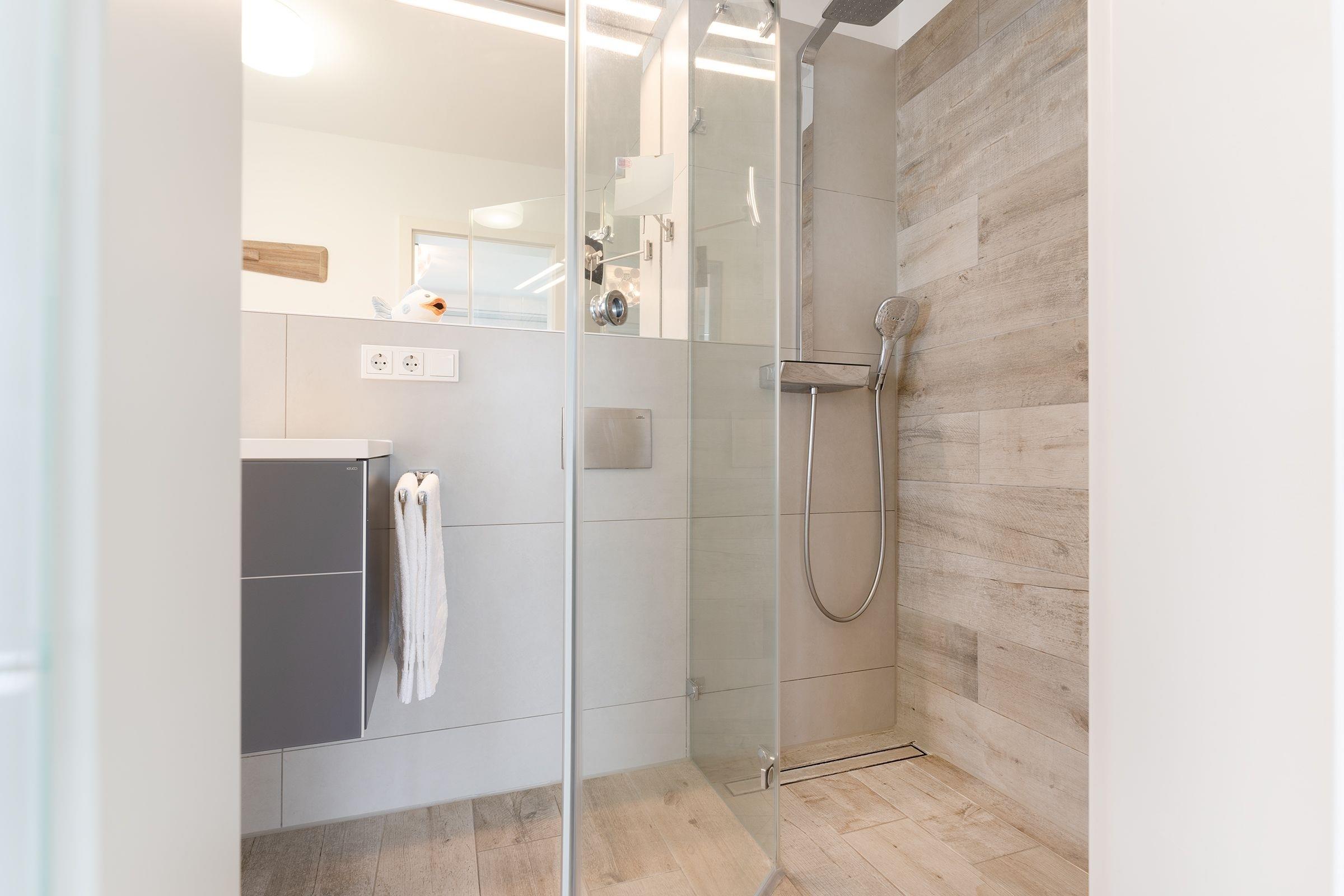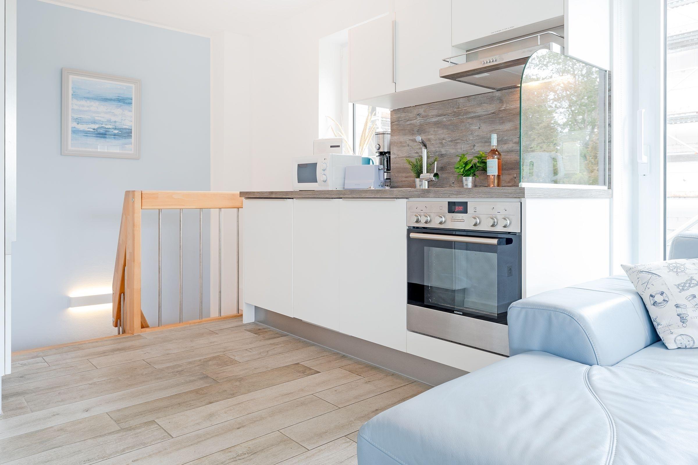 Im Obergeschoss empfängt Sie ein lichtdurchfluteter Wohn- und Schlafbereich. Ihre kleine, aber sehr feine und komplett ausgestattete Küche lässt Herzen selbst ambitionierter Hobbyköche höher schlagen. Ein großzügiger, heller Wohnraum mit gemütlicher Couch und einer Sitzecke lässt keine Wünsche offen. Freuen dürfen Sie sich auf Ihre lauschige Terrasse mit einer Loungecke, die man vom Wohnbereich erreicht. Der erste Kaffee am Morgen, die Tageszeitung in der Hand... Kann ein Morgen besser beginnen? Ihr Schlafbereich wurde optisch raffiniert abgetrennt und dennoch ergibt sich im Ganzen ein einmalig offenes Wohnambiente - Außergewöhnlich schön! Das Doppelbett (2x 80x200 cm) ist fantastisch bequem, freuen Sie sich schon jetzt auf eine erholsame Nachtruhe. Großzügiges Bad mit schöner Dusche ist ein perfekter Start in den Tag! Ihre Wohlfühltemperatur können Sie über das Einstellen der Fußbodenheizung bestimmen. Gardinen und Verdunkelungsplissee schützen vor den ersten Sonnenstrahlen. Im Untergeschoss erwartet Sie ein Schlafzimmer mit einem Einzelbett, welches zu zwei Einzelbetten ausgezogen werden kann.