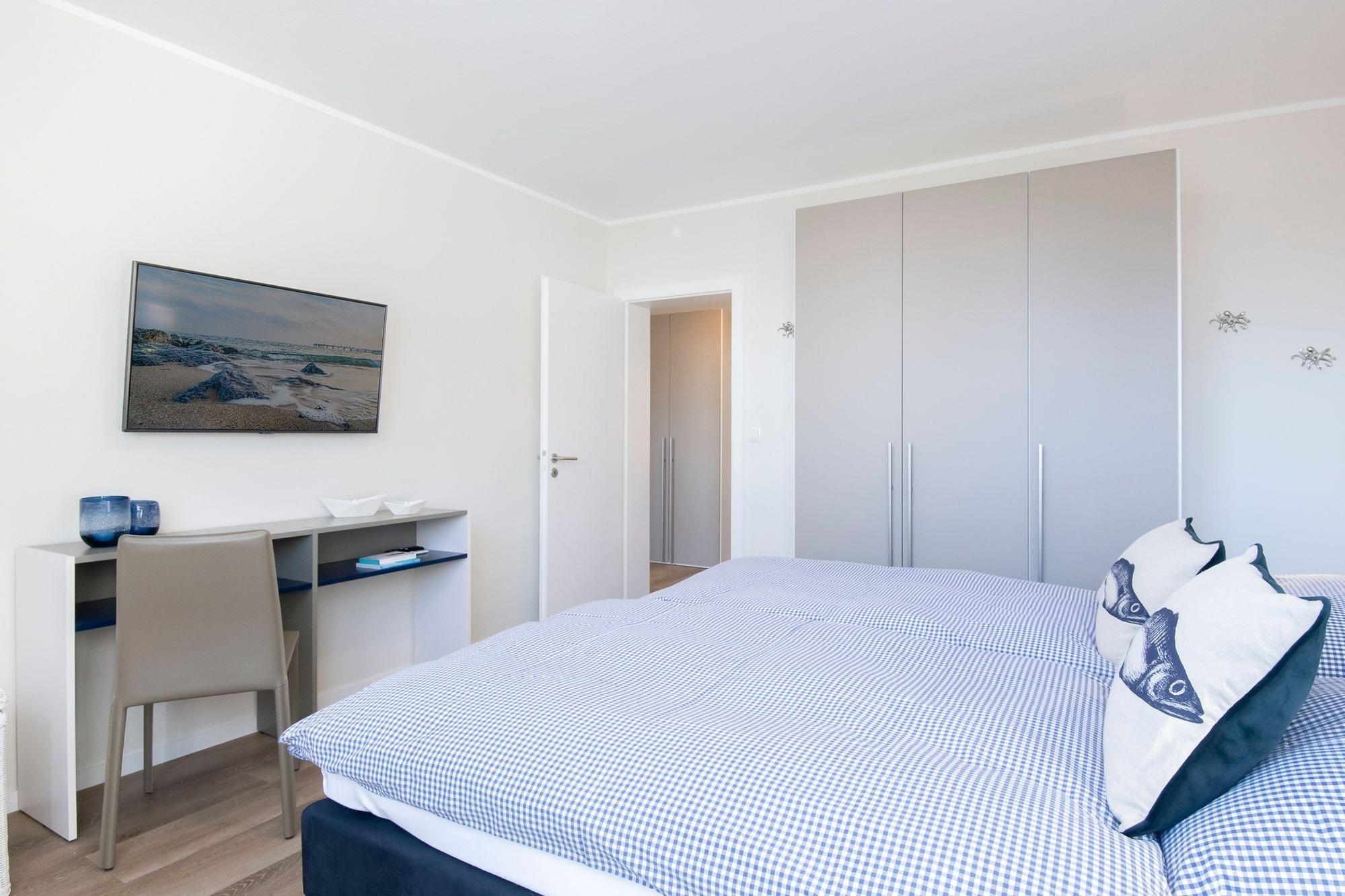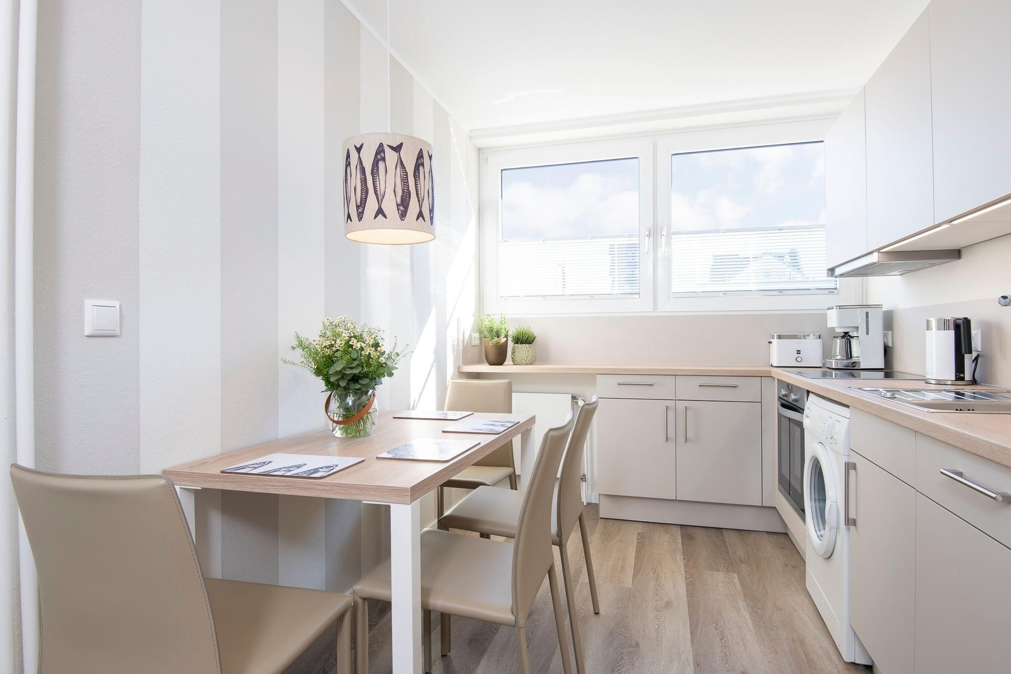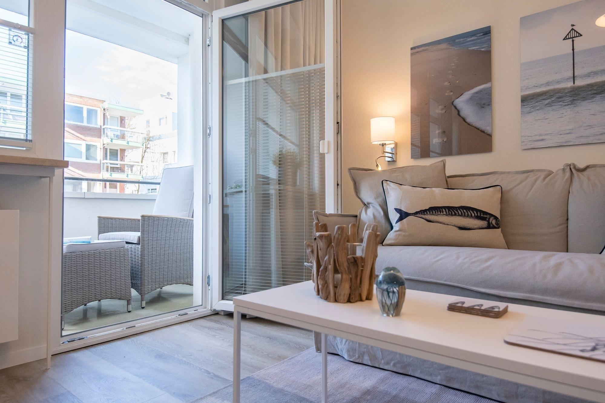 Mit maritimer Gemütlichkeit empfängt Sie der liebevoll designte Wohnbereich. Das kuschelige Sofa lädt zu gemütlichen Stunden vor dem Flachbild-TV ein und kann zur Nacht mit wenigen Handgriffen in eine komfortable Schlafstätte (160x200 cm) verwandelt werden. Von hier haben Sie Zugang auf den möblierten Balkon, von dem Sie sogar einen seitlichen Blick auf das Meer genießen können - in dieser Atmosphäre schmeckt der frische Morgenkaffee gleich nochmal so gut und Sie starten entspannt in einen neuen Urlaubstag. Über den kostenlosen WLAN-Anschluss sind Sie auch im Urlaub erreichbar und können sich bequem über Ihre Urlaubsregion informieren. Sollten Sie mal nicht auf das gastronomische Angebot von Scharbeutz zurückgreifen wollen, können Sie sich in der modernen Küche mit Essplatz ohne Mühe selbst bekochen und versorgen. Nach einem ereignisreichen Urlaubstag wartet dann ein luxuriöses Boxspringbett (180x200 cm) im separaten Schlafzimmer mit Kleiderschrank auf Sie. Die Wohnung lässt sich dank elektrischer Außenjalousien angenehm verdunkeln. Auch das frisch renovierte Duschbad punktet mit hochwertiger Ausstattung sowie niedrigem Duscheinstieg.