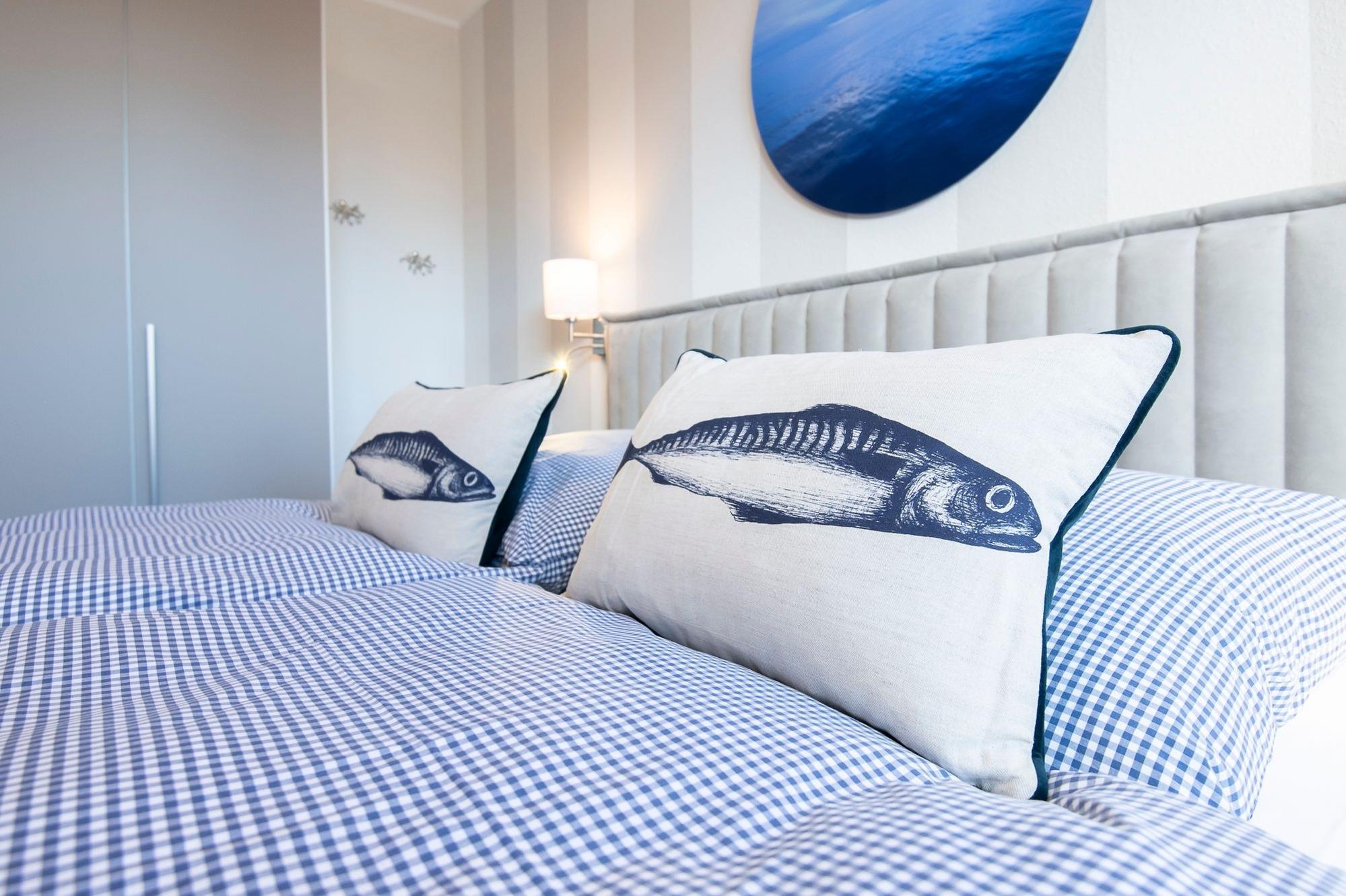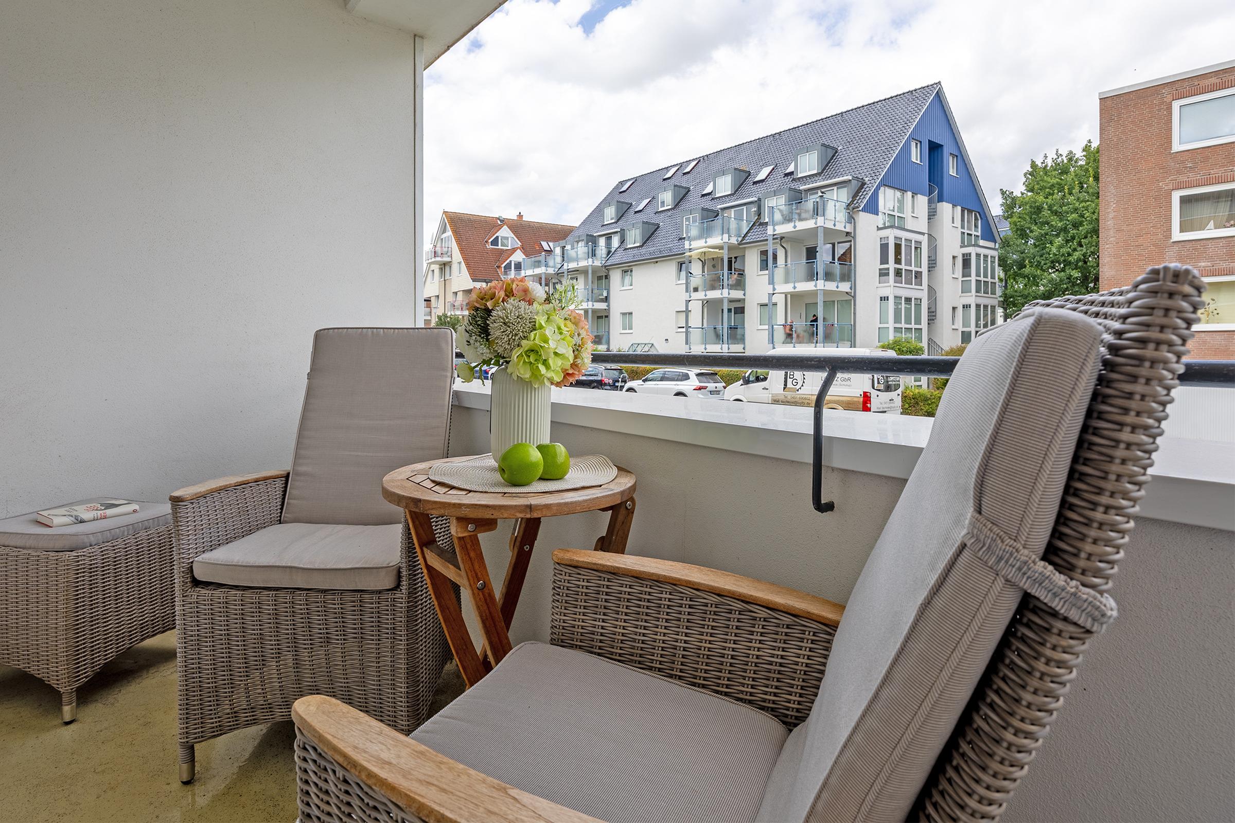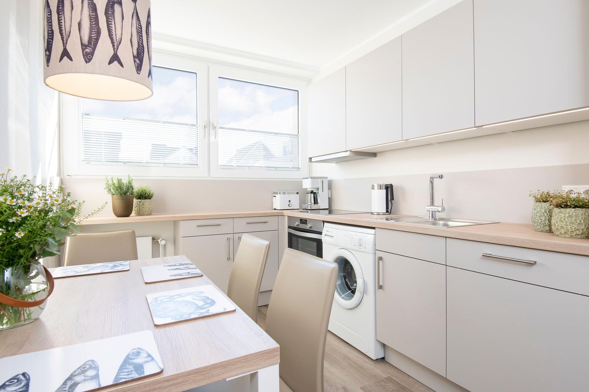 Mit maritimer Gemütlichkeit empfängt Sie der liebevoll designte Wohnbereich. Das kuschelige Sofa lädt zu gemütlichen Stunden vor dem Flachbild-TV ein und kann zur Nacht mit wenigen Handgriffen in eine komfortable Schlafstätte (160x200 cm) verwandelt werden. Von hier haben Sie Zugang auf den möblierten Balkon, von dem Sie sogar einen seitlichen Blick auf das Meer genießen können - in dieser Atmosphäre schmeckt der frische Morgenkaffee gleich nochmal so gut und Sie starten entspannt in einen neuen Urlaubstag. Über den kostenlosen WLAN-Anschluss sind Sie auch im Urlaub erreichbar und können sich bequem über Ihre Urlaubsregion informieren. Sollten Sie mal nicht auf das gastronomische Angebot von Scharbeutz zurückgreifen wollen, können Sie sich in der modernen Küche mit Essplatz ohne Mühe selbst bekochen und versorgen. Nach einem ereignisreichen Urlaubstag wartet dann ein luxuriöses Boxspringbett (180x200 cm) im separaten Schlafzimmer mit Kleiderschrank auf Sie. Die Wohnung lässt sich dank elektrischer Außenjalousien angenehm verdunkeln. Auch das frisch renovierte Duschbad punktet mit hochwertiger Ausstattung sowie niedrigem Duscheinstieg.