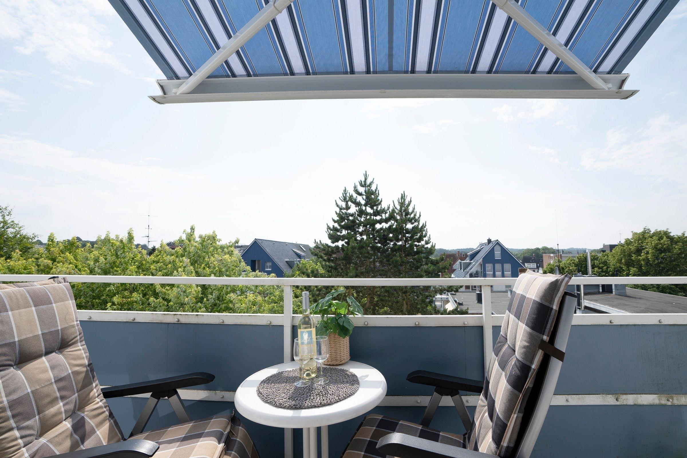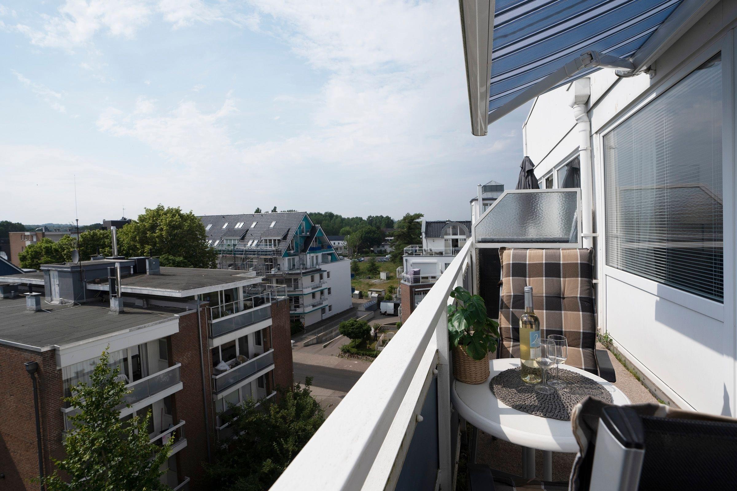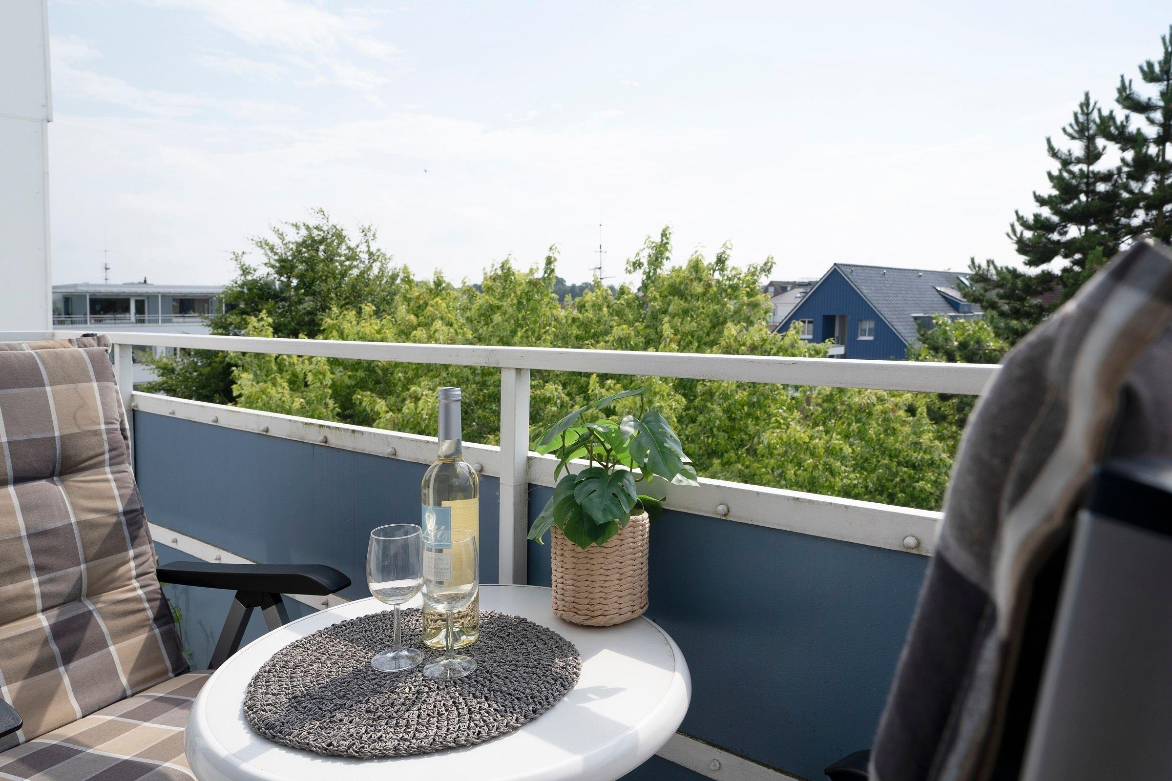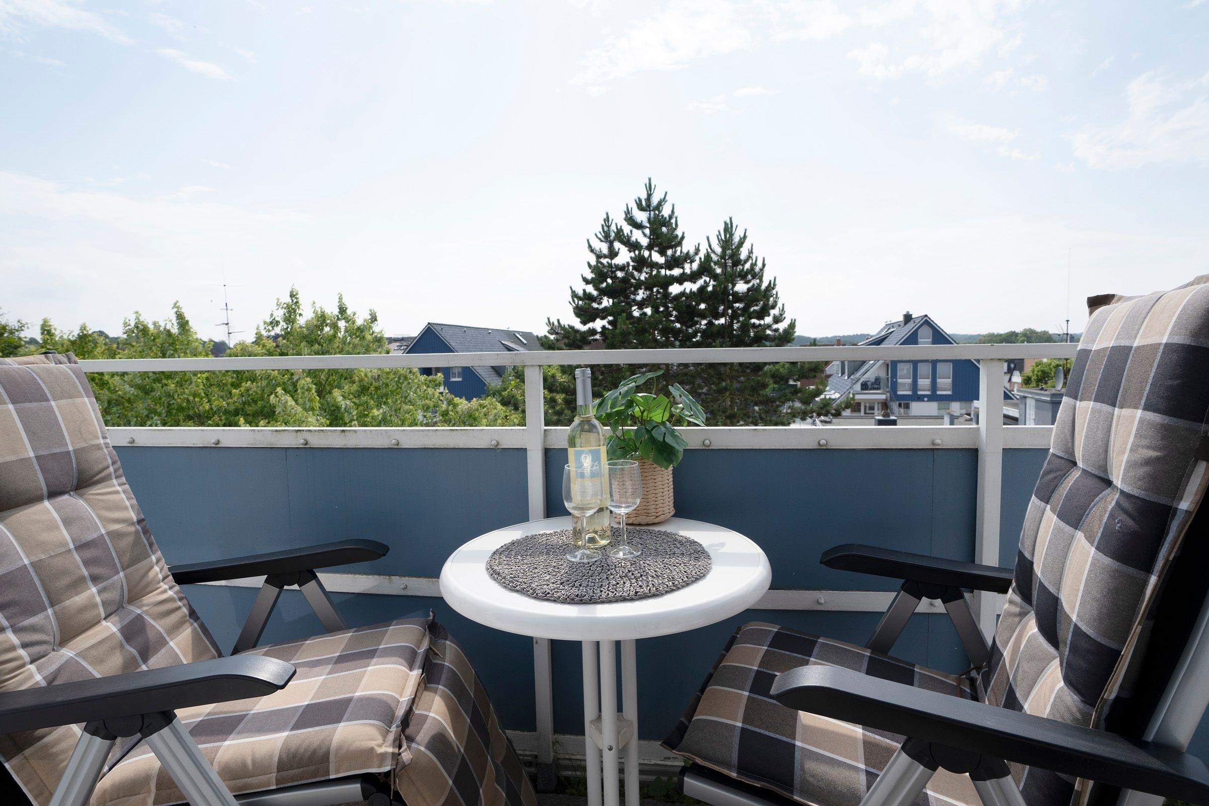 Der kombinierte Wohn-Schlafraum ist mit einem gemütlichen Schlafsofa (160x200 cm) sowie einem Flachbildfernseher ausgestattet und grenzt an den Essbereich mit ausreichend Platz für alle Gäste. Von hier aus gelangen Sie auf den möblierten Balkon mit Markise und tollem Panoramablick über die Dächer von Scharbeutz. Die offene Küche ist mit einem Herd, Kühlschrank mit Gefrierfach und einer Kaffeemaschine ausgestattet. Das hell geflieste Badezimmer mit Dusche und beheizbarem Handtuchhalter rundet den Komfort dieser Ferienwohnung ab.