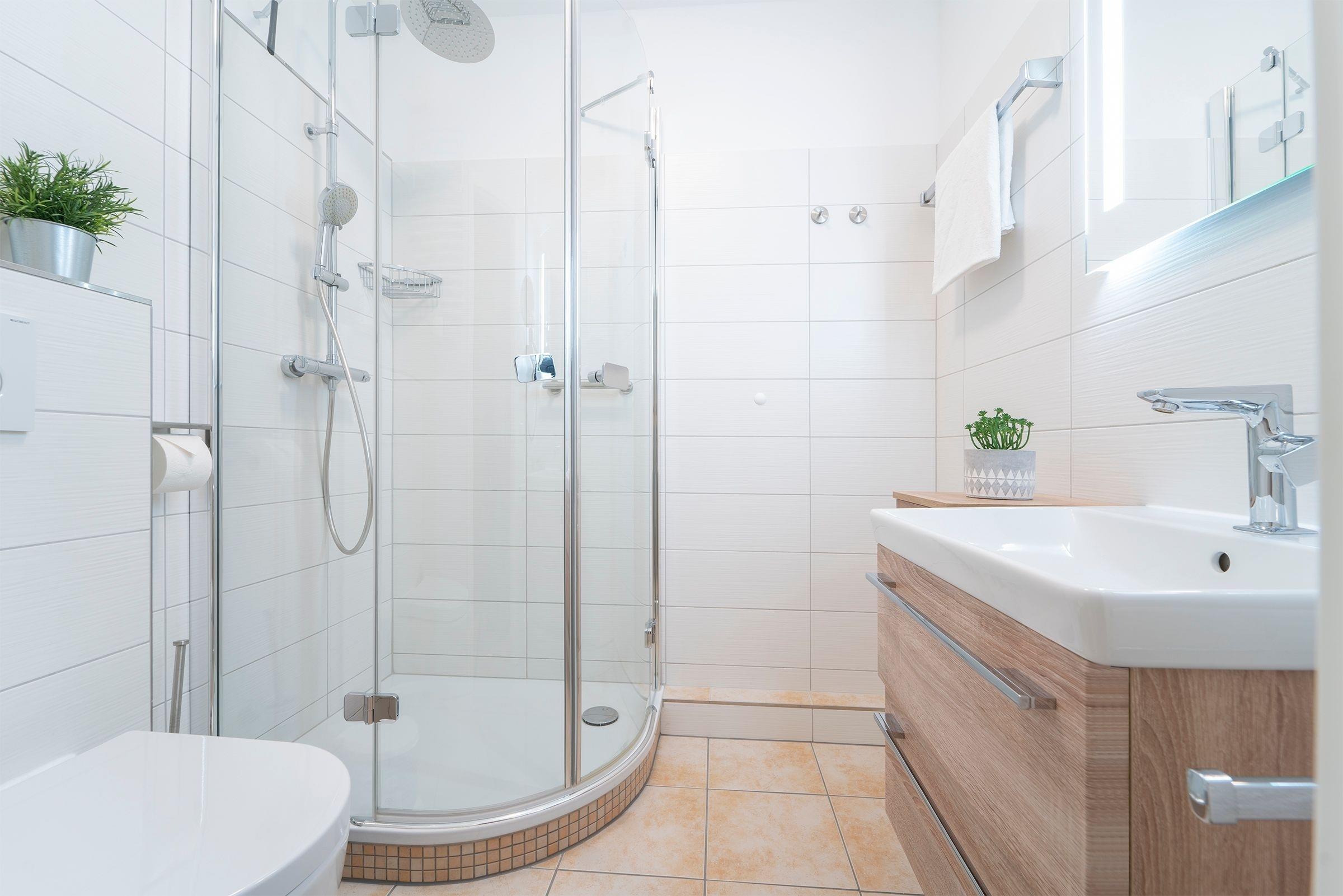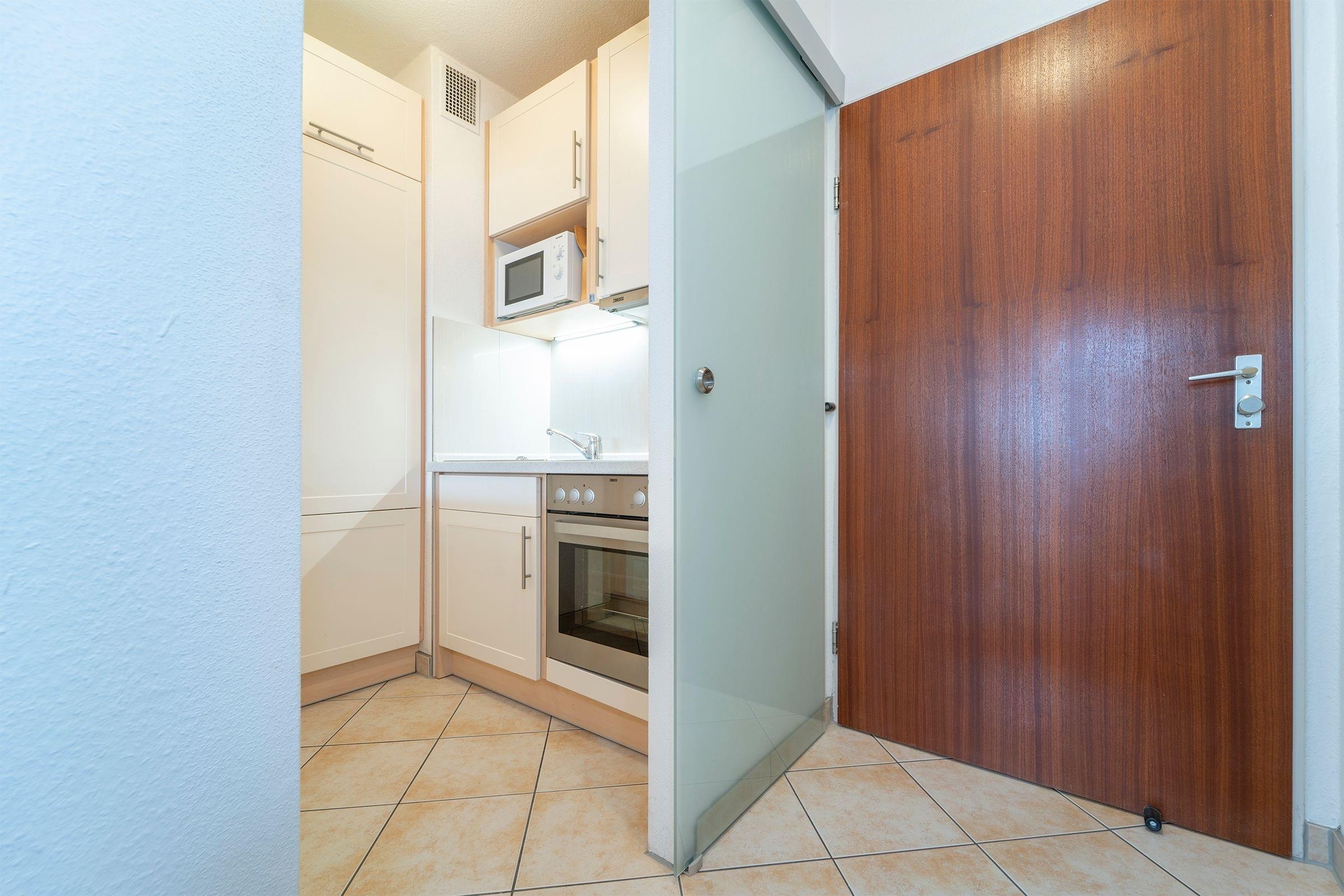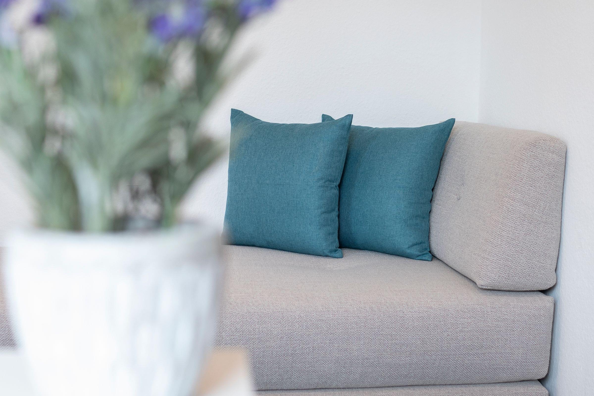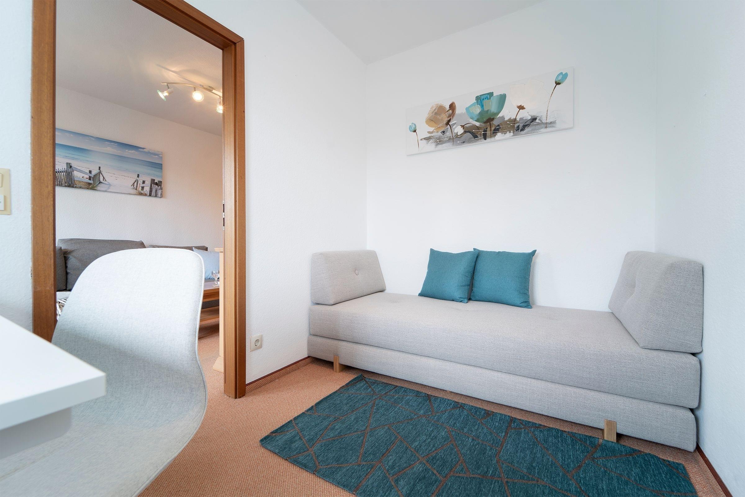 Im hellen und geräumigen Wohnbereich fühlt man sich gleich wie zu Hause: machen Sie es sich auf der Couch bequem, der Fernseher mit DVD-Player, eine Hifi-Anlage sowie der vorhandene WLAN-Anschluss sorgen für hier ausreichend Unterhaltung. Zur Nacht können Sie die Couch in einen weiteren Schlafplatz (ca. 140x200 cm) verwandeln oder das Schrankbett (2x 80x190cm) aufklappen und es sich dort gemütlich machen. Auf dem möblierten Südbalkon können Sie ihren ersten Morgenkaffee sowie Ihr Frühstück genießen, dass in der offenen, gut ausgestatteten Küche zubereitet werden kann. Zusätzlich steht Ihnen als Rückzugsort ein weiteres kleines Schlafzimmer mit einer Sofa-Liege (ca. 160x190 cm) zur Verfügung. Das moderne Bad mit Dusche und Waschtisch rundet das Angebot in dieser Ferienwohnung ab.