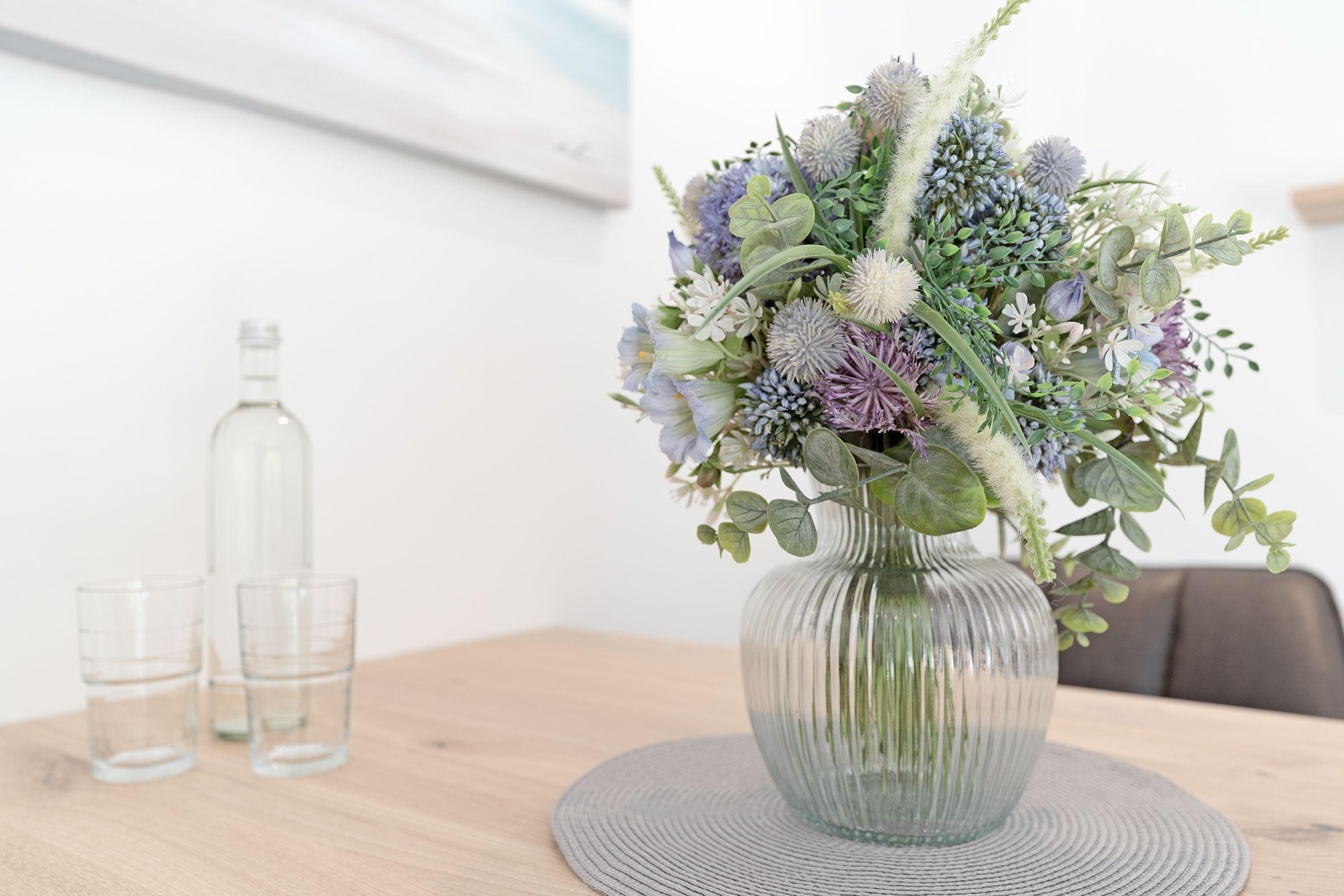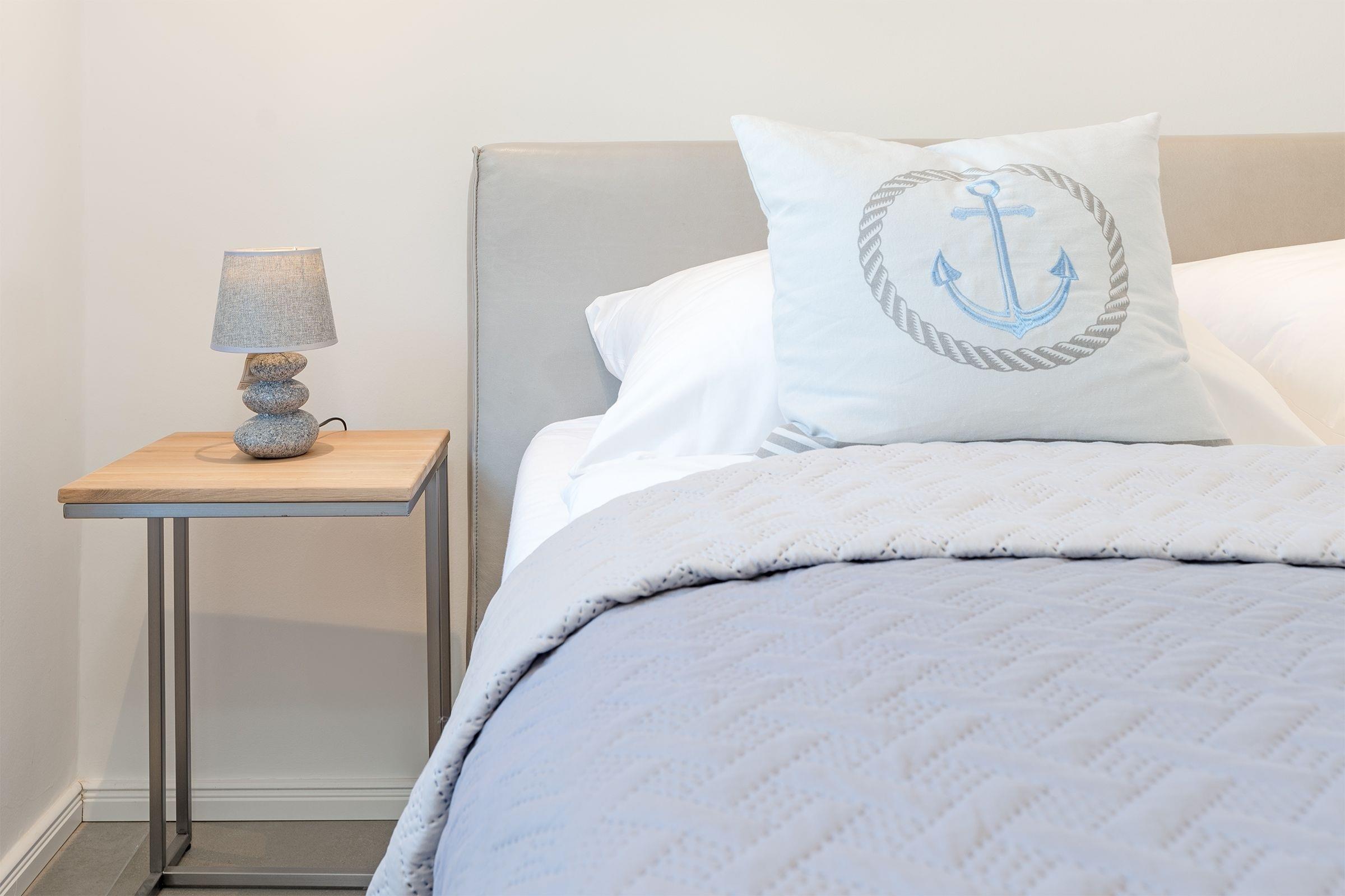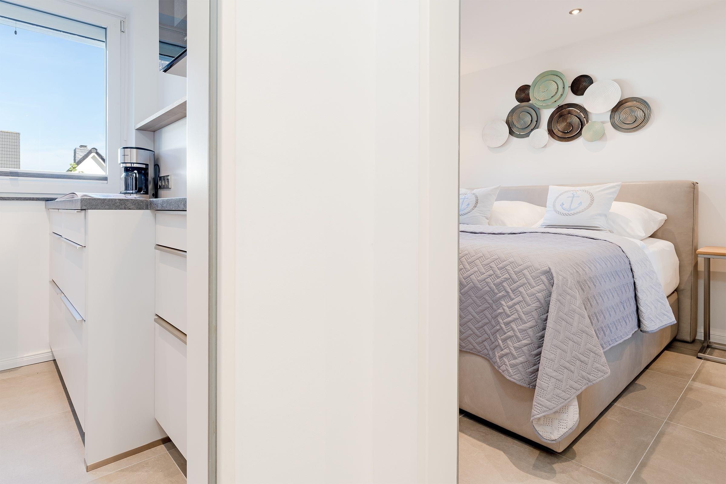Der moderne und hochwertige Einrichtungsstil zieht sich durch die gesamte Wohnung. Die Küche besticht durch ihre erstklassige Ausstattung inklusive Induktionskochfeld, Backofen (Miele), Spülmaschine, Kaffeefiltermaschine und Kühlschrank mit integriertem Gefrierfach. Der angeschlossene Wohn- und Essbereich bietet Platz für gemütliche Stunden mit Freunden und Familie. Auf dem Smart-TV können Sie sich bequem bei einem Streamingdienst Ihrer Wahl einloggen und nahtlos Ihre Lieblingsfilme und -serien von Zuhause weitergucken. Das Sofa im Wohnbereich kann mit wenigen Handgriffen zu einer Schlafmöglichkeit (ca. 140x200 cm) für zwei Personen umgebaut werden. In einem separaten Schlafzimmer finden zudem zwei weitere Personen in einem gemütlichen Boxspringbett (140x200 cm) Platz. Das Schlafzimmer wird ergänzt durch einen großen Kleiderschrank. Die Erholung, die diese Ferienwohnung verspricht, wird abgerundet von einem modern gestalteten Bad mit bodengleicher Dusche, Fußboden- und Handtuchheizung.