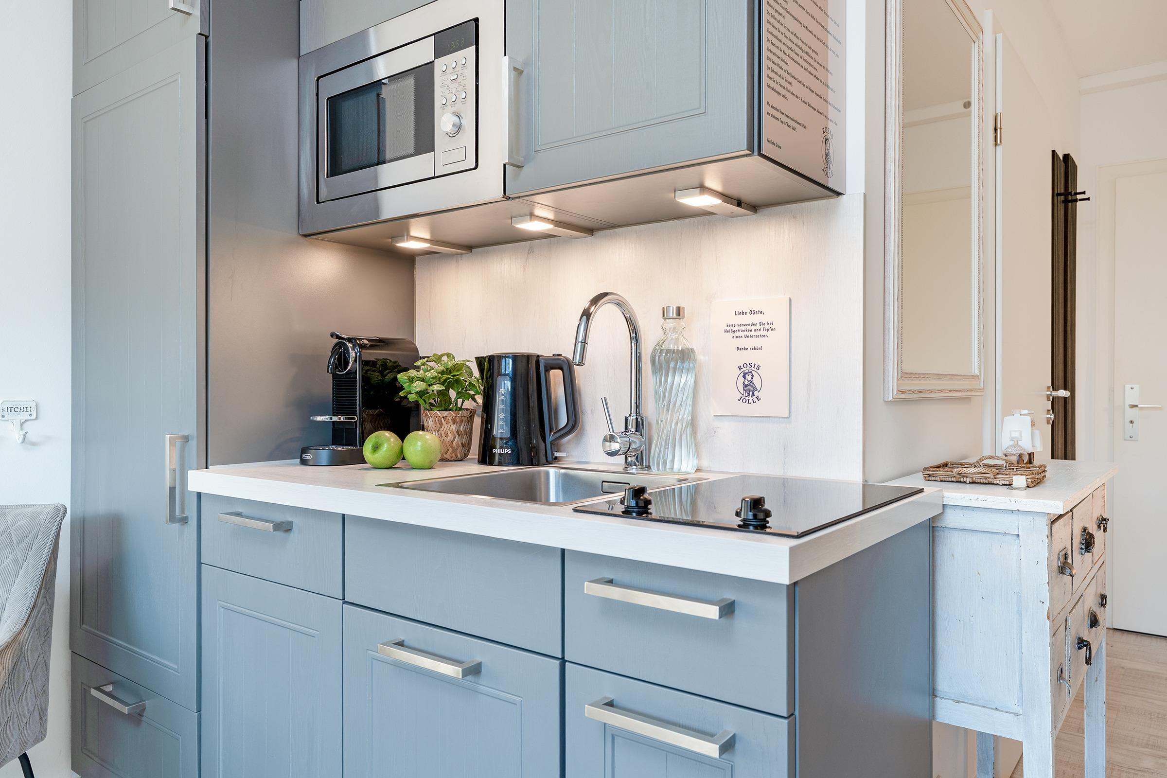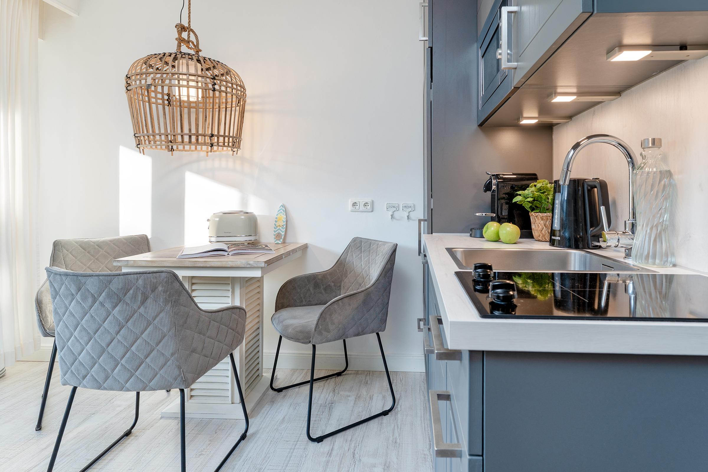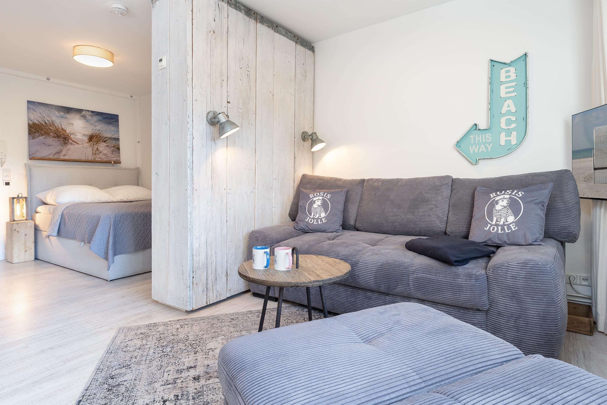 Der kombinierte Wohn- und Schlafbereich ist stilvoll und funktional eingerichtet. Ein komfortables Boxspringbett (2x 70x200 cm) sowie eine ausziehbare Schlafcouch (180x200 cm) bieten flexible Schlafmöglichkeiten. Die integrierte Küchenzeile ist bestens ausgestattet. Die frisch zubereiteten Mahlzeiten genießen Sie am angrenzenden Esstisch – oder auf der überdachten, möblierten Terrasse, die zum Verweilen an der frischen Ostseeluft einlädt. Kaffee-Liebhaber aufgepasst: Sie können sich auf eine Senseo-Kaffeemaschine (Pads) und eine Nespresso De'Longhi Citiz (Kapseln) freuen. Zur technischen Ausstattung gehören ein Flachbildfernseher, Bluetooth-Lautsprecher und WLAN-Zugang – für entspannte Stunden bei jedem Wetter.