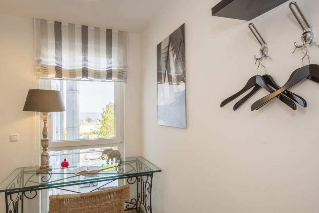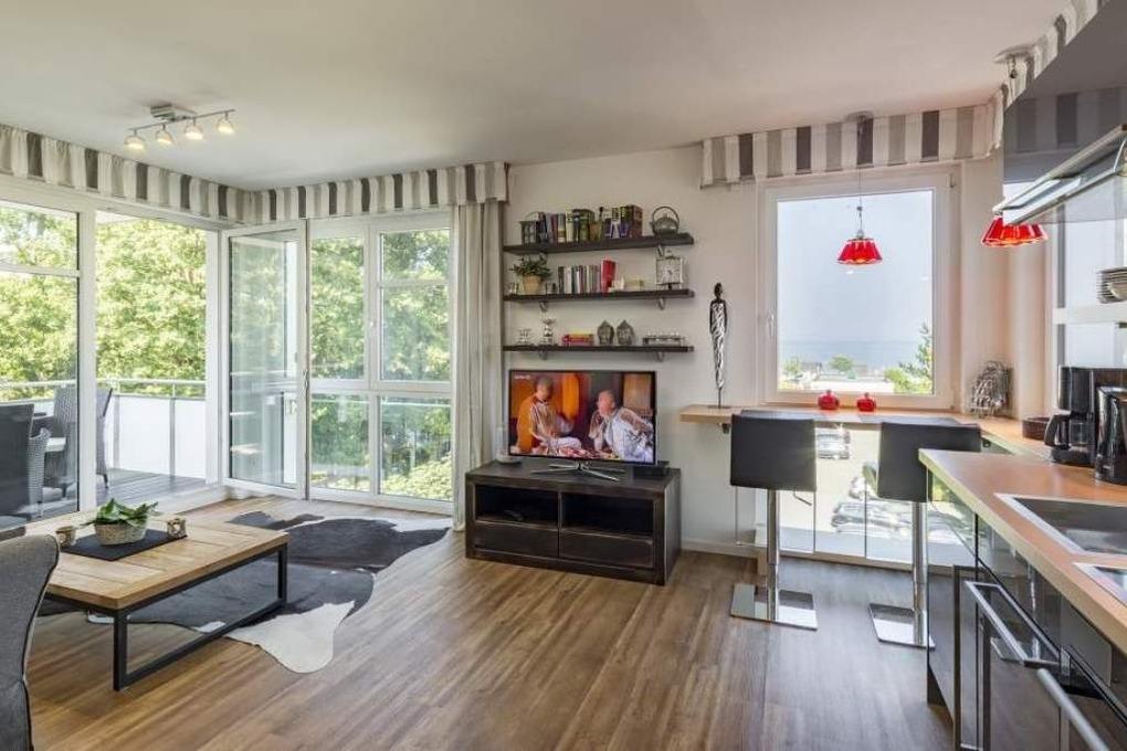Diese Ferienwohnung mit tollem Blick über die Ostsee lädt Sie zum Entspannen ein. Der gemütliche Wohnbereich mit bodentiefen Fenstern ist mit einem gemütlichen Sofa ausgestattet, von welchem Sie bequem den Blick über die Ostsee genießen können. Neben einem Flachbildfernseher und einem BluRay-Player steht Ihnen selbstverständlich kostenloses WLAN zur Verfügung. Der überdachte Balkon, mit Blick auf die Ostsee oder in den Kurpark, ist mit einem Tisch und Stühlen ausgestattet. Die moderne Küche mit Tresen lässt keine Wünsche offen. Im gemütlichen Schlafzimmer stehen ein bequemes Bett (1,80 x 2,00m, Einzelmatratzen) sowie ein geräumiger Schrank zur Verfügung. Von dem Schreibtisch, der im Flur steht, haben Sie einen schönen Meerblick. Das Badezimmer verfügt über einen Doppelwaschtisch, eine bodentiefe Dusche und einen abgegrenzten WC-Bereich. Neben der Fußbodenheizung ist hier ein zusätzlicher Handtuchheizkörper angebracht.