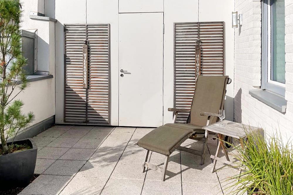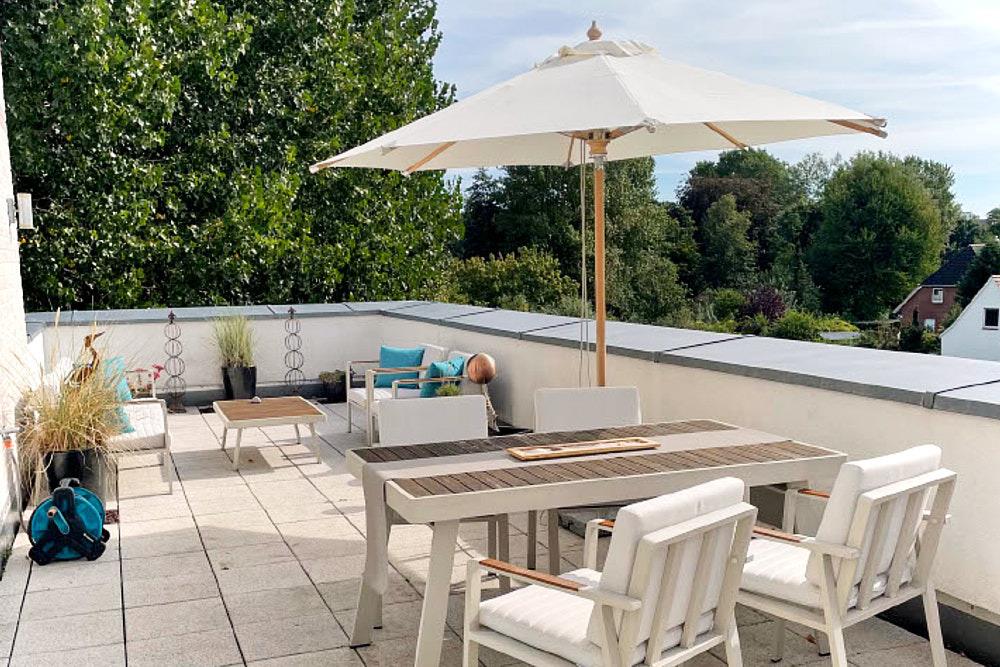 Der moderne Wohn-Essbereich bietet Ihnen ein Sofa, einen Sessel und einen großen Esstisch mit Bank und Stühlen für gesellige Stunden. Für Ihre Lesestunde steht für Sie ein Relaxsessel bereit. Neben dem Flachbildfernseher, einer Stereoanlage und einem Blu-ray-Player steht Ihnen selbstverständlich kostenloses WLAN zur Verfügung. Die helle Küche mit einem tollen Ausblick lässt keine Wünsche offen. Die 1. Terrasse, die vom Wohnbereich zu betreten ist, ist mit einem Tisch, Stühlen, Liegen und einem Sonnenschutz ausgestattet. Der Blick über den Kurpark und die freundliche Gestaltung der Terrasse lassen Sie entspannen und Ihren Urlaub genießen. Im 1. Badezimmer befinden sich eine bodentiefe Dusche und ein großer Spiegel. Über eine Treppe gelangen Sie in die zweite Ebene.[nbsp] Hier erwartet Sie ein helles Badewannenbad mit Handtuchheizkörper, viel Ablagefläche und einer Waschmaschine. Das erste Schlafzimmer verfügt über ein Boxspringbett, einen Kleiderschrank, einen Flachbildfernseher und den Zugang zur oberen Terrasse. Sie ist mit Lounge-Möbeln ausgestattet. Im 2. Schlafzimmer stehen Ihnen ein Boxspringbett, ein Flachbildfernseher, ein Schminktisch und, das Highlight dieser Wohnung, eine eigene Sauna zur Verfügung. Saunieren Sie mit Blick über die Dächer von Scharbeutz. Das angrenzende Ankleidezimmer bietet ausreichend Platz.