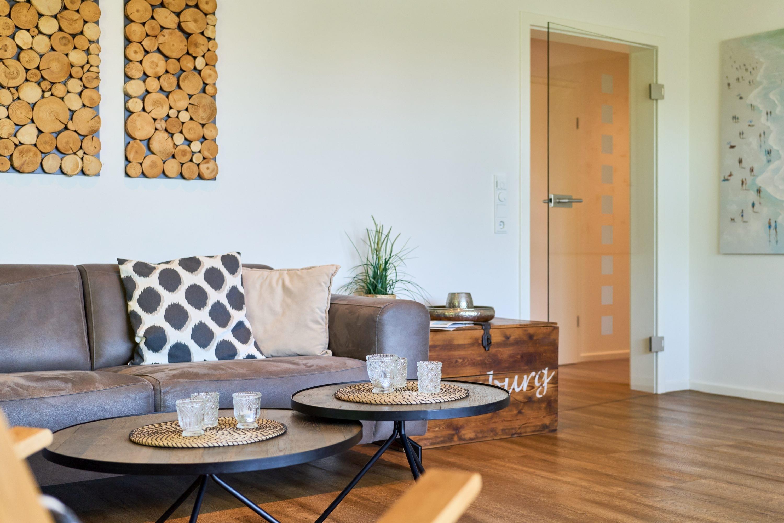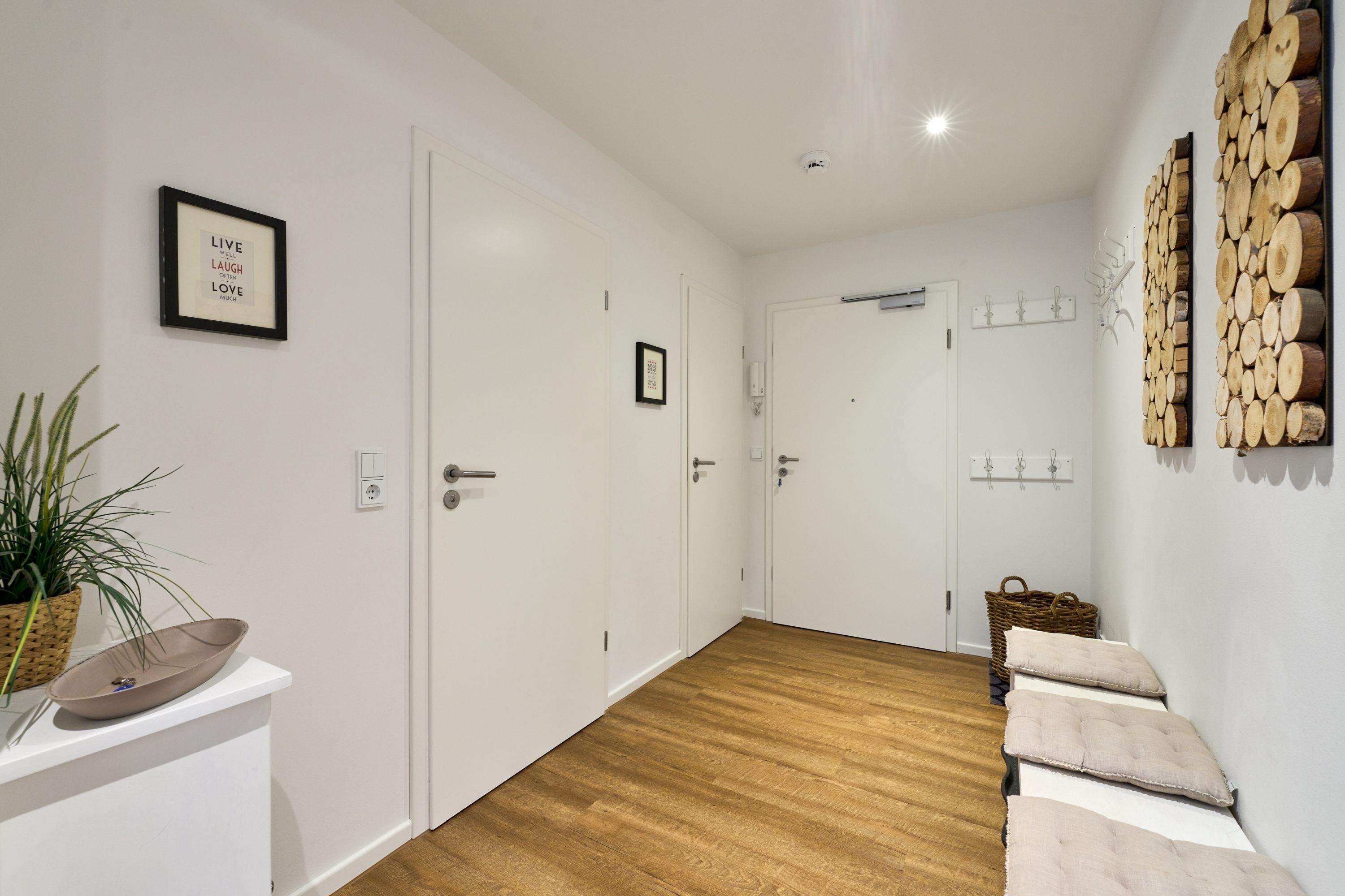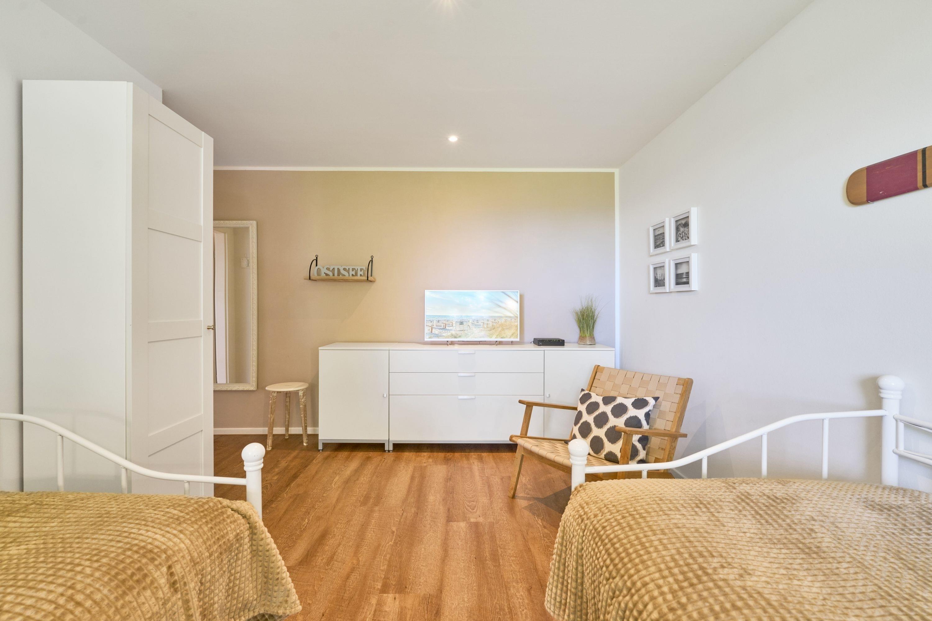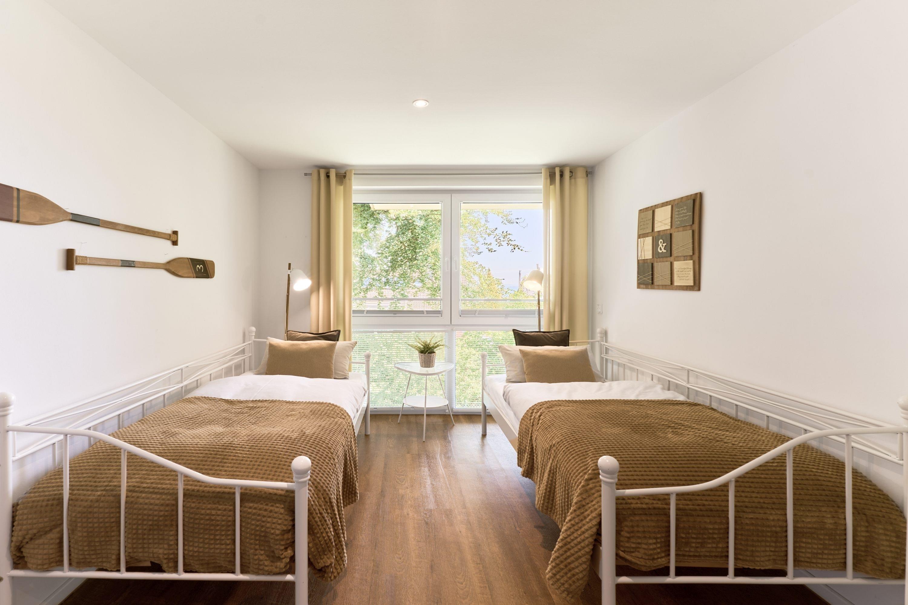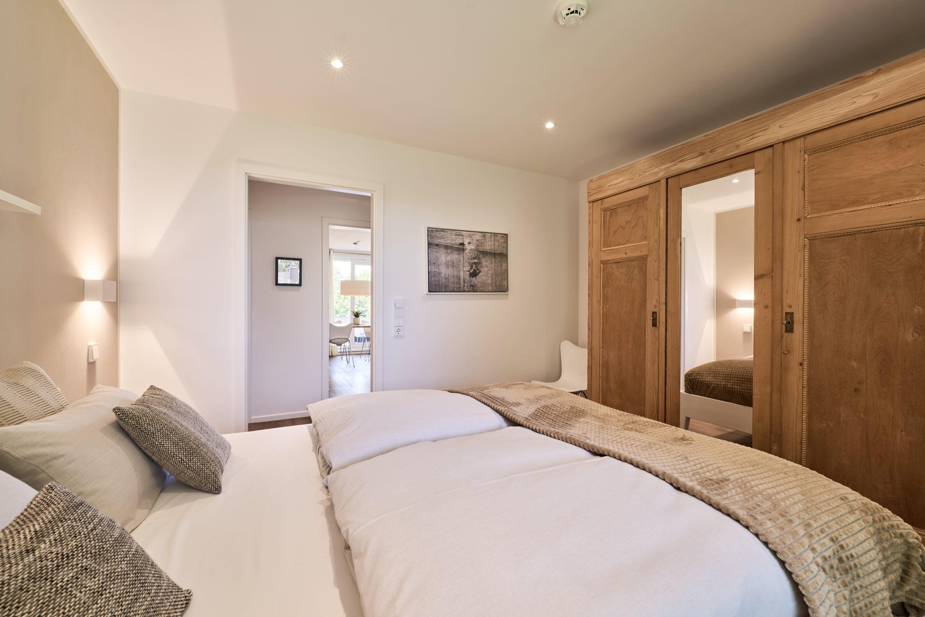 Genießen Sie Ihren Urlaub in dieser lichtdurchfluteten Ferienwohnung, die Ihnen mit ihren zwei geräumigen Schlafzimmern und dem großen Wohnzimmer, mit integrierter Küche, großem Esstisch und gemütlicher Fernsehecke, inklusive Musikanlage, viel Raum zum Entspannen bietet. WLAN steht Ihnen kostenlos zur Verfügung. Der nach Südwesten ausgerichtete Balkon ist mit Lounge-Möbeln ausgestattet. Im ersten Schlafzimmer steht ein bequemes Doppelbett (1,60 x 2,00m), im 2. Schlafzimmer warten 2 Einzelbetten auf Sie. Hier befindet sich auch ein Flachbildfernseher. In beiden Schlafzimmern sind zur Verdunkelung elektrische Rollläden angebracht. Die hellen Badezimmer mit Tageslicht verfügen über bodentiefe Duschen und neben der Fußbodenheizung steht Ihnen hier ein Handtuchheizkörper zur Verfügung.
