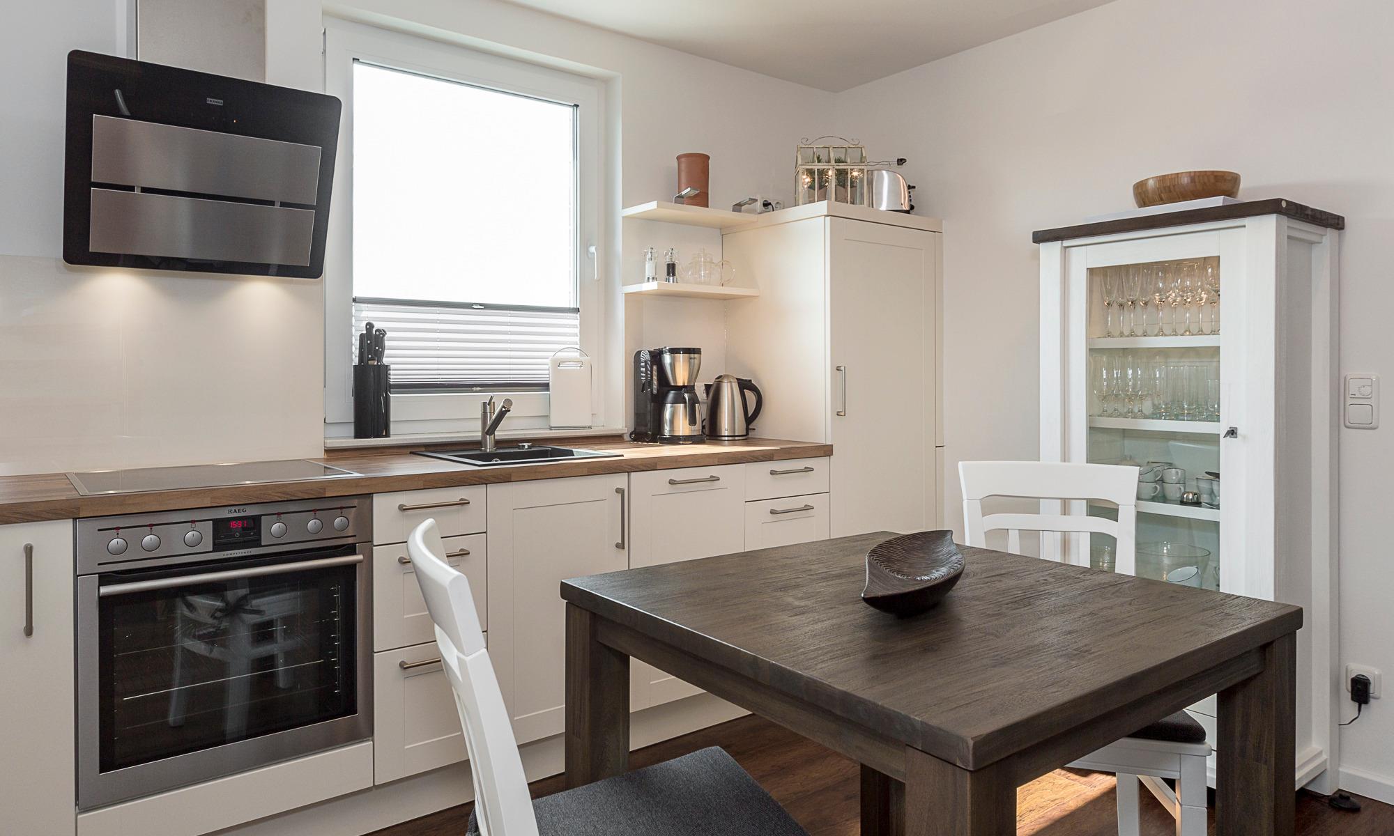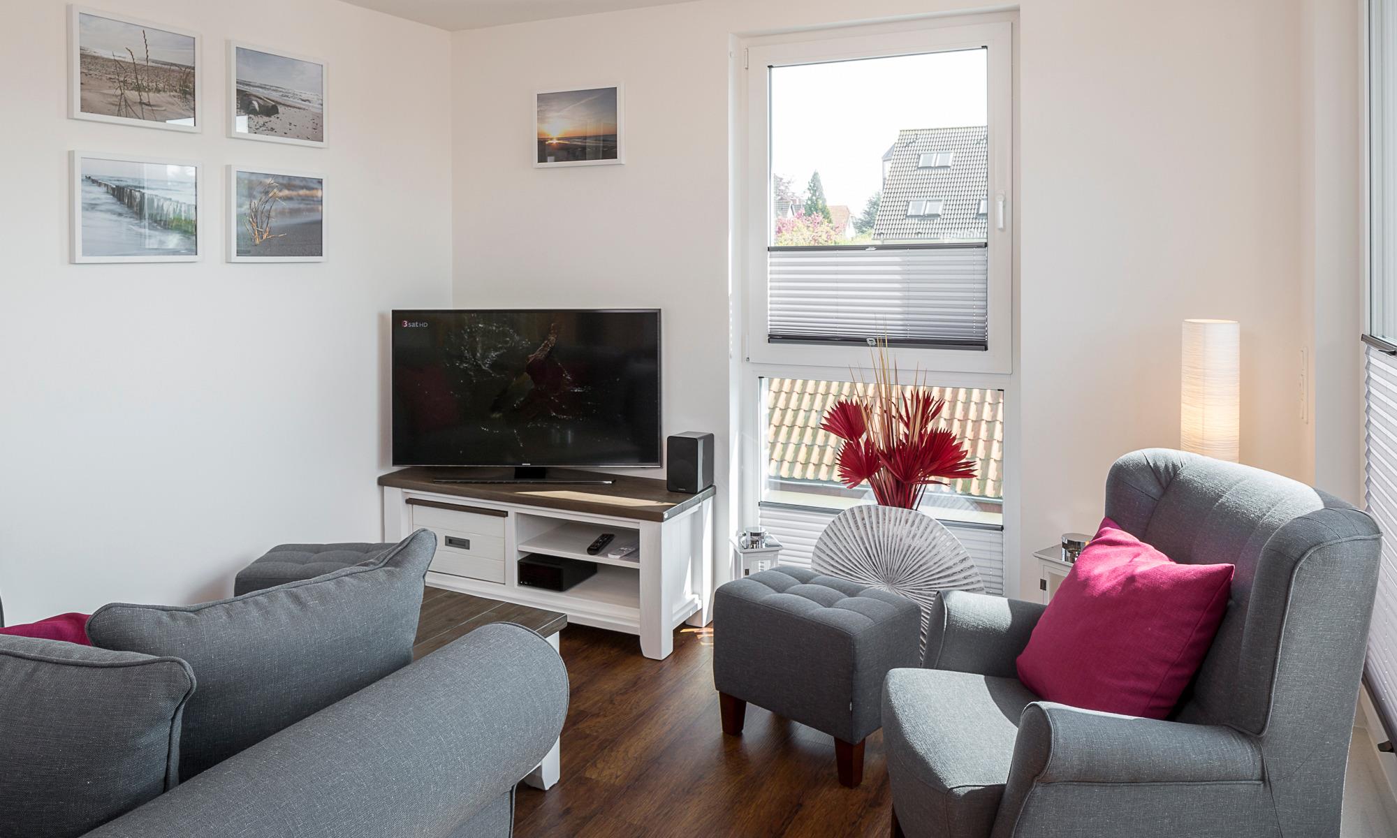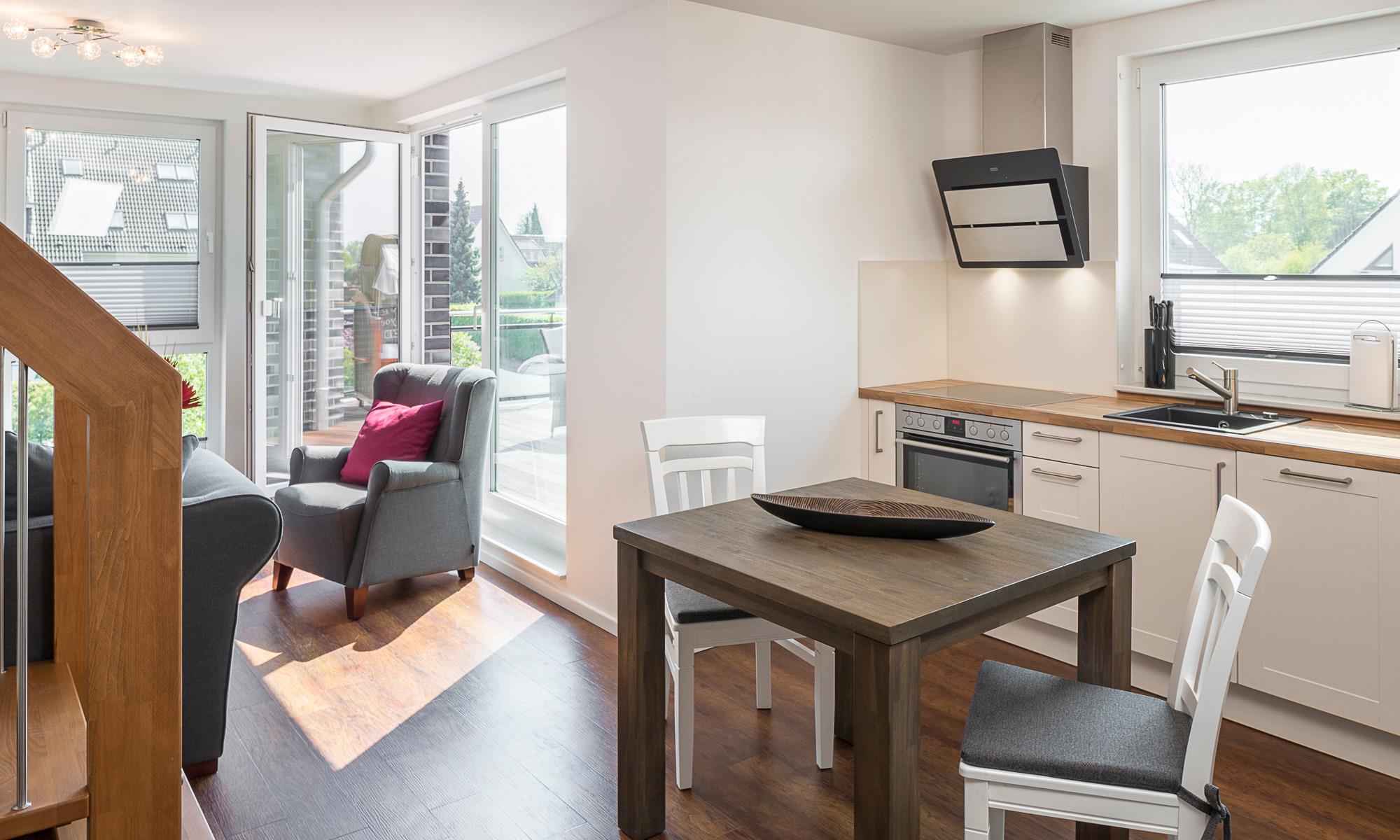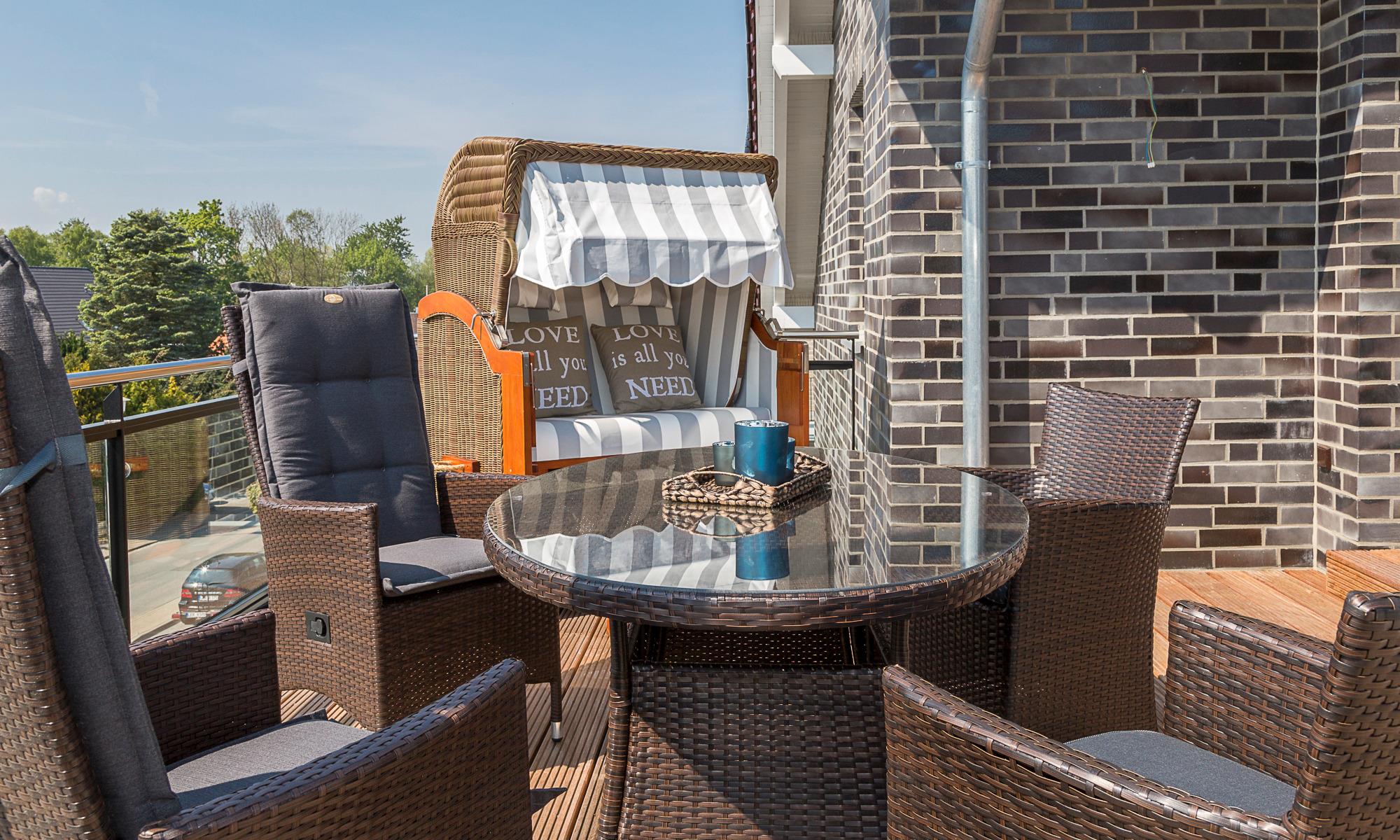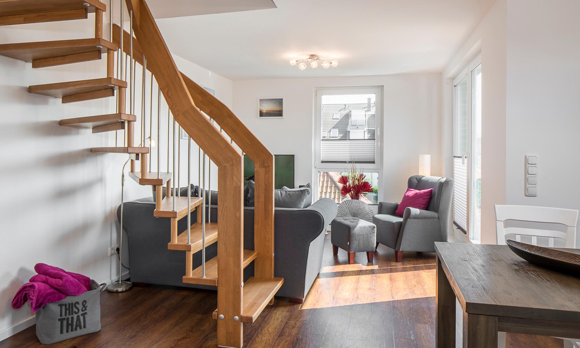 Diese Ferienwohnung bietet Ihnen auf der ersten Ebene einen gemütlichen Wohn-Essbereich mit einer Couch und einem schönen Esstisch.[nbsp][nbsp]Neben dem Flachbildfernseher steht Ihnen eine Stereoanlage zur Verfügung. Kostenloses WLAN ist selbstverständlich. Hier befinden sich auch die moderne Küche mit Induktionsherd, die[nbsp][nbsp]keine Wünsche offenlässt, und das helle Tageslichtbad mit einer Superplan-Dusche und einem großen Spiegel. Neben der Fußbodenheizung ist hier ein zusätzlicher Handtuchheizkörper angebracht. Auf dieser Ebene befindet sich ein weiterer Raum. Hier stehen Ihnen u. a. ein Kleiderschrank sowie Stauraum für Ihre Koffer zur Verfügung. Die Räume können mit Plissees verdunkelt werden. Der erste Balkon, in Süd-West-Ausrichtung, [nbsp][nbsp] verfügt über einen Tisch und Stühle sowie einen Strandkorb, die Dachterrasse in der zweiten Etage ist mit Liegen ausgestattet. Das Schlafzimmer auf der zweiten Ebene verfügt über eine geräumige Kommode, ein bequemes elektrisch verstellbares Boxspringbett (1,80 x 2,00m) und einen Flachbildfernseher. Über die Außenrollläden haben Sie die Möglichkeit, das Schlafzimmer nach Ihren Wünschen zu verdunkeln.