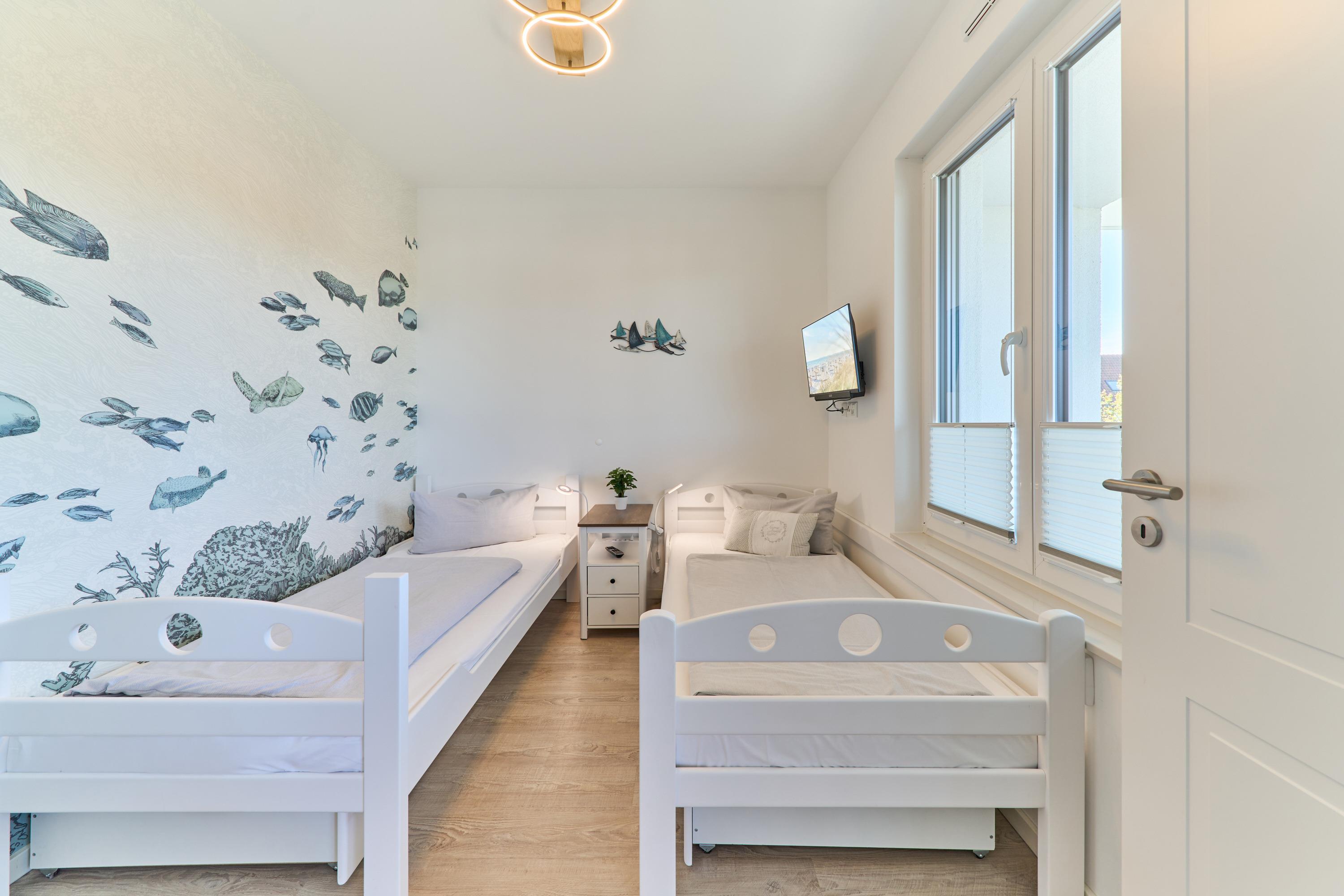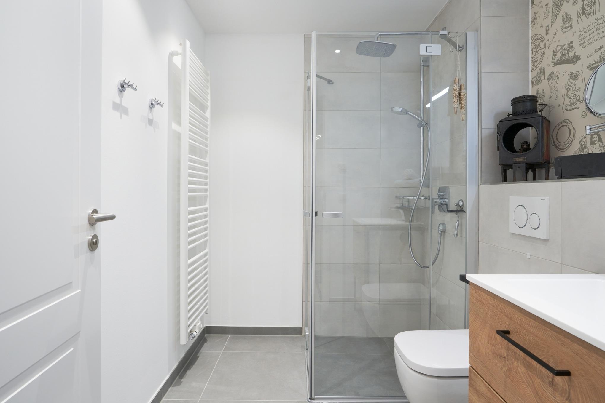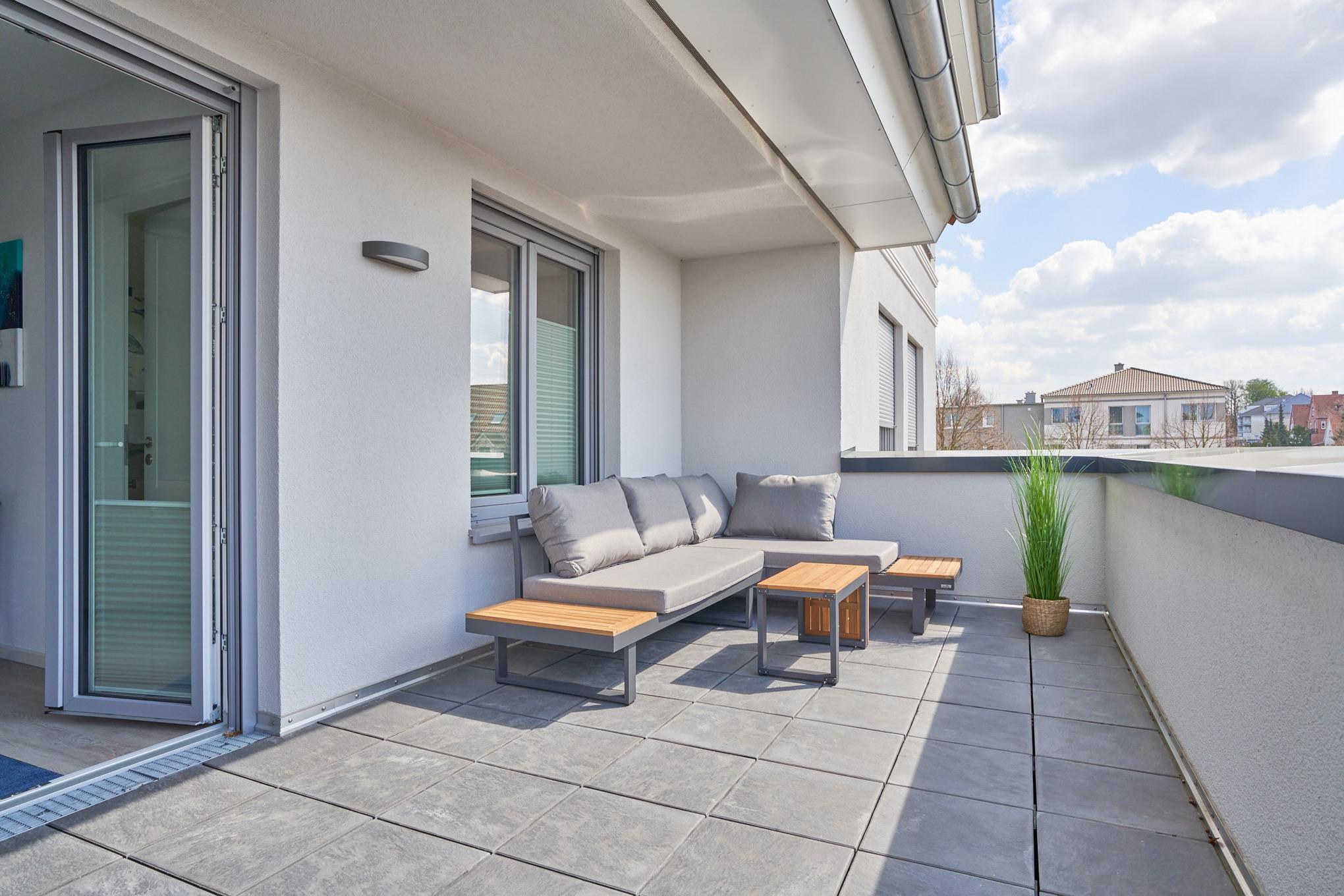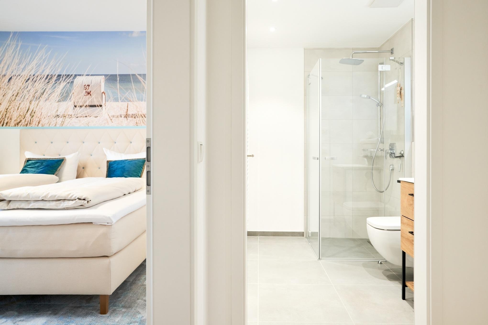 Die Küchenzeile hat einen Backofen, ein Ceran-Kochfeld, einen Geschirrspüler, einen Kühlschrank mit Gefrierschrank, eine Filterkaffeemaschine, eine Senseo-Kapselmaschine, einen Toaster und einen Wasserkocher. [nbsp] Der Wohnbereich ist mit einem bequemen Sofa, einem Wohnzimmertisch sowie[nbsp] einem TV ausgestattet. Aus dem Wohnbereich gelangen Sie auf die Dachterrasse nach Westen. Hier stehen Ihnen Tisch und Stühle sowie eine Lounge zur Verfügung. Das 1. Schlafzimmer ist mit einem Boxspringbett ( 1,80m x 2,00m), einem Kleiderschrank, 2 Nachttischen sowie einem Wand-TV eingerichtet. Im 2. Schlafzimmer stehen Ihnen zwei Einzelbetten, ein Wand-TV sowie ein Kleiderschrank zur Verfügung. Alle Fenster haben elektrische Außenrollläden. Das Duschbad in heller Optik mit bodengleicher Dusche / Regendusche mit separater Handbrause, Handtuchheizkörper, Fön, Kosmetikspiegel. Die gesamte Wohnung ist mit einer Fußbodenheizung ausgestattet.