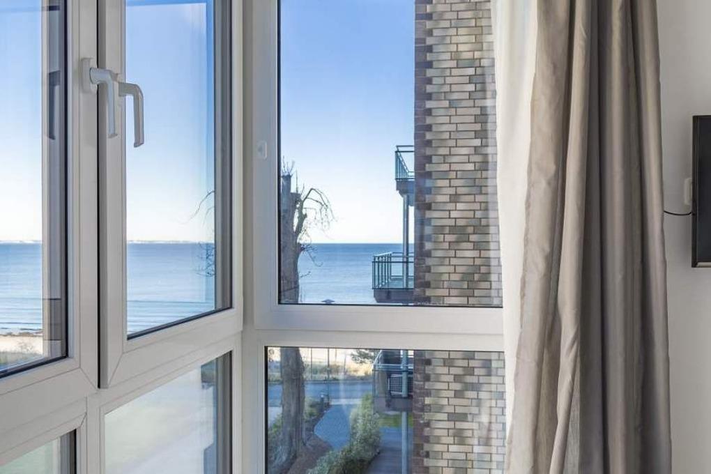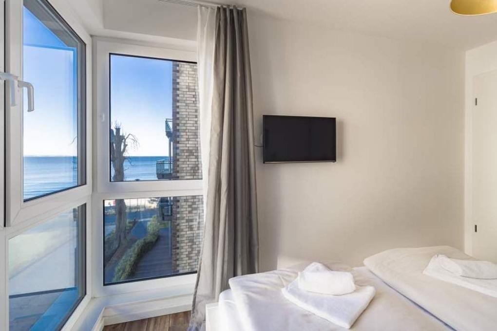 Die helle und lichtdurchflutete Wohnung ist modern und gleichzeitig gemütlich eingerichtet. Betreten Sie die Wohnung über einen hellen und einladenden offenen Flurbereich. In der gesamten Wohnung finden Sie bodentiefe Fenster mit elektrischen Rollläden und Fußbodenheizung, die schallschluckenden Fußbodenplanken sind im Yachtdesign verlegt. Im ersten Schlafzimmer genießen Sie einen herrlichen Blick auf das Meer und den Strand der Lübecker Bucht. Hier erkennen Sie spätestens den Zusammenhang in der Namensgebung der Ferienwohnung: Sand et Meer. An das Schlafzimmer schließt sich das Bad an. Hier finden Sie eine edle Designfliese im Kreuzverbund, die auf die geschmackvolle Sanitäreinrichtung abgestimmt ist. Ein besonderes Highlight des Badezimmers ist die Walk-in-Dusche, von der Sie durch ein breites Lichtband während des Duschens den wunderbaren Meerblick aufnehmen können. Das gemütliche zweite Schlafzimmer ist mit einem Einzelbett ausgestattet, bietet einen schönen Teil-Meerblick und ist ein Rückzugsort zum Verweilen und Entspannen. Selbstverständlich stehen in allen Zimmern ein Flatscreen-TV, freies WLAN und eine Radio-CD-Anlage zur Verfügung.