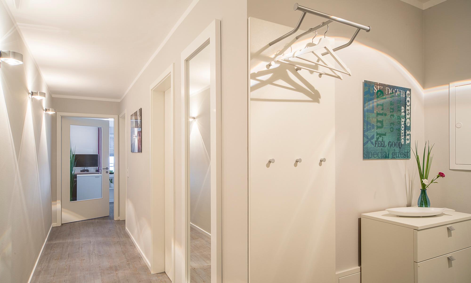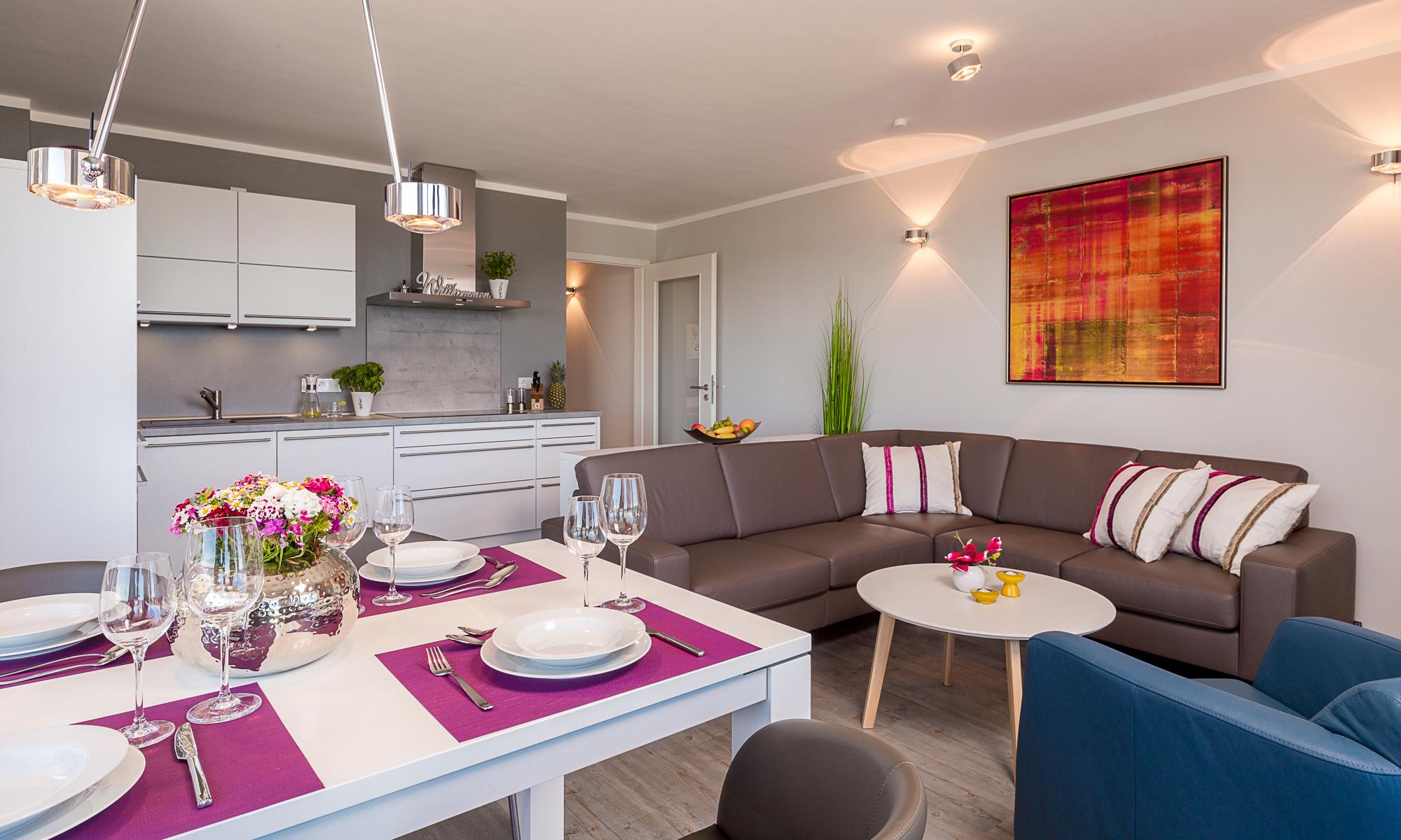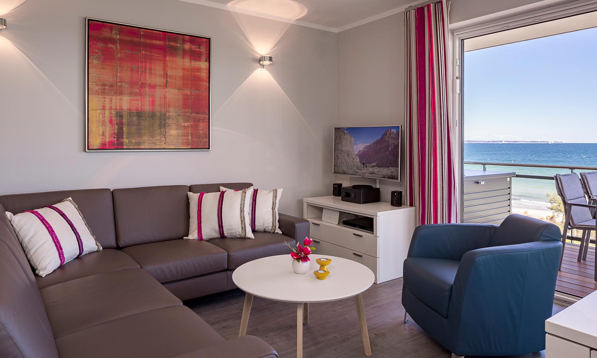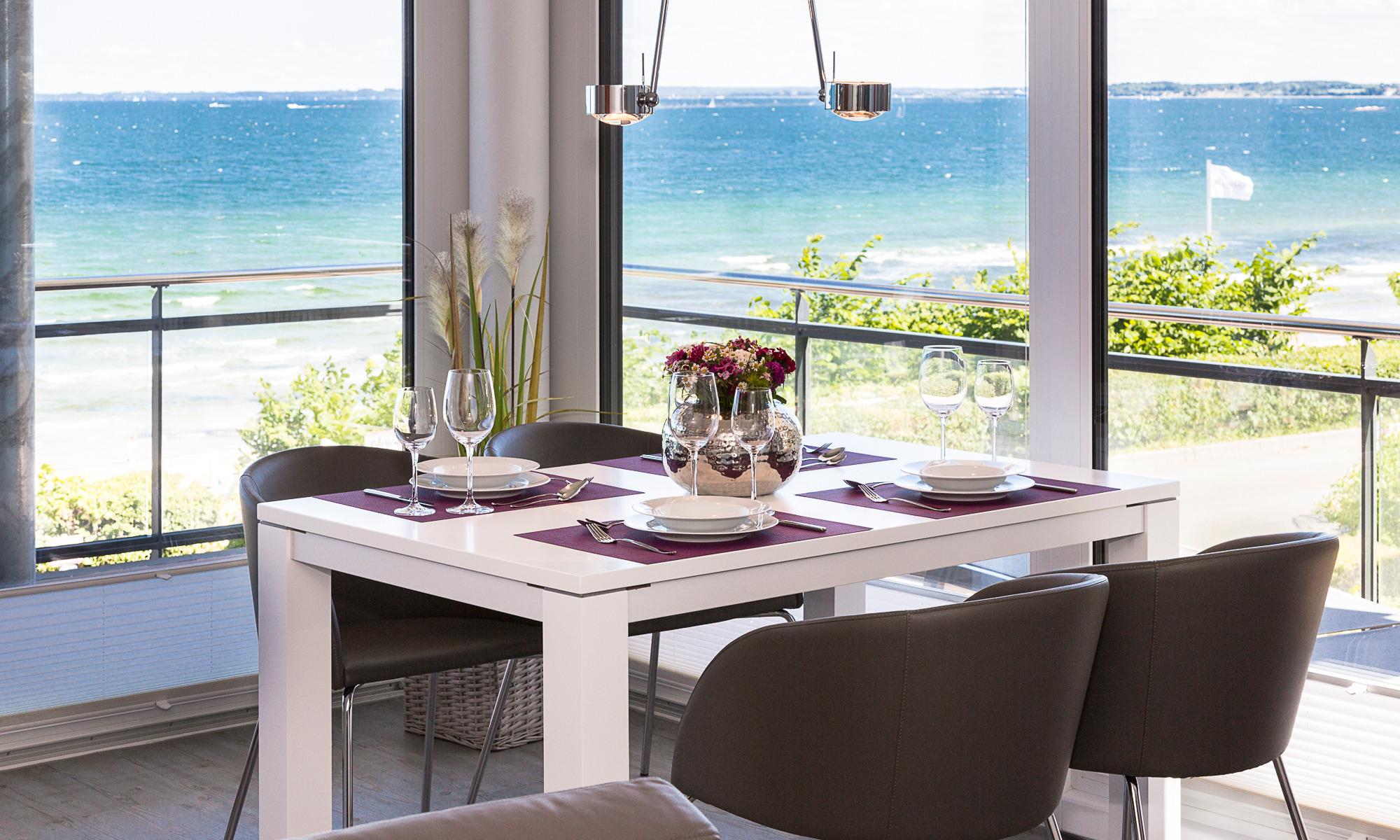 Bereits beim Betreten der Wohnung können Sie vom Flur aus auf die Ostsee schauen. Auch alle weiteren Räume bieten Ihnen einen herrlichen Blick auf die Ostsee. Der Eingangsbereich ist mit einer bequemen Garderobenbank und –panel sowie einem großen Schuhschrank ausgestattet. Der Wohnbereich ist großzügig eingerichtet und durch die bodentiefen Fenster mit Südausrichtung sehr hell. Ein Sicht- bzw. Lichtschutz ist ebenso vorhanden wie elektrische Rollläden. Von der sehr komfortablen Leder-Eckcouch[nbsp] können Sie den herrlichen Meerblick genießen. Ein großer Tisch mit vier bequemen Schalenstühlen bietet ausreichend Platz. Ein drehbarer Flachbildschirm mit Heimkino-Anlage inklusive Blu-ray-Player lässt keine Wünsche offen. Per Smartphone direkt via Bluetooth verbinden und eigene Musik hören oder auch nur das Radio einschalten. Der Wohnbereich wird geschickt durch ein Sideboard von der Küche optisch getrennt. Die offene Designerküche mit weißer Mattlackoberfläche ist mit hochwertigen Elektrogeräten von Siemens ausgestattet: Induktionsherd, Backofen mit integrierter Mikrowelle, Geschirrspüler, Kühl-/Gefrierkombination, Wasserkocher, Toaster, Filter- und Kapsel-Kaffeemaschine.