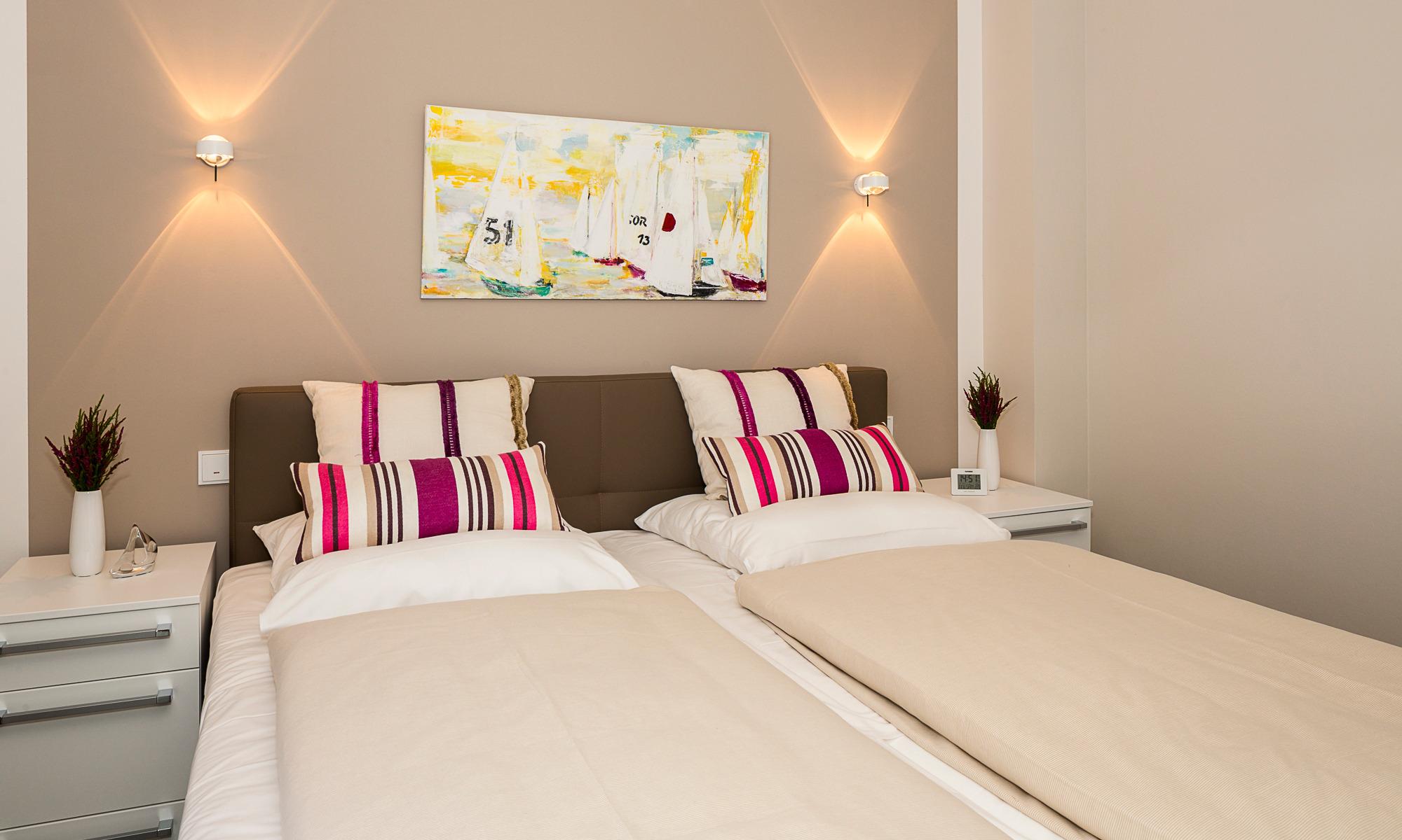 Die beiden Tageslichtbäder mit hellen, sandfarbenen Fliesen sind mit einer bodengleichen Dusche (Regenkopf- und Handbrause), jeweils einem Waschtisch mit Unterschrank von Villeroy und Boch, je zwei Handtuchhaltern, Handtuchheizkörper, Fußbodenheizung, Föhn, Kosmetikspiegel und jeweils einem Leuchtspiegel von Zierath sehr schön ausgestattet. Ein Radio von Busch Jaeger, verbunden mit eingebauten Deckenlautsprechern, sorgt für ein angenehmes Musikerlebnis. Die beiden Schlafzimmer verfügen über gemütliche Boxspringbetten (180 x 200m) der Marke Vito, einen Kleiderschrank mit Schiebetüren von Hülsta (Innenschubkästen, Einlegeböden, Kleiderstange), zwei Nachtkonsolen von Hülsta und einen Flachbildschirm von Panasonic. Ein Sicht- bzw. Lichtschutz ist ebenso vorhanden wie elektrische Rollläden. Der Balkon mit optimaler Süd-/Ostausrichtung begrüßt seine Gäste bereits zum Frühstück mit einem Platz an der Sonne. Ein großer Tisch mit vier Stühlen aus hochwertigem Aluminium lädt zu gemütlichen Stunden ein. Auf einer Rollenliege kann zusätzlich entspannt werden. In einer großen Stauraumkiste können nicht nur ihre Koffer platzsparend aufbewahrt werden, hier finden Sie auch Auflagen für Liege und Sessel. Ein großer, höhenverstellbarer Sonnenschirm rundet das Angebot auf dem Balkon ab. Wir freuen uns auf Sie!