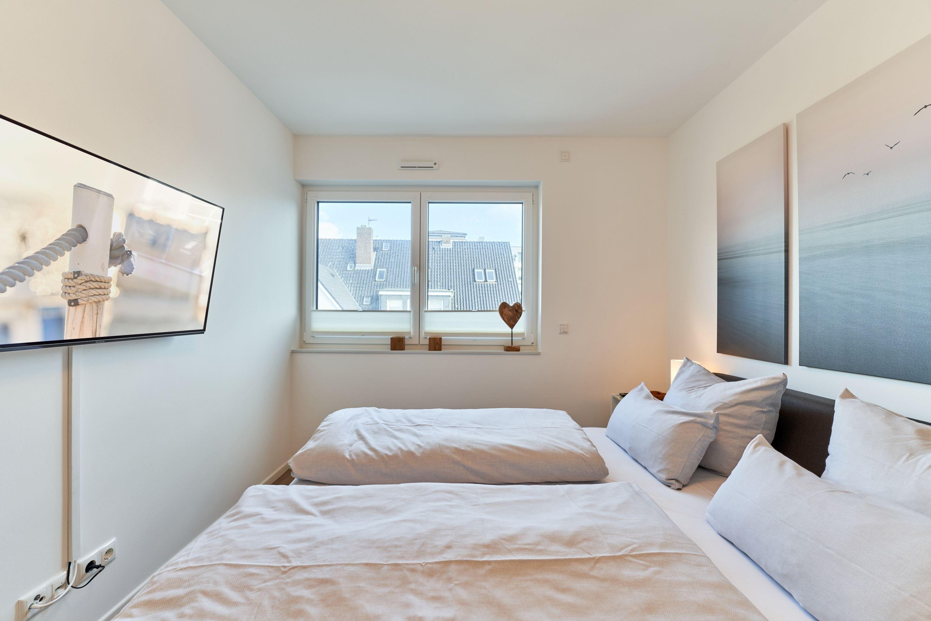 Im Wohnzimmer stehen Ihnen ein OLED-TV-Gerät, ein TechniSat-Digitradio und eine SONOS-Soundbox zur Verfügung. Weiterhin wartet auf Sie ein anspruchsvoller Wohn-Essbereich.[nbsp] Vom Sofa aus haben Sie einen weiteren Teil-Ostseeblick. Großer runder Esstisch, der sich auch für fröhliche Spielabende eignet. Das erste Schlafzimmer ist mit einem sehr bequemen Doppelbett (1,80m x 2,00m), einem OLED-TV-Gerät, einem Kleiderschrank sowie Nachttischen ausgestattet. Im 2. Schlafzimmer stehen ein ebenso hochwertiges Doppelbett (1,80mx2,00m), ein OLED-TV-Gerät und ein kleiner Kleiderschrank für Sie bereit. [nbsp] Das Tageslicht-Duschbad ist mit einem Handtuchheizkörper sowie einer bodengleichen Dusche ausgestattet. Kosmetikspiegel sowie ein Haartrockner sind hier selbstverständlich vorhanden.
