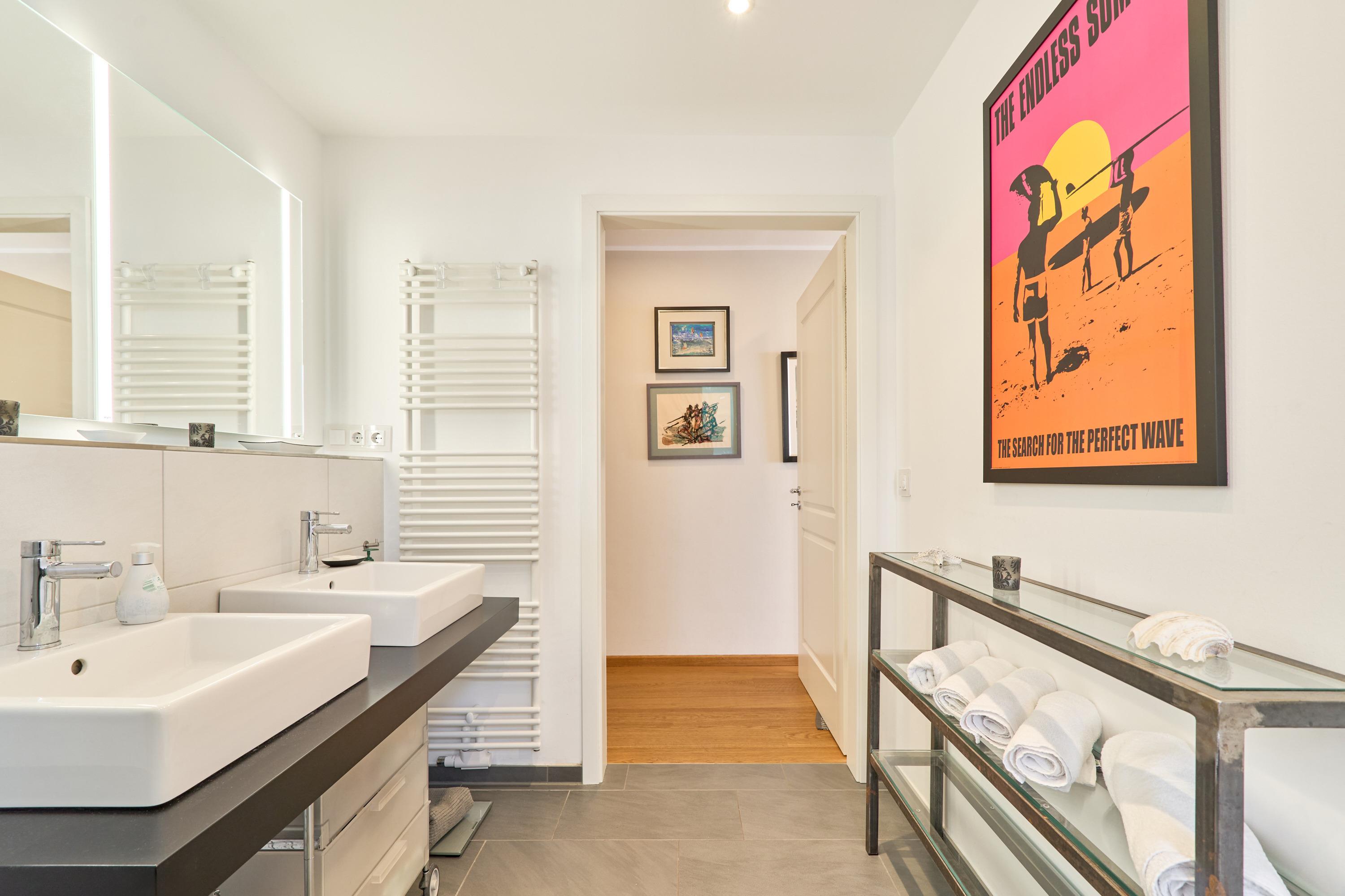 Das große Schlafzimmer ist mit einem Doppelbett (180 x 200m) und einem geräumigen Kleiderschrank ausgestattet. Das zweite Schlafzimmer verfügt über ein französisches Doppelbett (160 x 200m), einen Flach-TV und einen Kleiderschrank. Die beiden Tageslichtbäder haben jeweils eine ebenerdige Duschkabine. In dem zweiten Badezimmer befindet sich eine Waschmaschine mit Trocknerfunktion.
