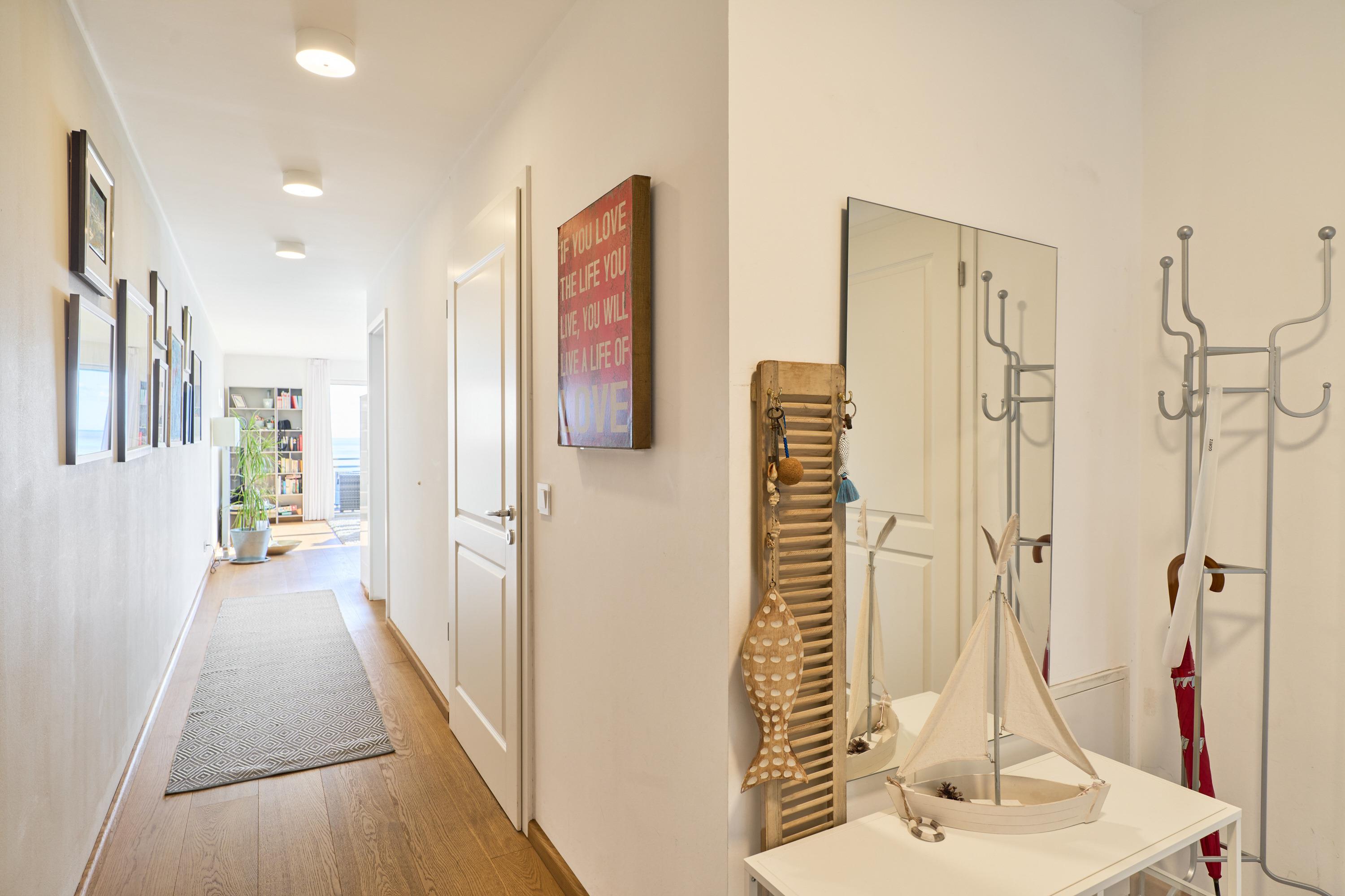 Bereits im Flur können Sie schon auf die Ostsee blicken und weiter … Aus allen Räumen haben Sie Ostseeblick! In dieser traumhaften Wohnung werden Sie sich gleich wohlfühlen.[nbsp] Das Sofa bietet Ihnen einen besonderen Sitzkomfort. Ihr Heimkinosystem bietet Ihnen Blu-ray, TV in 55 Zoll und ein 3-D-Soundsystem. Der Essbereich hat genügend Platz für vier Personen. Die anspruchsvolle Küche ist mit hochwertigen Elektrogeräten ausgestattet. Geschirrspülmaschine, Induktionsherd, Mikrowelle, Backofen, Wasserkocher, Kaffeemaschine, Pad-Kaffeemaschine und vieles mehr. Der halbumlaufende Balkon ist mit Loungemöbeln ausgestattet – träumen Sie schon?