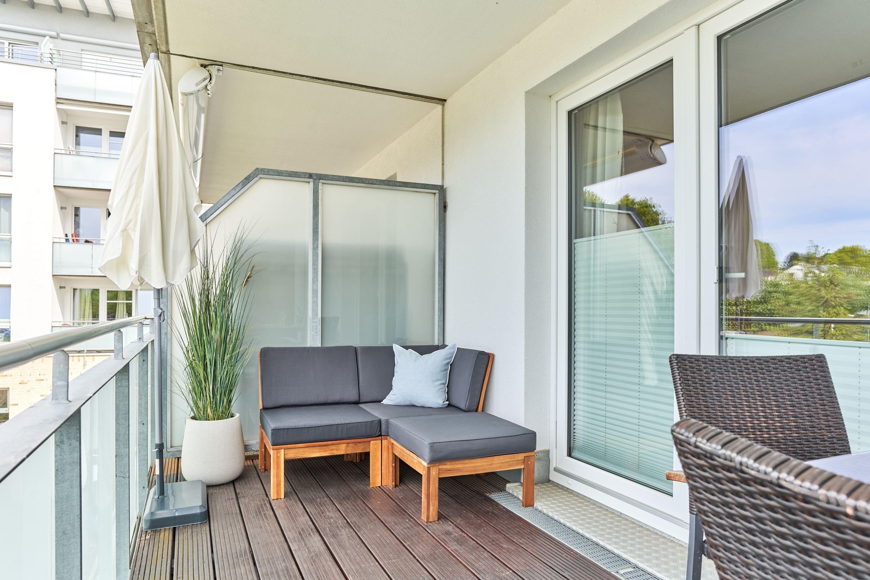 Helle und freundliche 3-Zimmer-Ferienwohnung, ca. 67 m², für bis zu 4 Personen, Westbalkon, Duschbad mit Waschmaschine. Tiefgaragenstellplatz, Einfahrtshöhe 1,98 m, Lademöglichkeit für elektrische Fahrzeuge, Fahrstuhl