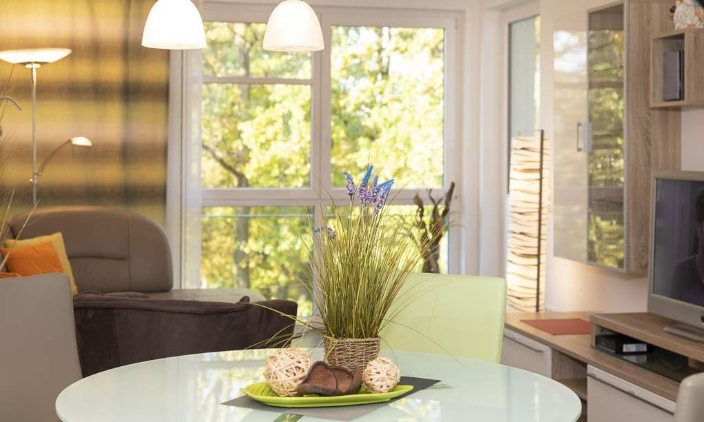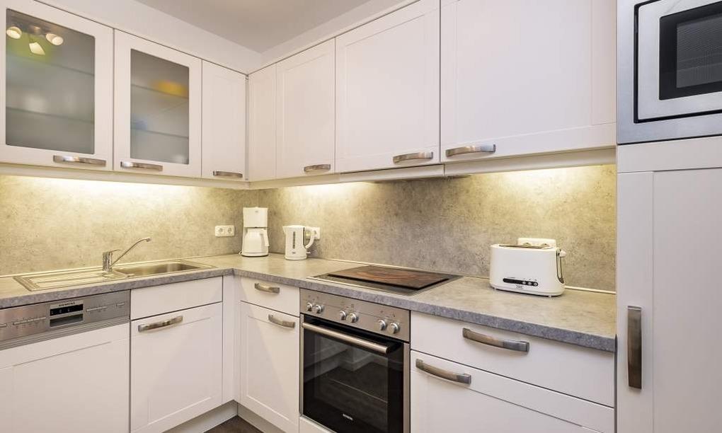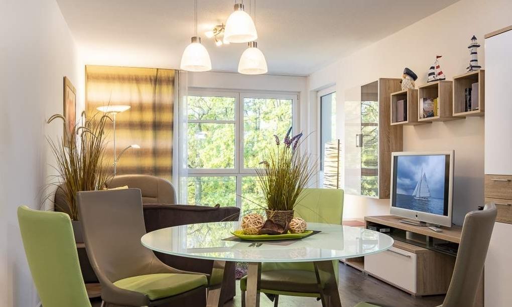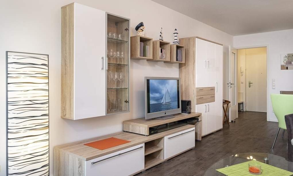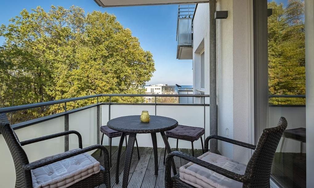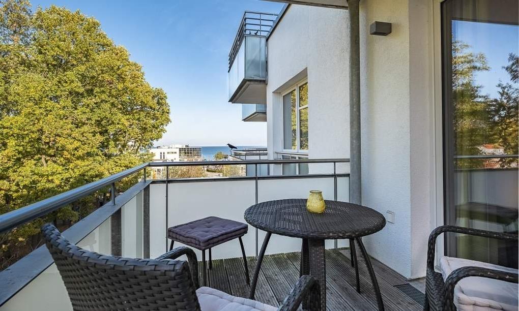 Der helle Wohnbereich mit bodentiefen Fenstern bietet einen Essplatz für 4 Personen, ein gemütliches Sofa, das sich mit wenigen Handgriffen in eine Schlafcouch (1,70 x 2,00m) verwandeln lässt, einen Flachbild-TV, WLAN, eine iPod-Dockingstation, einen Blue-Ray-Player, eine Stereoanlage und einen Safe. Die voll ausgestattete Küche lässt keine Wünsche offen. Vom Balkon aus hat man einen seitlichen Blick aufs Meer und die Aussicht in den Kurpark. Ein komfortables Doppelbett (1,80 m x 2,00 m) sorgt im Schlafzimmer für eine erholsame Nachtruhe. Hier finden Sie den zweiten Flachbild-TV. Im Badezimmer mit bodengleicher Dusche ist auch die Waschmaschine untergebracht. Die Wohnung liegt direkt gegenüber dem Kurpark, nur wenige Schritte von der Fußgängerzone und der Ostsee entfernt. Sie verfügt über einen Safe und einen abschließbaren Fahrradkeller.