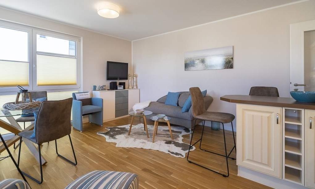 Diese modern und mit Liebe zum Detail eingerichtete Ferienwohnung, bietet Ihnen einen gemütlichen Wohn-Essbereich. Neben dem modernen Flachbildfernseher steht Ihnen eine HiFi-Anlage mit CD-Player zur Verfügung. Kostenloses WLAN ist selbstverständlich. Der überdachte Balkon mit Blick auf die Ostsee ist mit Tisch, Stühlen und einem Sonnenschirm ausgestattet. Die helle Küche im Landhausstil ist komplett ausgestattet und lädt zum aktiven Kochen ein.[nbsp] Neben einer Filterkaffeemaschine lädt eine Nespresso-Kapselmaschine zu einem perfekten Kaffeegenuss ein. Hier steht auch eine Waschmaschine zur Verfügung.