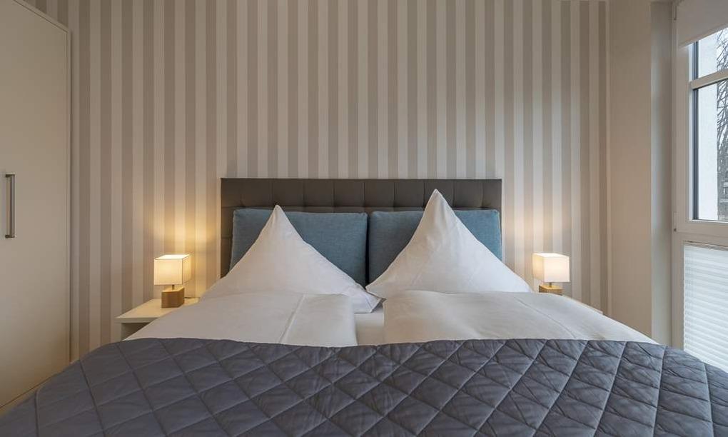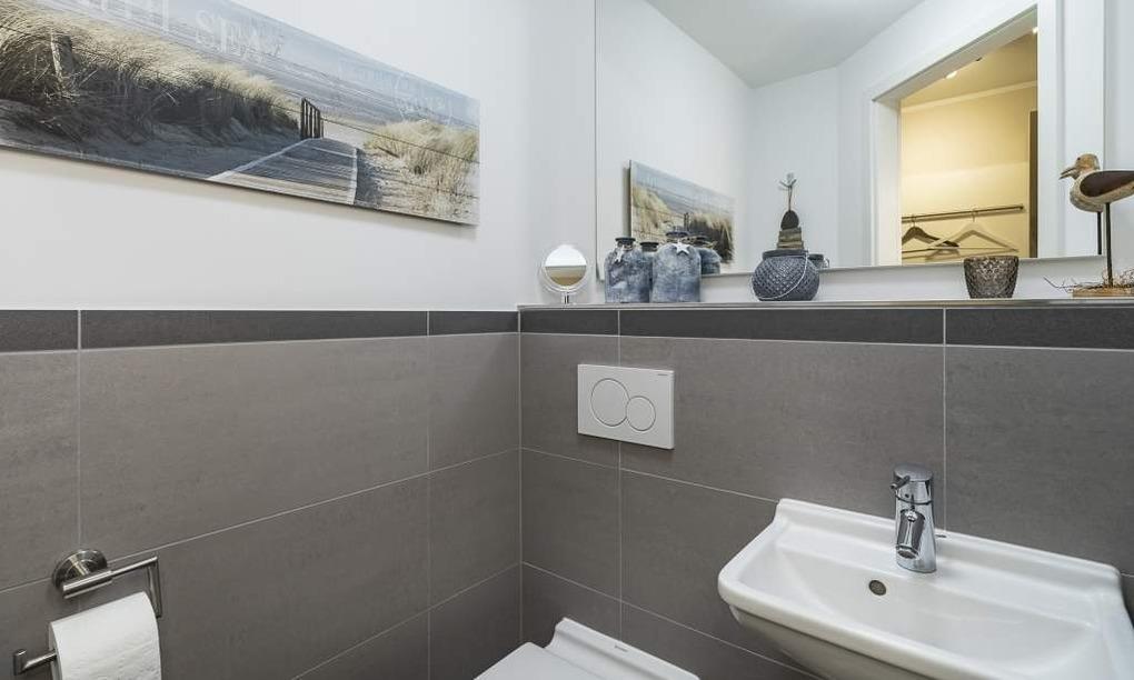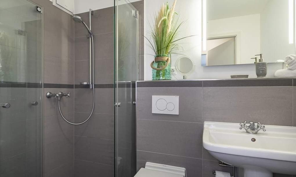 Im Schlafzimmer sorgt ein bequemes Doppelbett (1,80 x 2,00m) mit Qualitätsmatratzen für einen erholsamen Schlaf. Die Urlaubsgarderobe findet Platz im geräumigen Kleiderschrank. Für den zusätzlichen Komfort steht Ihnen auch hier ein stylischer Flachbildfernseher zur Verfügung. Alle Räume sind mit warmem Echtholzparkett und Fußbodenheizung ausgestattet. Bodentiefe Fenster garantieren viel Tageslicht und eine gute Aussicht. Das Badezimmer verfügt über eine bodentiefe Dusche und einen großen Spiegel. Neben der Fußbodenheizung ist hier ein zusätzlicher Handtuchheizkörper angebracht. Weiteres Highlight – eine zusätzliche Gäste-Toilette.