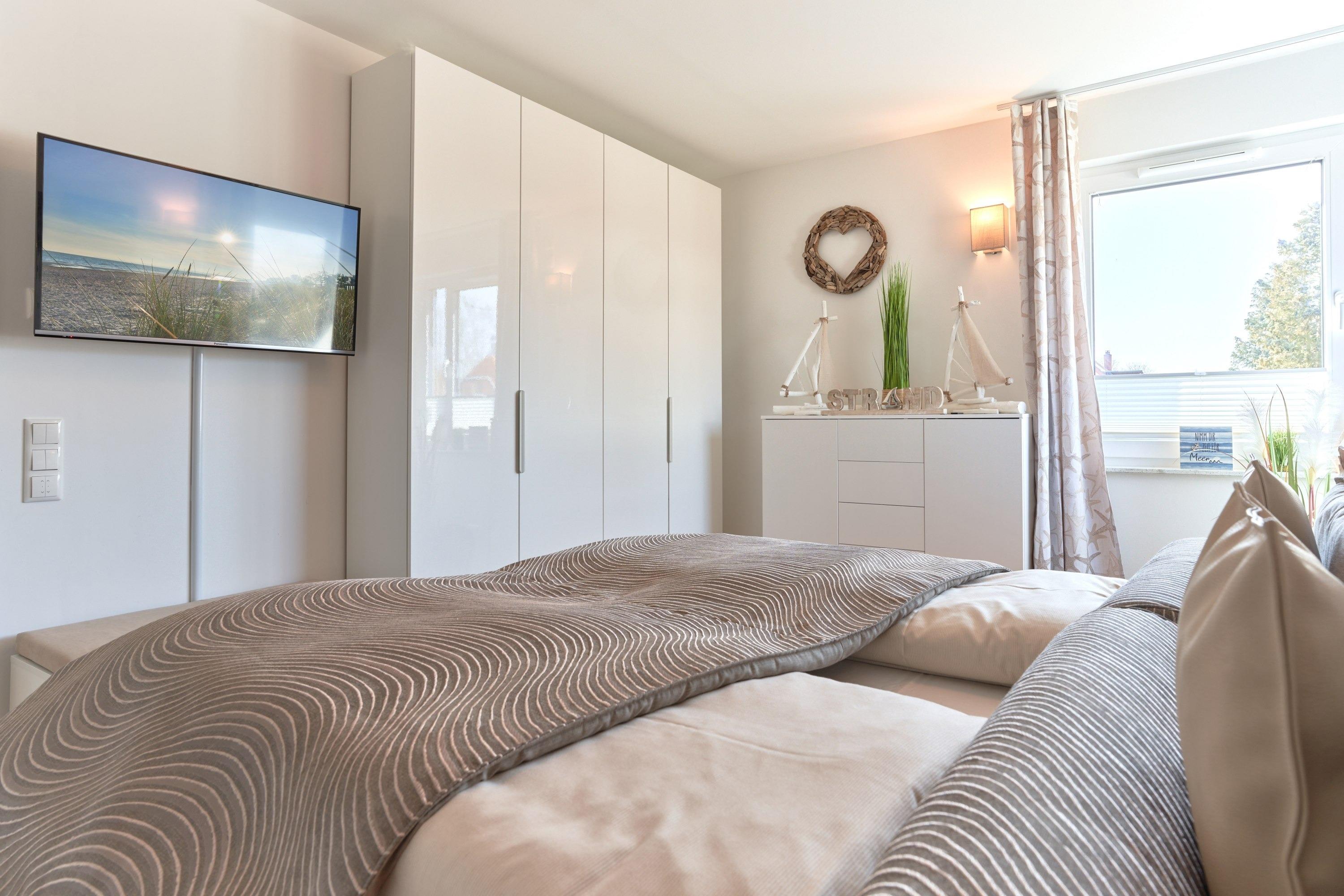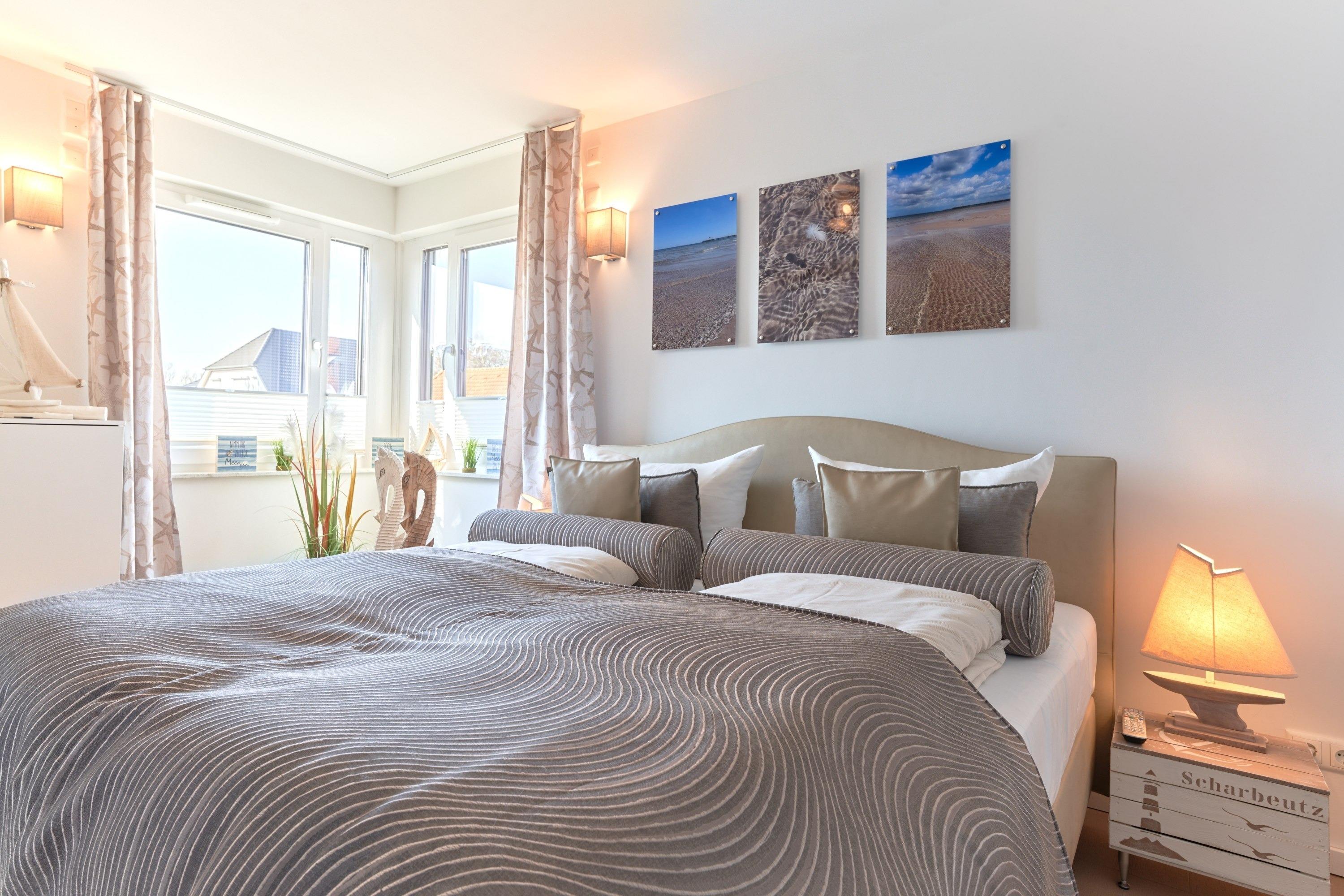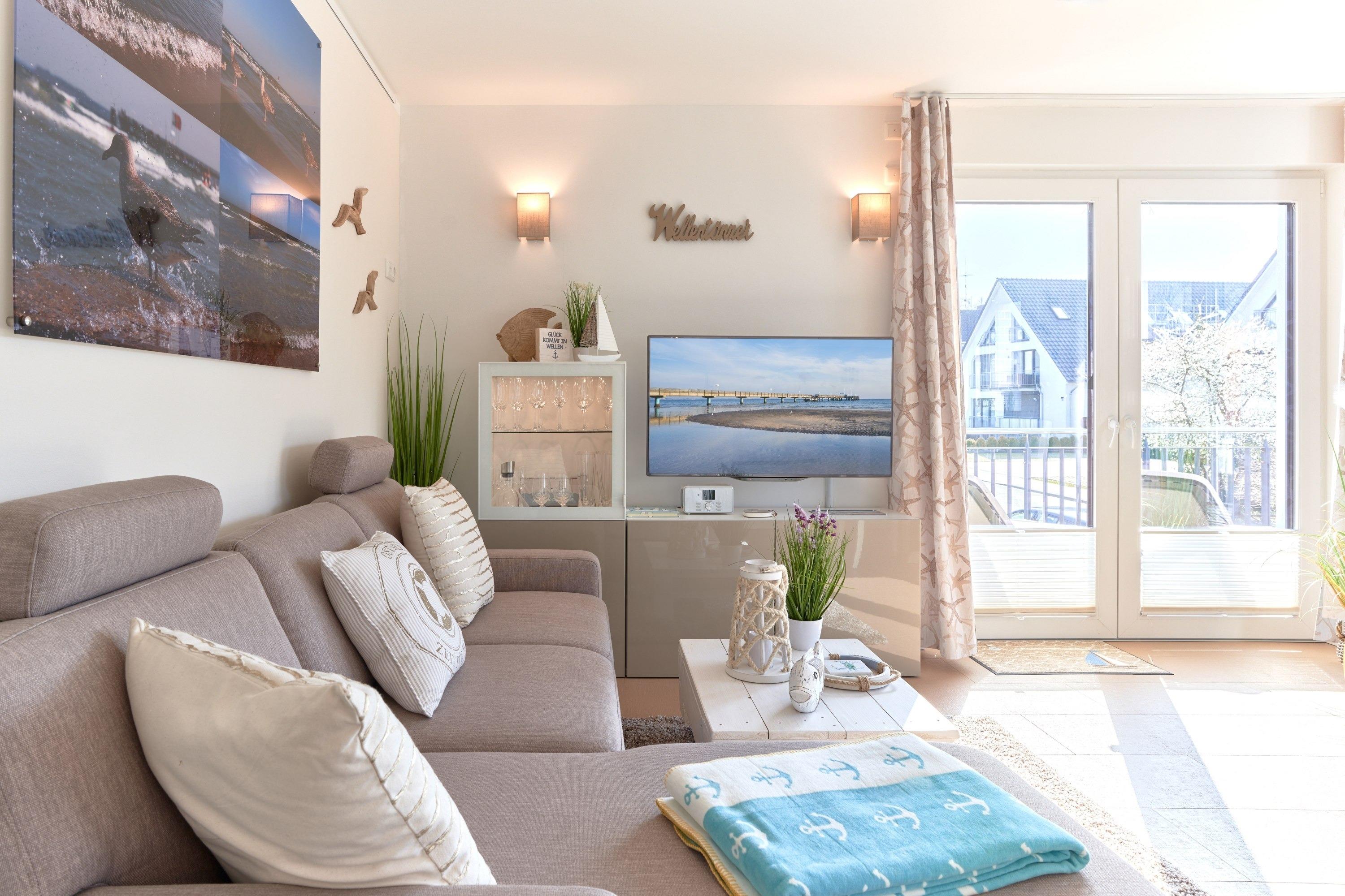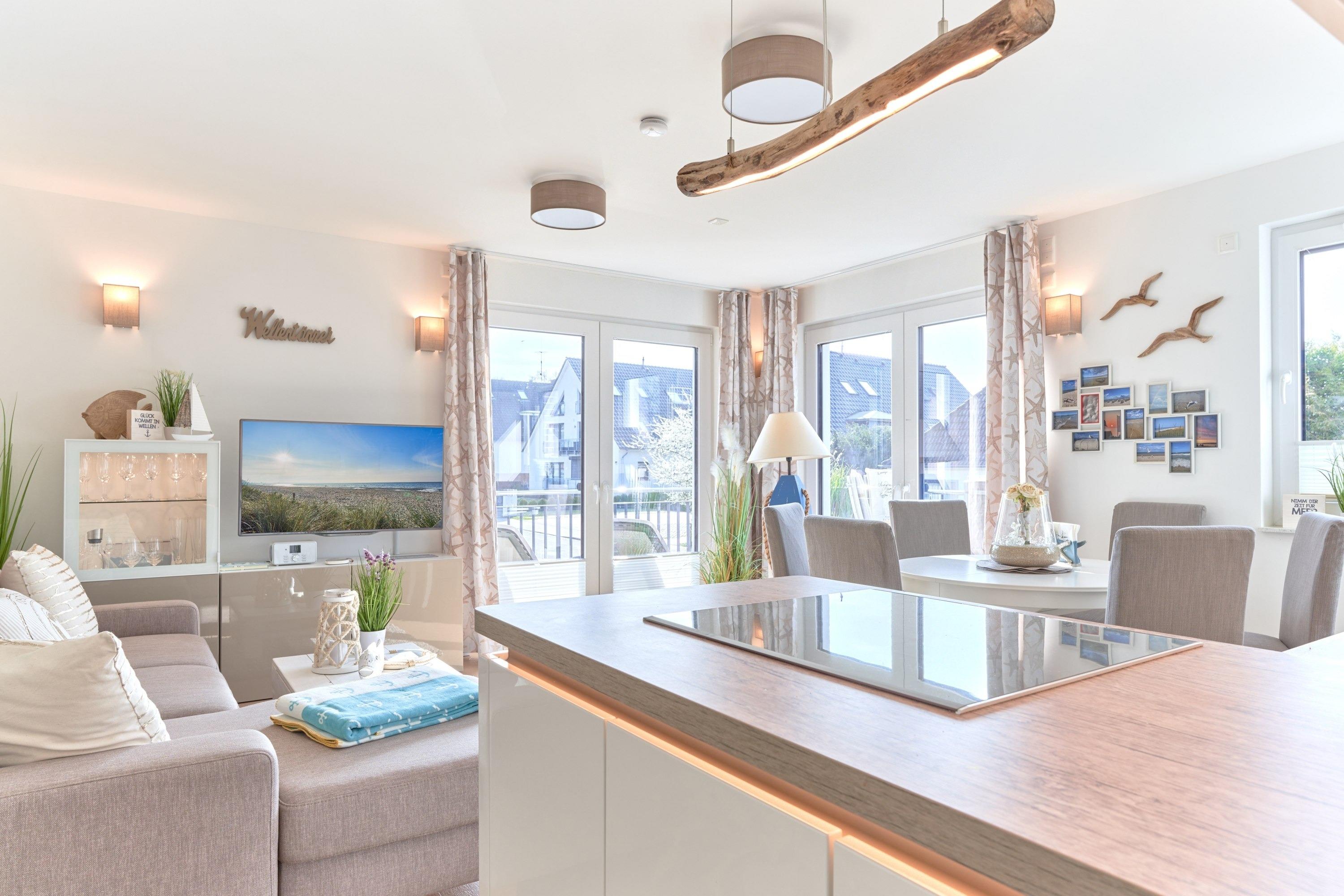 Genießen Sie Ihren Urlaub in dieser lichtdurchfluteten Ferienwohnung. Es warten auf Sie drei Schlafzimmer; 1. Schlafzimmer mit einem Doppelboxspringbett, 2. Schlafzimmer mit zwei Einzelboxspringbetten sowie ein 3. Schlafzimmer mit einem Einzelboxspringbett. Alle Zimmer lassen sich durch Außenrollläden verdunkeln, auch sind die Schlafzimmer je mit einem TV ausgestattet. Im Wohn-Essbereich erwartet Sie eine großzügige, helle sowie sehr gut ausgestatte[nbsp] Küche. Angrenzend ist der Essbereich, hier lässt es sich sehr gut sitzen, auch für lange Spielabende. Der Wohnbereich ist mit einem bequemen Sofa eingerichtet. TV und Musikanlage sind selbstverständlich ebenso wie das kostenlose WLAN. Auf dem Balkon stehen Ihnen zwei Liegen sowie ein Tisch mit vier Stühlen zur Verfügung. In heller Optik gehaltenes Duschbad mit bodengleicher Dusche, Handtuchheizkörper, Fön, Kosmetikspiegel.