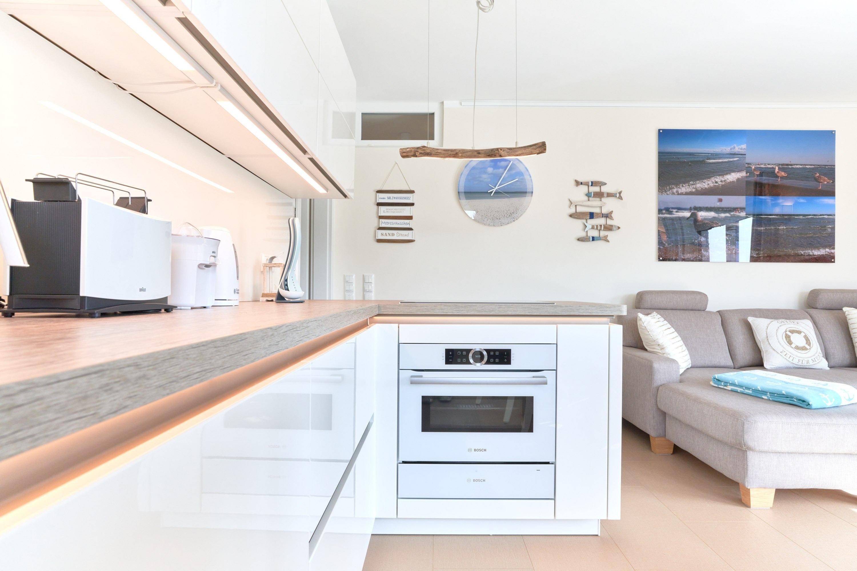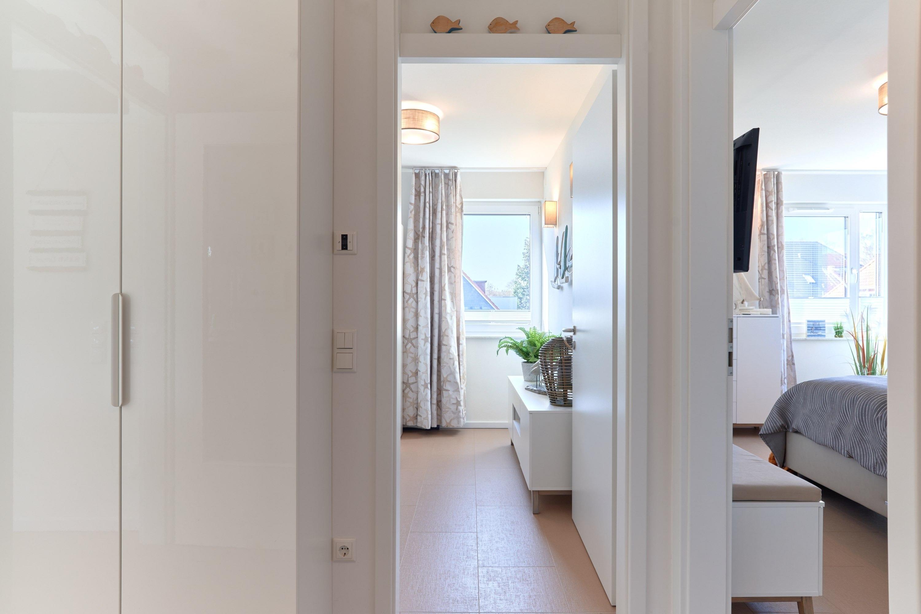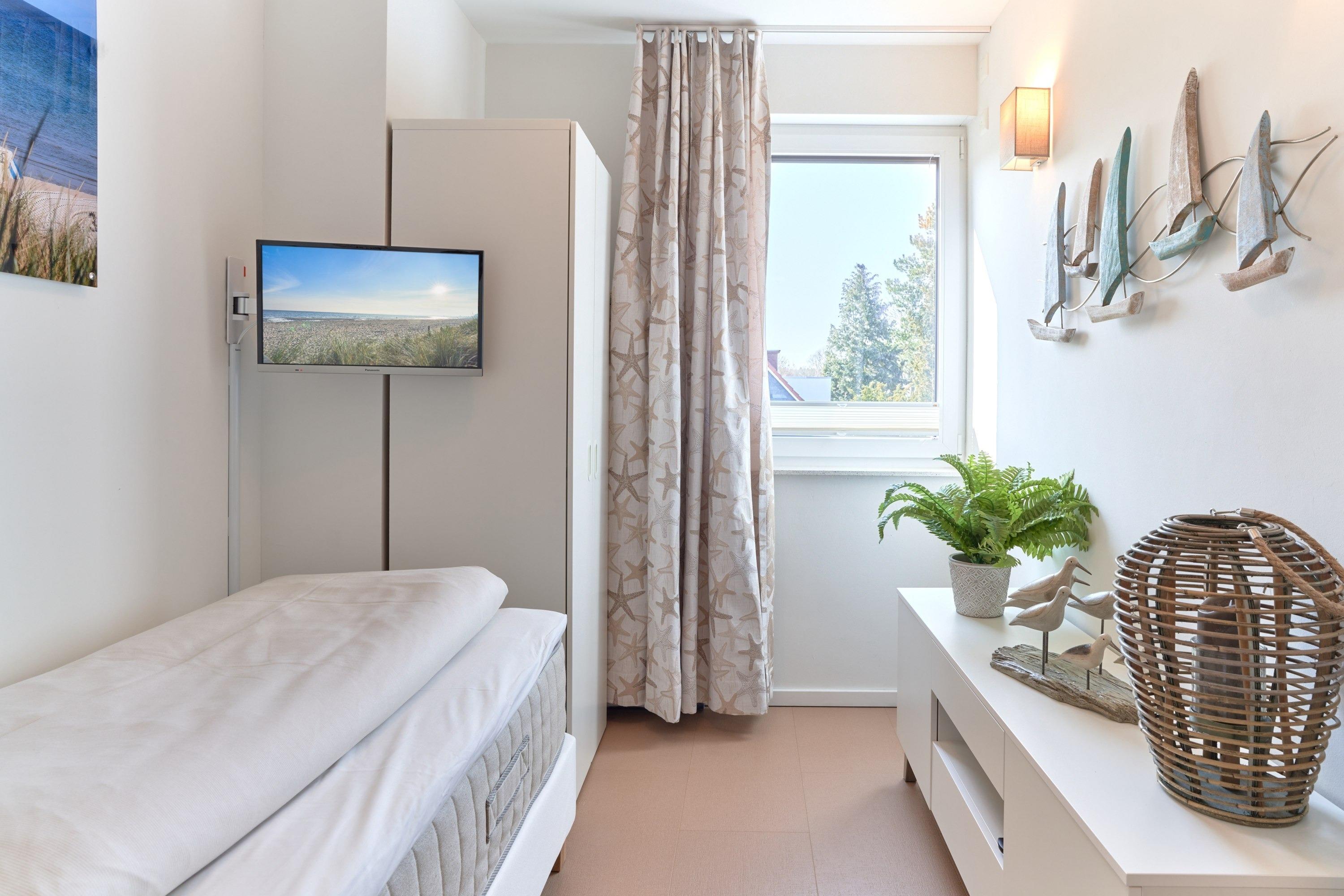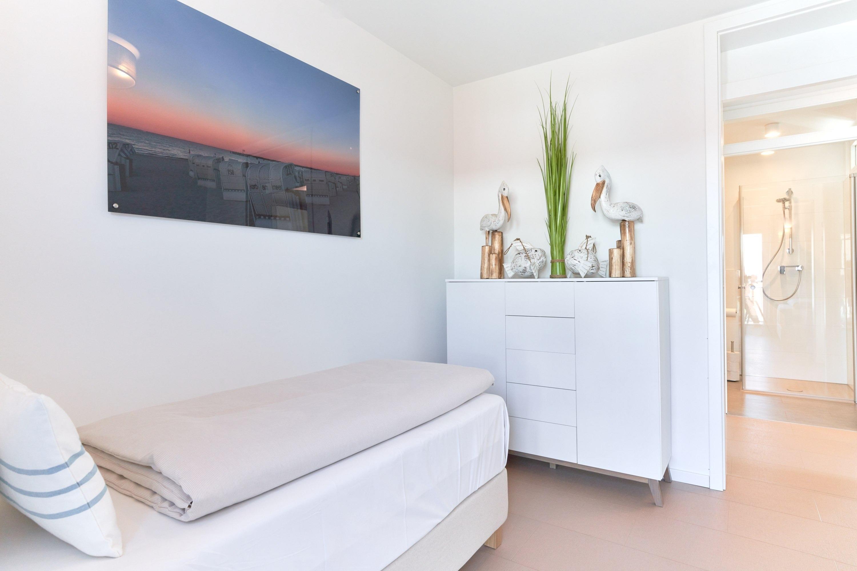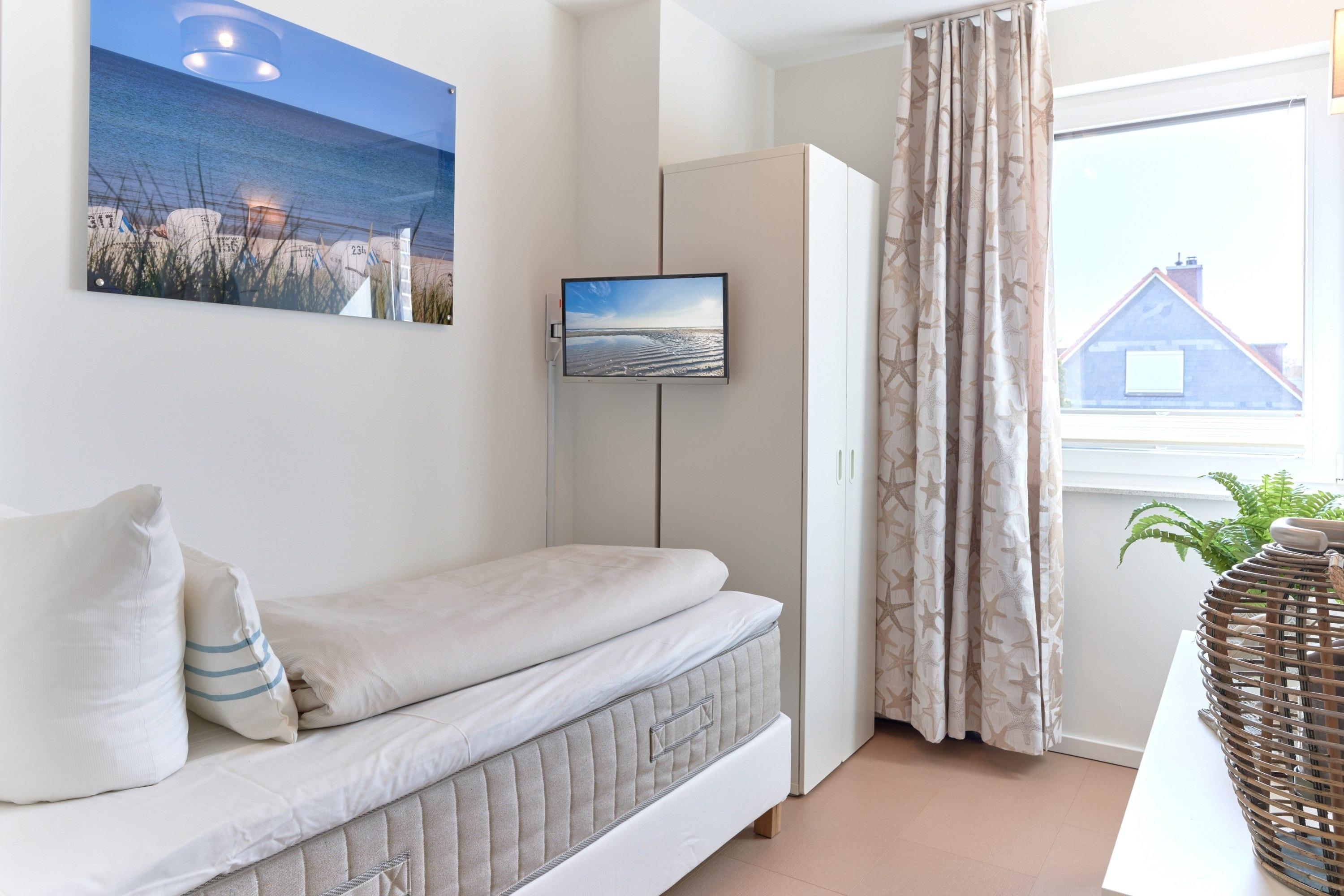 Genießen Sie Ihren Urlaub in dieser lichtdurchfluteten Ferienwohnung. Es warten auf Sie drei Schlafzimmer; 1. Schlafzimmer mit einem Doppelboxspringbett, 2. Schlafzimmer mit zwei Einzelboxspringbetten sowie ein 3. Schlafzimmer mit einem Einzelboxspringbett. Alle Zimmer lassen sich durch Außenrollläden verdunkeln, auch sind die Schlafzimmer je mit einem TV ausgestattet. Im Wohn-Essbereich erwartet Sie eine großzügige, helle sowie sehr gut ausgestatte[nbsp] Küche. Angrenzend ist der Essbereich, hier lässt es sich sehr gut sitzen, auch für lange Spielabende. Der Wohnbereich ist mit einem bequemen Sofa eingerichtet. TV und Musikanlage sind selbstverständlich ebenso wie das kostenlose WLAN. Auf dem Balkon stehen Ihnen zwei Liegen sowie ein Tisch mit vier Stühlen zur Verfügung. In heller Optik gehaltenes Duschbad mit bodengleicher Dusche, Handtuchheizkörper, Fön, Kosmetikspiegel.