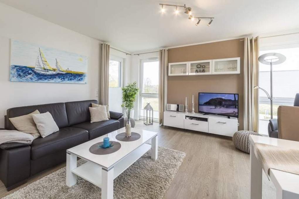 Diese Ferienwohnung bietet Ihnen einen gemütlichen Wohn-Essbereich mit einer Couch und einem schönen Esstisch. Die Couch lässt sich mit nur wenigen Handgriffen in eine bequeme Schlafcouch umfunktionieren. Neben dem Flachbildfernseher und dem BluRay-Player steht Ihnen eine Kompaktanlage Sony CMT-X3 [nbsp] zur Verfügung. Kostenloses WLAN ist selbstverständlich. Die überdachte Loggia ist mit Tisch und Stühlen ausgestattet. Die moderne Küche lässt keine Wünsche offen. Neben einer Kaffeemaschine steht zusätzlich eine Kaffeekapselmaschine von Tchibo für Sie bereit. Das Schlafzimmer ist mit einem geräumigen Schrank, einem bequemen Bett (2,00 x 1,80m, getrennte Matratzen) und einem Flachbildfernseher ausgestattet. Das helle Tageslichtbad verfügt über eine bodentiefe Dusche und einen großen Spiegel. Hier steht auch eine Waschmaschine zur Verfügung. Neben der Fußbodenheizung ist hier ein zusätzlicher Handtuchheizkörper angebracht.