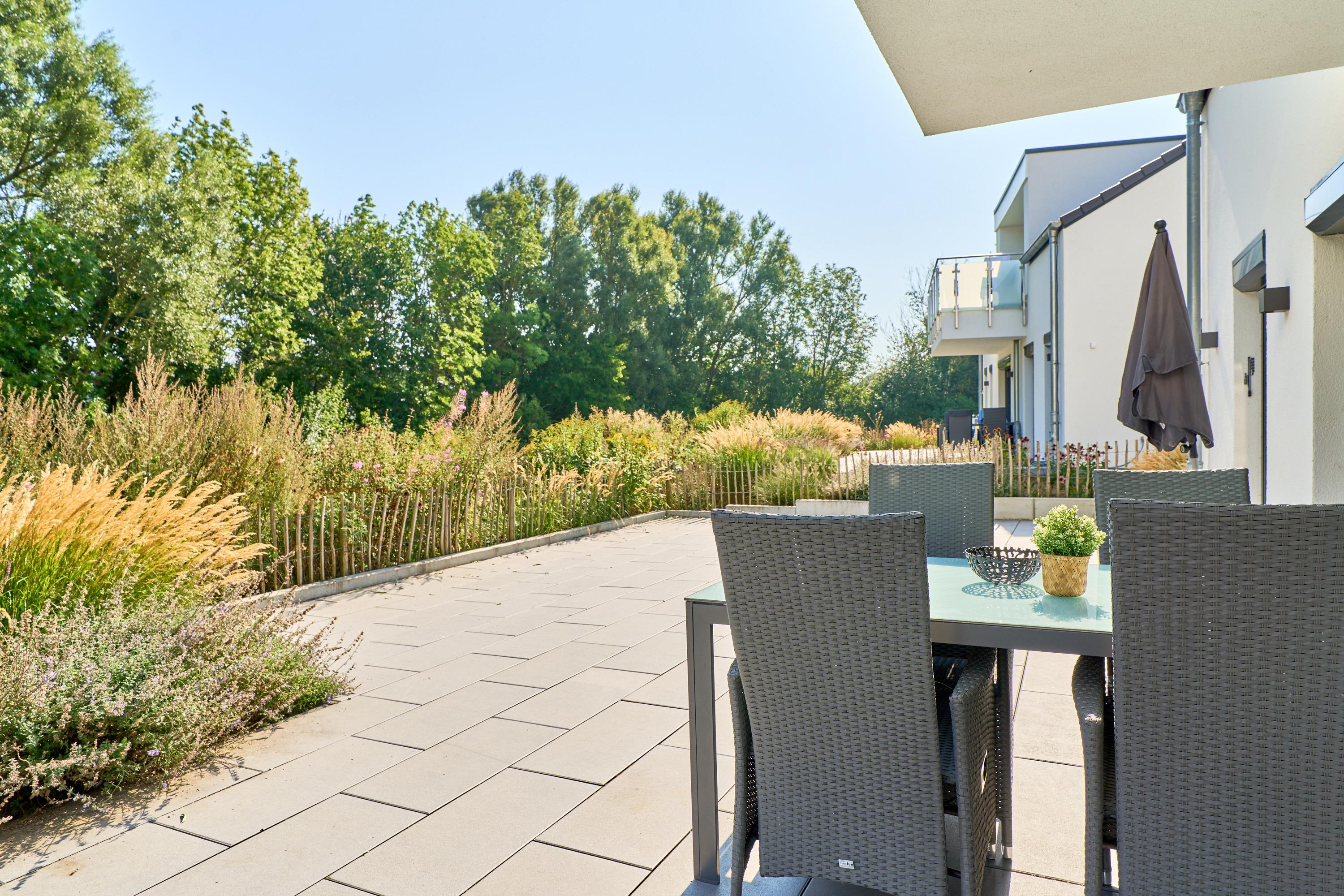 Auf der eingezäunten, großen Terrasse stehen Ihnen Tisch und Stühle zur Verfügung, Blick ins Grüne.