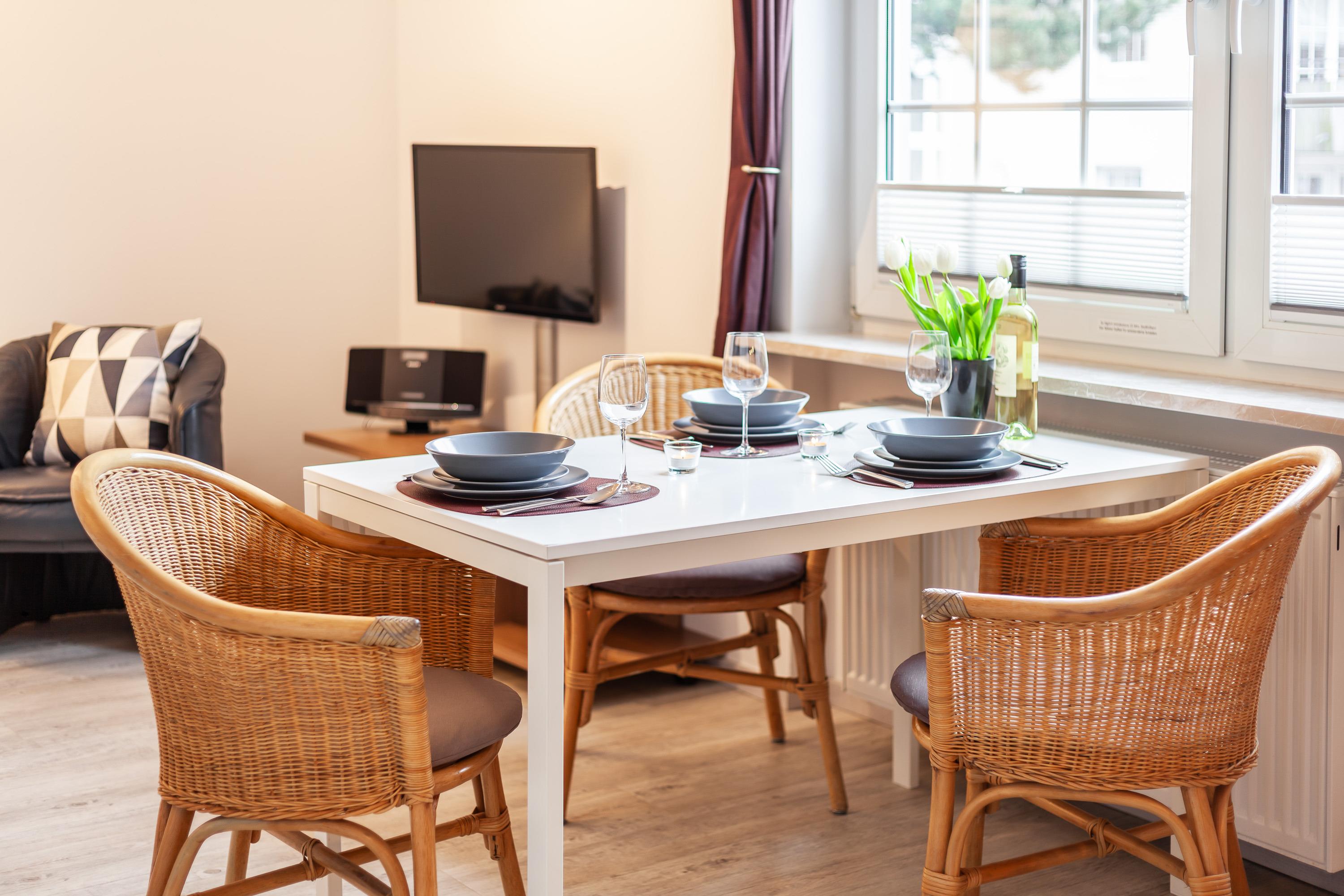 Das "Appartement 03" im Gästehaus Daheim ist eine 37 m² große sonnige Ferienwohnung, die Platz für maximal 3 Personen (zzgl. max. 1 Babybett) bietet. Sie befindet sich im Hochparterre und ist daher besonders für Gäste geeignet, die nur wenige Treppen steigen möchten. Die Wohnung verfügt über ein Schlafzimmer und ein Wohnzimmer. Ein Parkplatz steht direkt am Haus kostenfrei zur Verfügung.