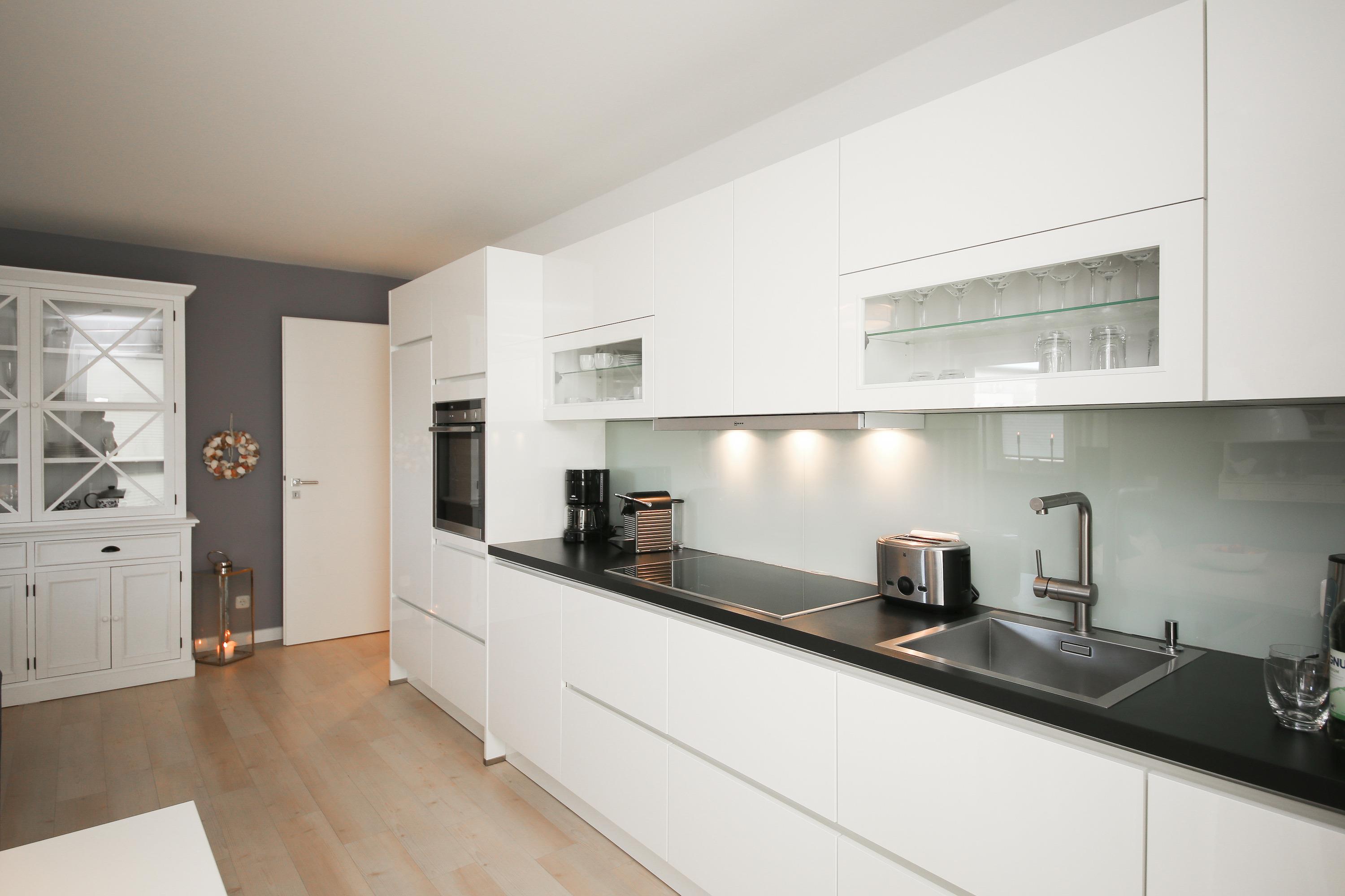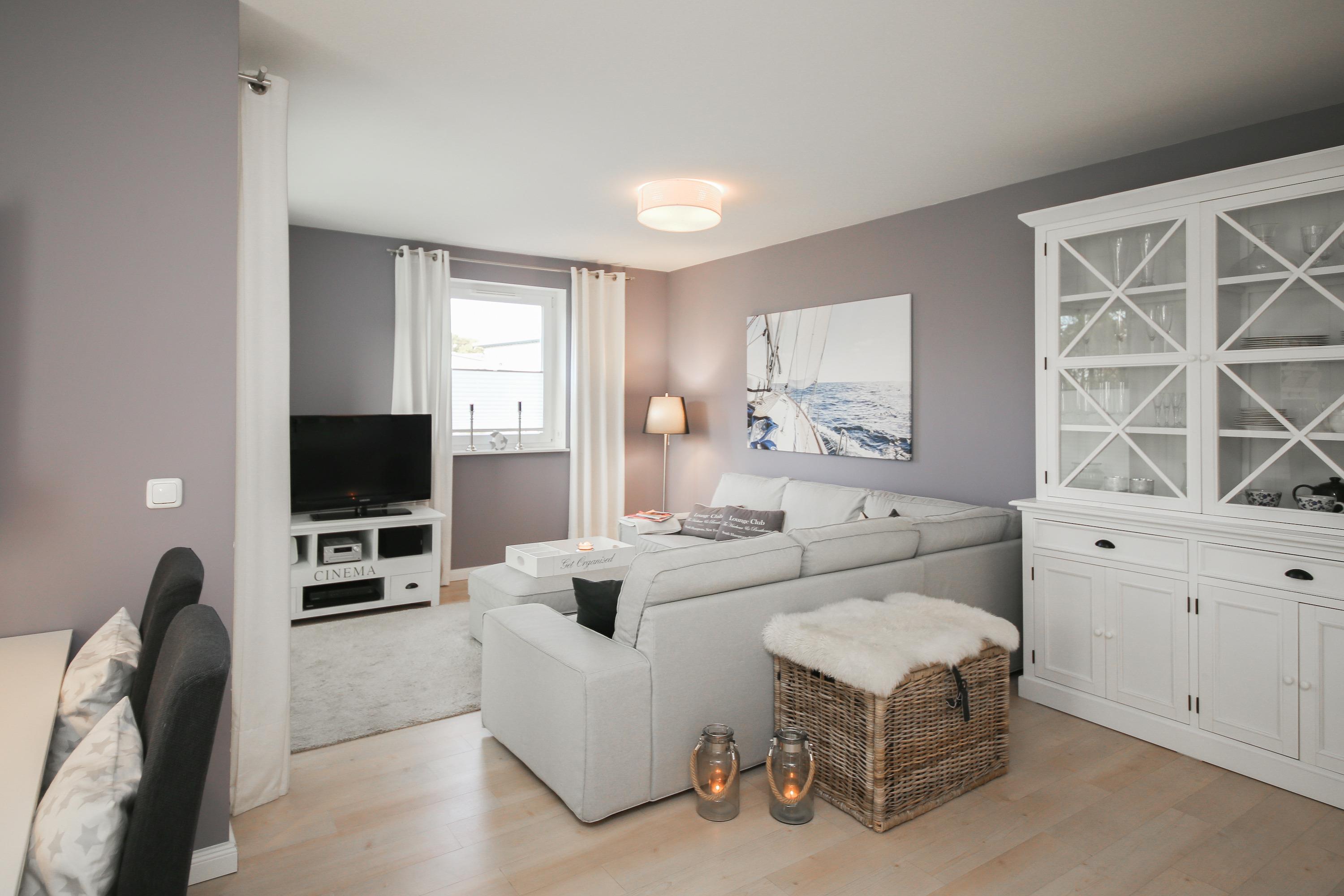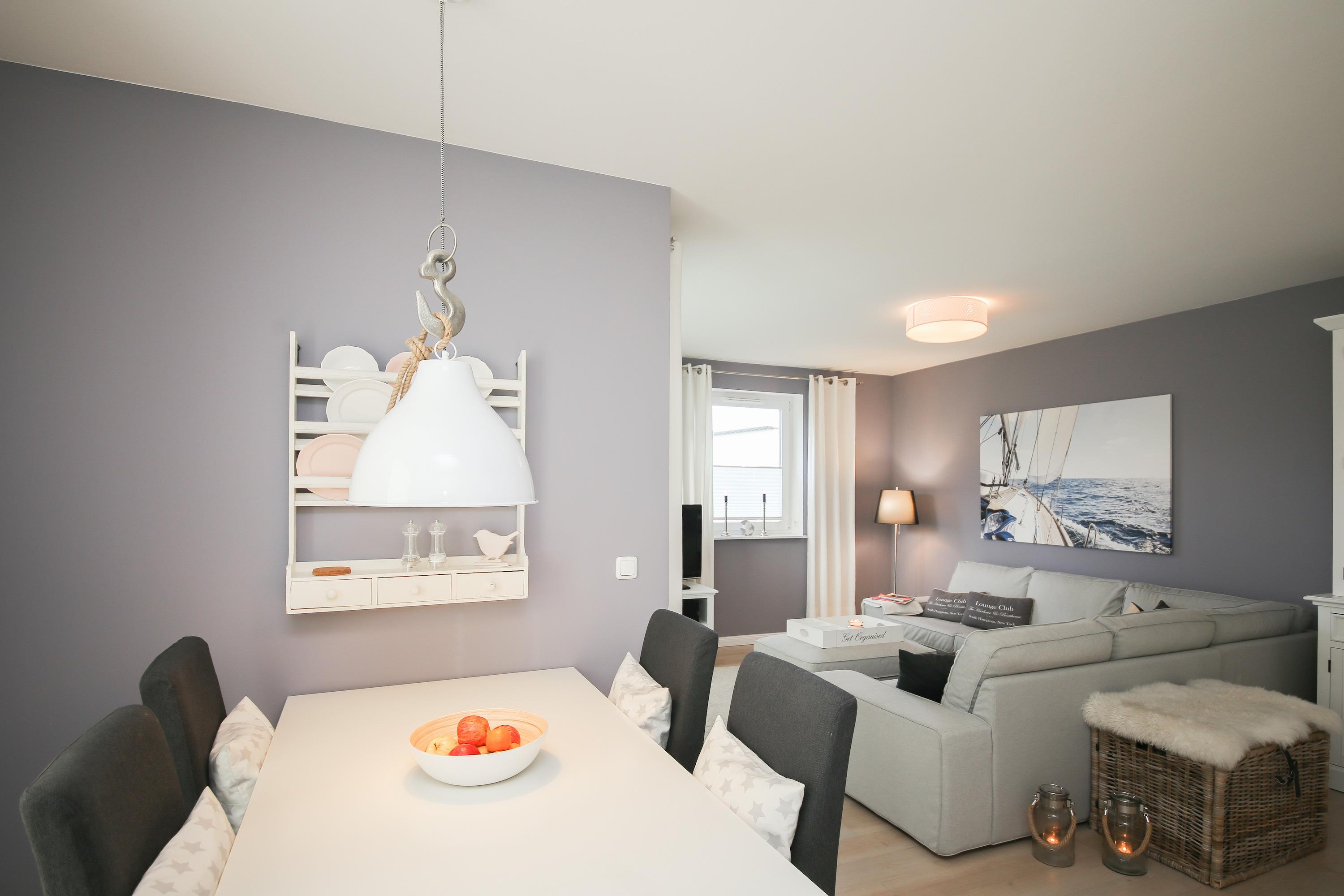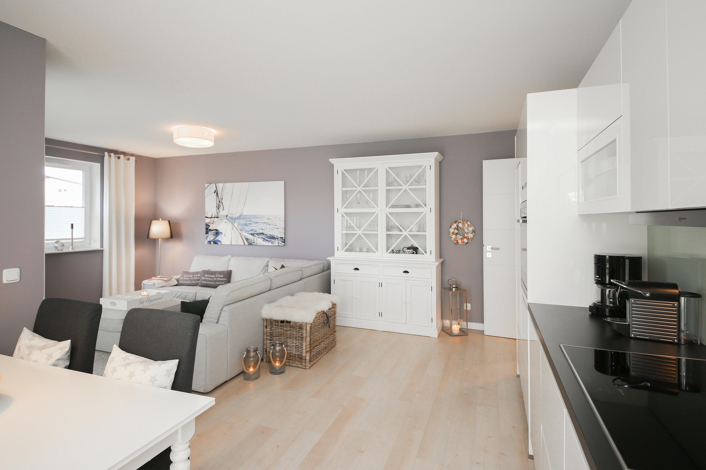 Es erwartet Sie eine wunderschöne Ferienwohnung in warmen Farben im Hampton Style, die Gemütlichkeit und Wohlbefinden vermitteln. Natürliche Materialien und ein durchdachtes Raumkonzept schaffen eine ganz besondere Atmosphäre um wohl verdiente Urlaubstage zu genießen. Herzstück der Wohnung bildet der großzügige Essbereich für 4 Personen mit offener Einbauküche in bester Ausstattung zum geselligen Beisammensein und gemeinsamen Kochen. Von hier aus gelangen Sie auf den möblierten und westlich ausgerichteten Balkon mit einem schönen Blick ins Grüne. Der Wohnbereich verfügt über eine gemütlich Eckcouch, Flat TV und eine Stereoanlage.
