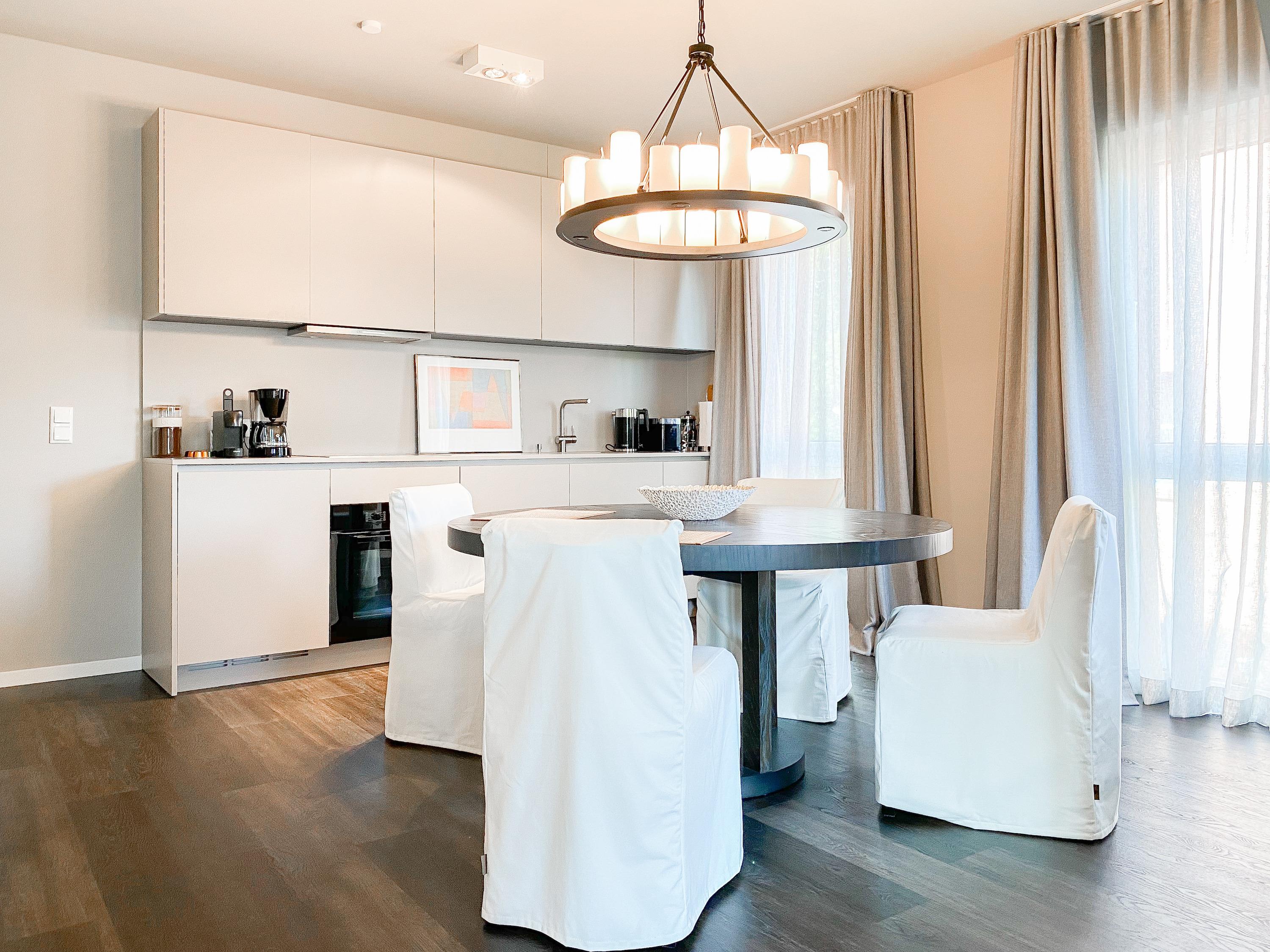Die äußerst hochwertige Ausstattung und stilvolle Einrichtung dieser Wohnung bietet zeitgemäßen Luxus auf fast 70 qm Wohnfläche für 2 Personen. Für Wellness Liebhaber wurde die Wohnung mit einer Infrarot Wärmekabine ausgestattet, besonders angenehm bei Verspannungen, zur Entschlackung oder einfach nur zur Entspannung. Mittelpunkt der Wohnung bildet der großzügige Wohnbereich mit wunderschönem Blick auf die Ostsee, der mit einem gemütlichen Sofa, Lesesessel und TV ausgestattet ist. Der anschließende Essbereich mit offener Designküche bietet ausreichend Platz für 4 Personen und ein Bioetanolkamin sorgt für eine gemütliche Atmosphäre. Das Schlafzimmer verfügt über ein Boxspringdoppelbett (180x200), Verdunkelungsvorhänge, TV und einen vorgelagerten Balkon in Südausrichtung, der mit Gartenmöbeln und einem Strandkorb ausgestattet ist. Im Flur befindet sich ein großer Einbauschrank mit ausreichend Stauraum für Ihre Urlaubsgarderobe. Das Bad ist hochwertig und modern mit Walk In Dusche und integriertem Waschtrockner. Kostenloser Internetzugang ist über WLAN gegeben.