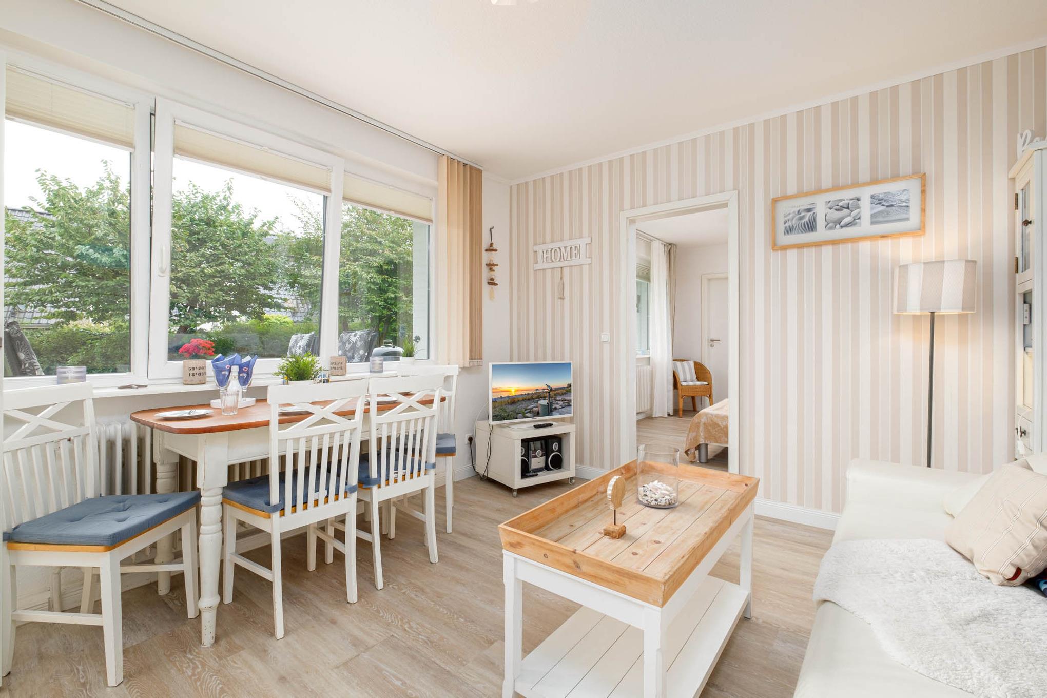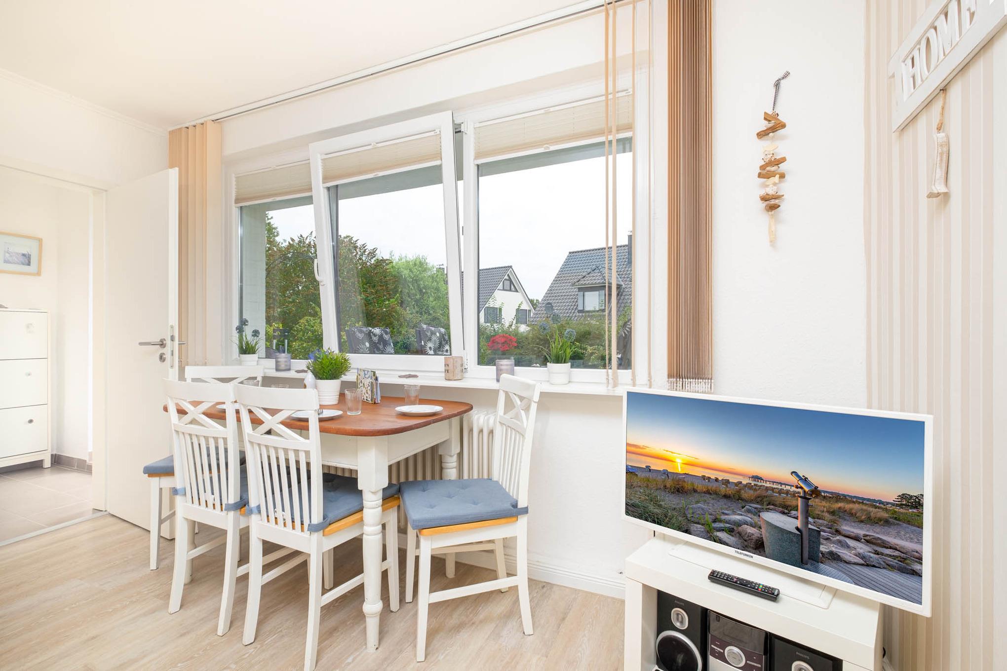Vom Flur aus erreichen Sie das gemütlich eingerichtete Wohnzimmer mit Essecke, Fernseher und Musikanlage. Die offene Küche der Ferienwohnung Scharbeutz erreichen Sie von hier aus. Sie ist mit allen gängigen Geräten ausgestattet u.a. Backofen, Kühlschrank mit Gefrierfach, Ceranfeld, Geschirrspüler und Filterkaffeemaschine ausgestattet.