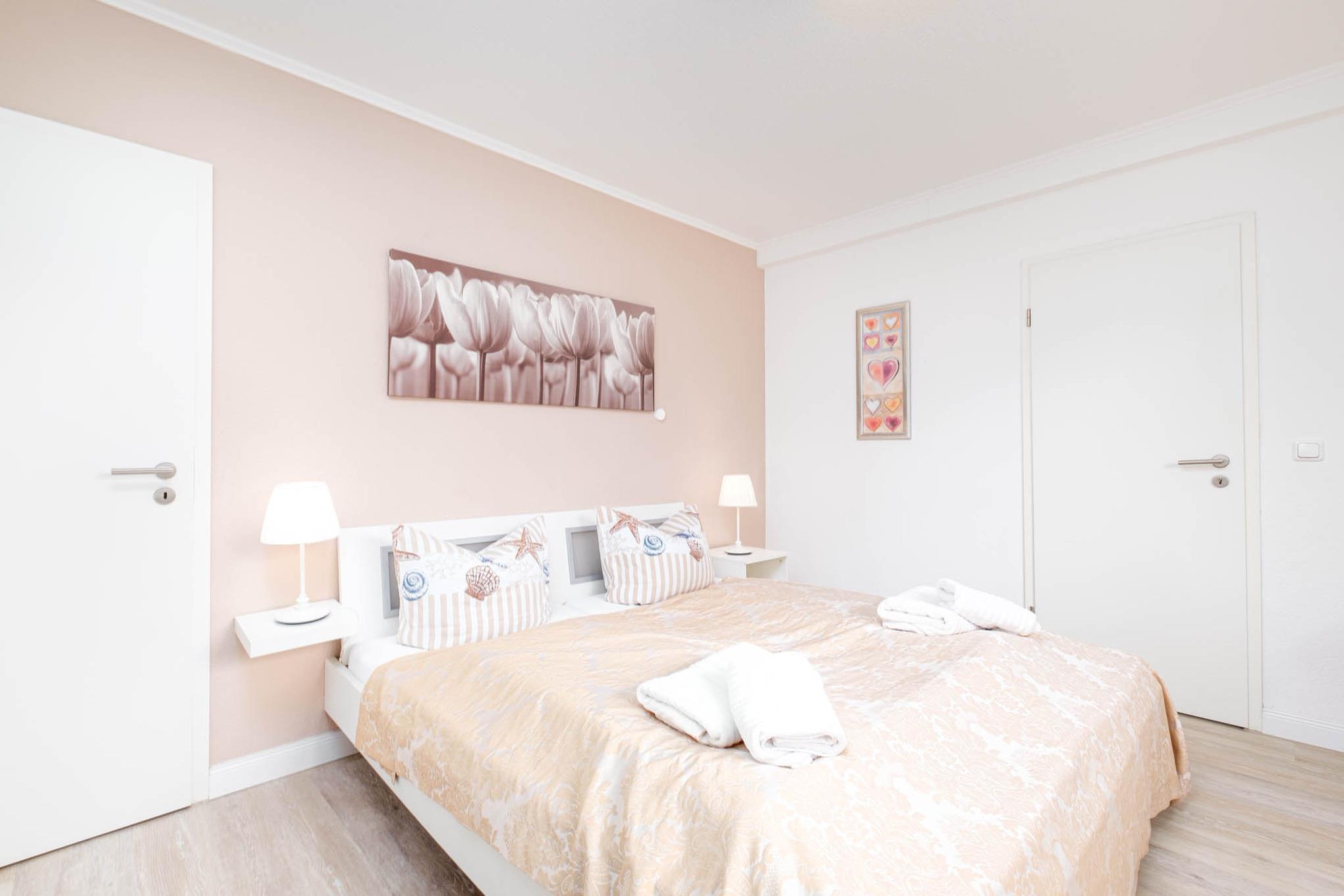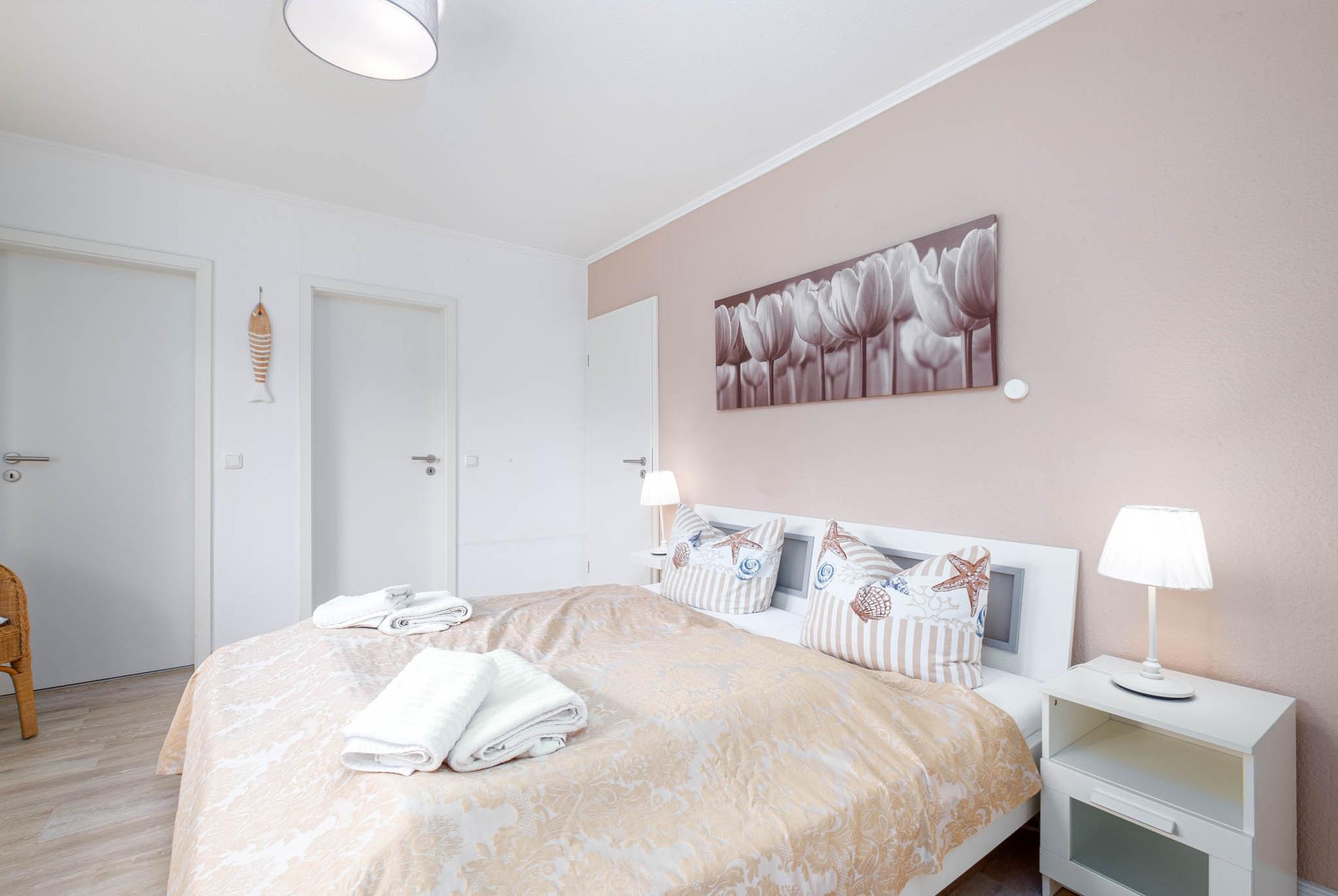 Ebenfalls aus vom Wohnzimmer aus erreichen Sie das Schlafzimmer mit gemütlichen Doppelbett (180x200cm). Verdunkelnde Vorhänge sorgen hier für erholsamen Schlaf.