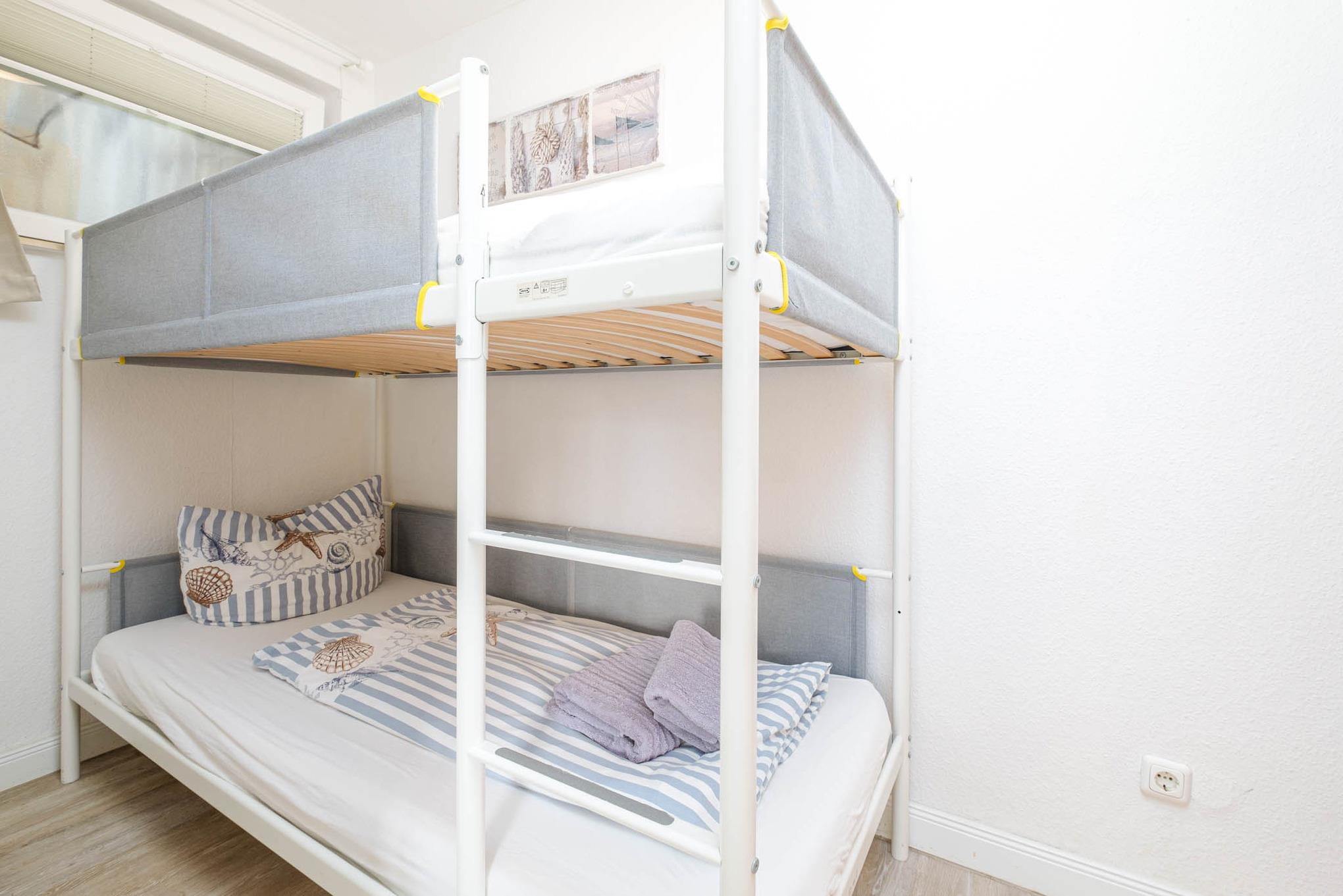 Durch das Schlafzimmer 1 erreichen Sie das zweite Schlafzimmer mit Etagenbett (2x 90x200cm), das kleine Fenster ist mit einem Plissee und Milchglas ausgestattet. Im Kleiderschrank findet Ihre Urlaubsgarderobe Platz.