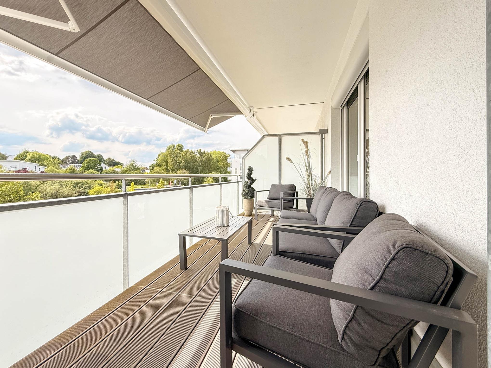 Der Balkon in Süd-West Lage ist mit hochwertigen Lounge-Möbeln ausgestattet und bietet die Möglichkeit rund um die Uhr Sonne zu tanken und zu entspannen. Eine elektrische Markise steht ebenso bereit.