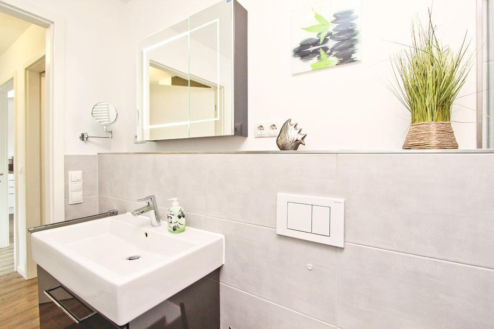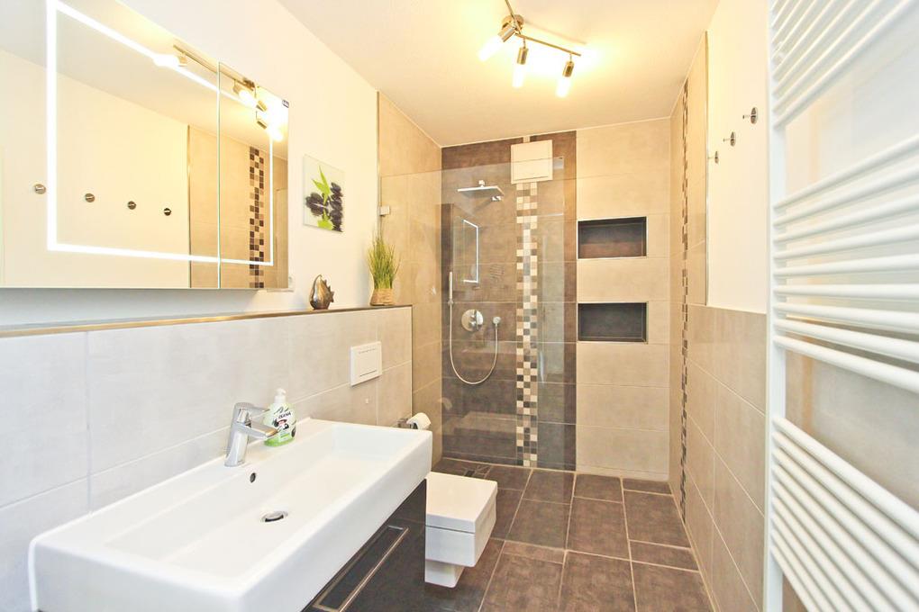 Das hochwertige Badezimmer verfügt über eine bodengleiche Regendusche mit zusätzlicher Handbrause sowie einen großen beleuchteten Spiegel. Neben der Fußbodenheizung ist hier ein zusätzlicher Handtuchheizkörper installiert.