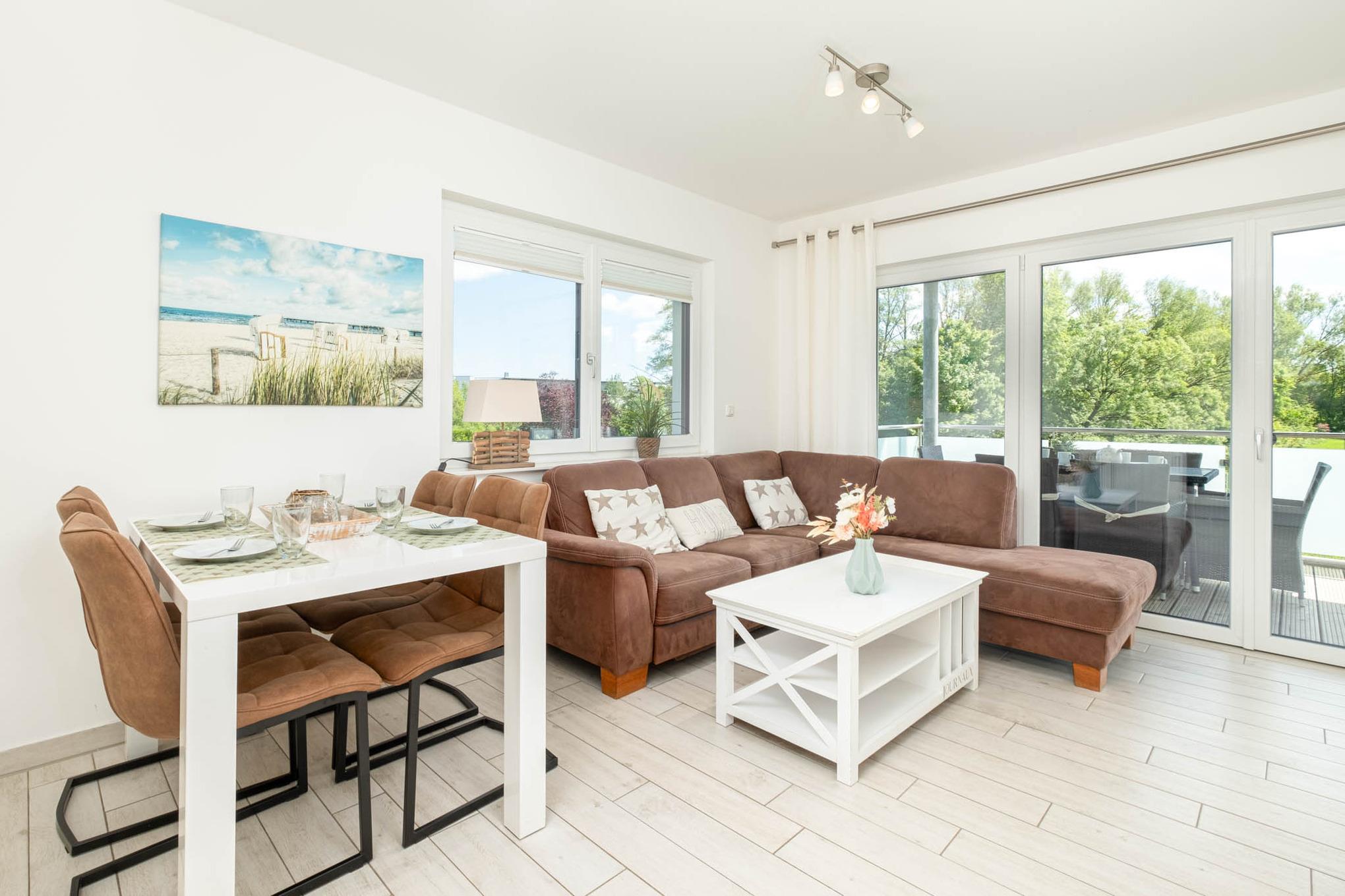 Dieses wunderschöne und neue 3-Zimmer-Appartement Strandzeit #4 verfügt über 2 separate Schlafzimmer und bietet Platz für maximal 4 Personen. Das Wohnzimmer ist mit einem Flatscreen-TV, der gemütlichen Couchgarnitur, einem Essbereich sowie der Küche mit den modernsten Geräten, wie Backofen, Ceranfeld, Geschirrspüler und Mikrowelle ausgestattet.