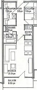 Das Appartement hat zwei Schlafzimmer, davon eines mit einem Doppelbett (1,80 x 2m/Einzelmatratzen), Nachttischen und einen Kleiderschrank. In dem anderen Schlafzimmer befinden sich zwei Einzelbetten (je 90 x 1,90) und ein kleiner Schreibtisch.