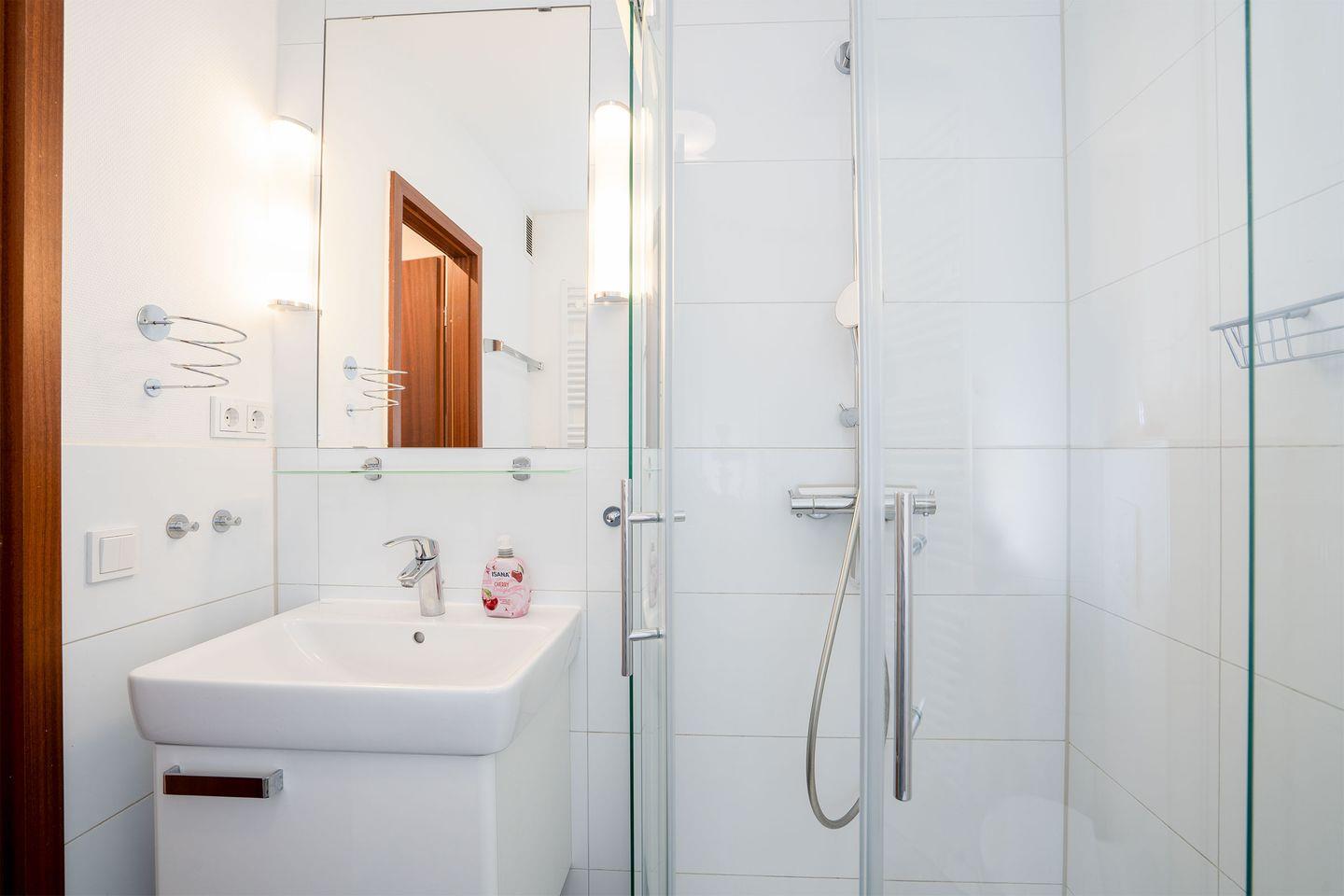 Das moderne Badezimmer verfügt über eine Regendusche, Waschtisch, Föhn, Handtuchtrockner und WC.