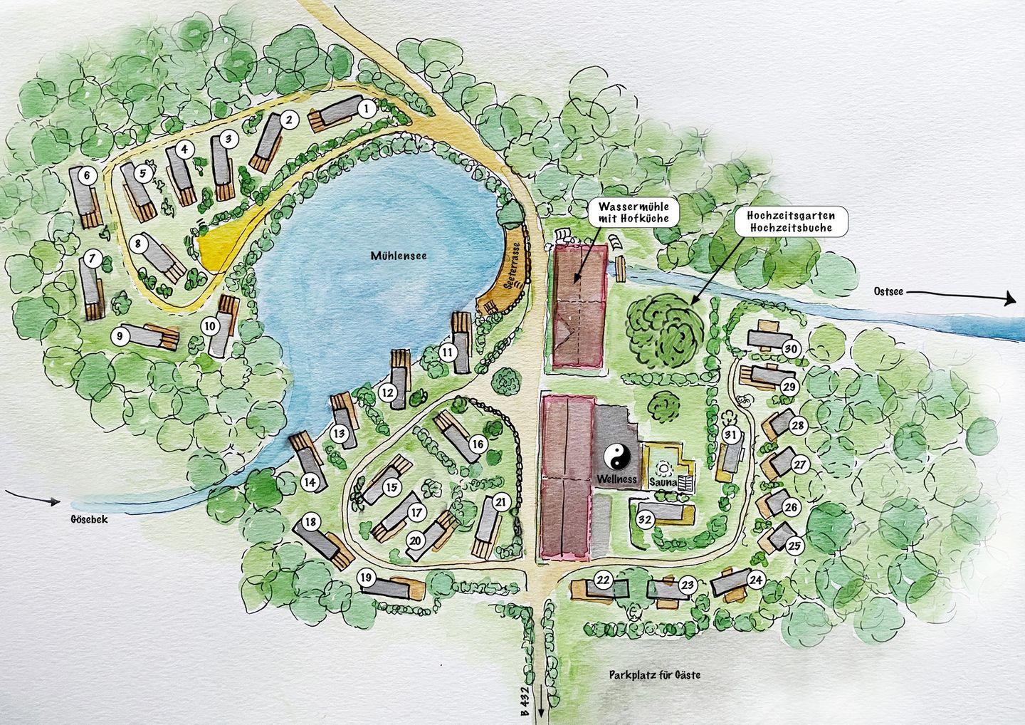 Im komfortablen Haus 29 vereinen sich optimale Raumaufteilung mit Komfort und Ausstattung auf höchstem Niveau. Das Haus mit 2 Schlafzimmern und 2 Bädern bietet der Familie optimalen Komfort und wahrt die Privatsphäre von jedermann. Mit dem luxuriösem Elternschlafzimmer mit angrenzendem Bad, dem Kinderzimmer- oder Gästezimmer mit viel raffiniertem Stauraum und dem hellen Wohnraum mit Mittelinsel garantiert Haus 29 einen Premium-Urlaub. Sie wohnen hier im Ambiente einer denkmalgeschützten, sanierten Wassermühle mit Restaurant und Weinbar. Nutzen Sie auch den Spa-Bereich mit Whirlpool und Sauna oder buchen Sie sich eine unserer zahlreichen Anwendungen dazu. Wer Baden möchte, hat in der Umgebung reichlich Gelegenheit, denn es gibt mehrere Badeseen in der Nähe, es ist nur 1 km zu einer Badeanstalt und die Ostsee ist auch nur 2,8 km entfernt. Am Strand stehen einige kostenlose Parkplätze zur Verfügung.