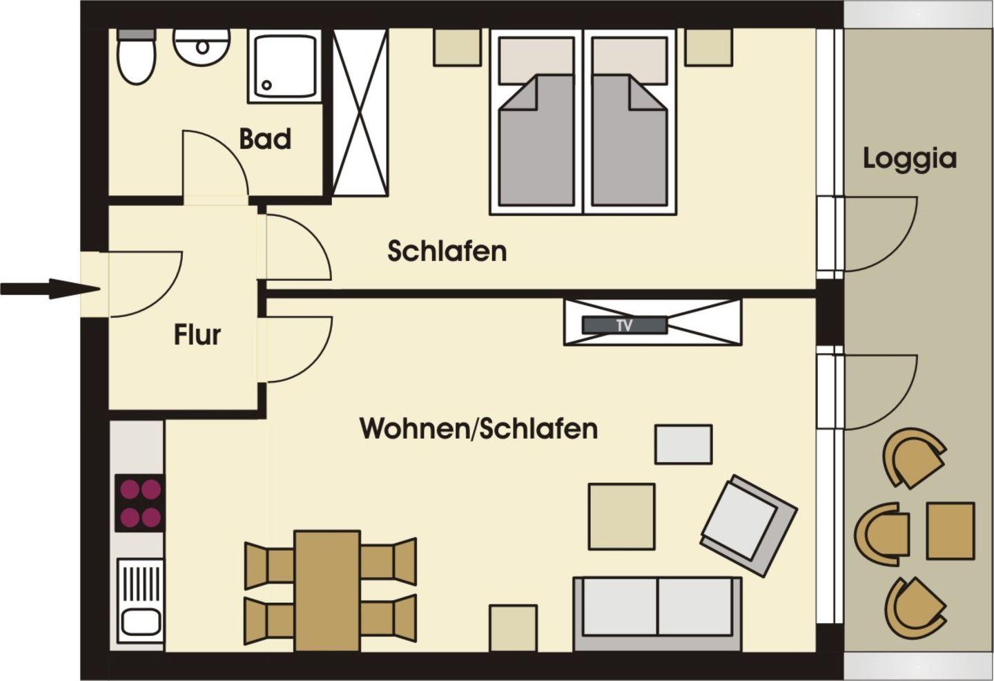 * Wohn-/ Schlafzimmer mit komfortabler Schlafcouch für 2 Personen * offene Einbauküche mit Geschirrspüler und Essplatz für 4 Personen * Schlafzimmer mit Doppelbett und geräumigen Kleiderschrank * TV * modernes Duschbad * Loggia mit Tisch und Sitzmöbeln