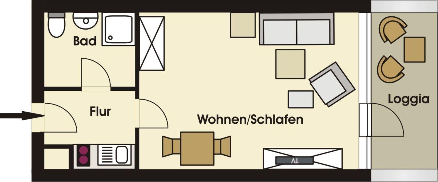 * Wohn-/ Schlafzimmer mit komfortabler Schlafcouch für 2 Personen * Essplatz für 2 Personen * Pantry vom Flur abgehend mit Geschirrspüler * TV * modernes Duschbad mit Glasabtrennung * Loggia mit Tisch und Sitzmöbeln